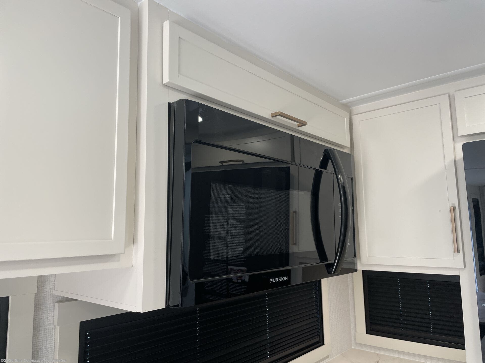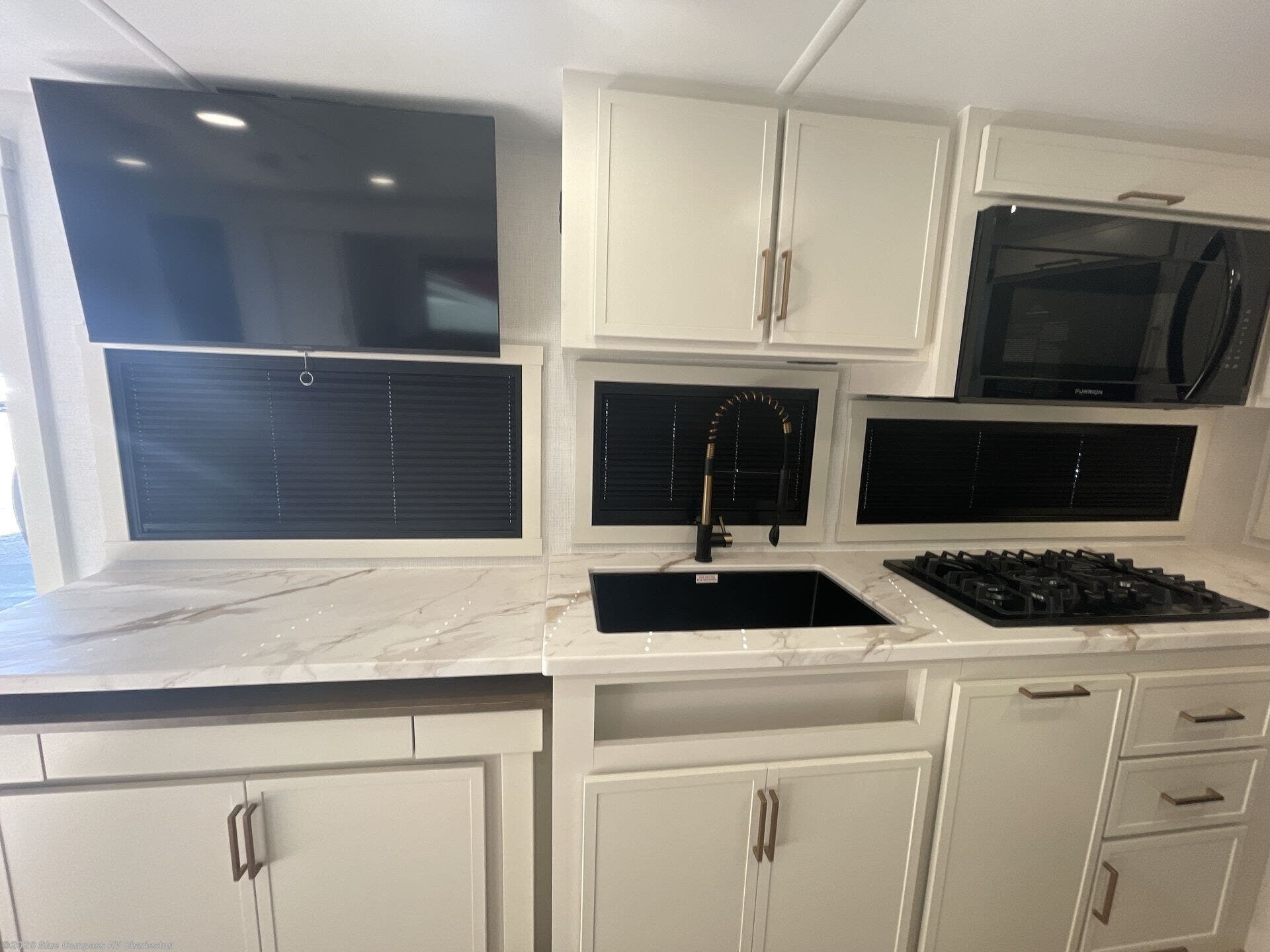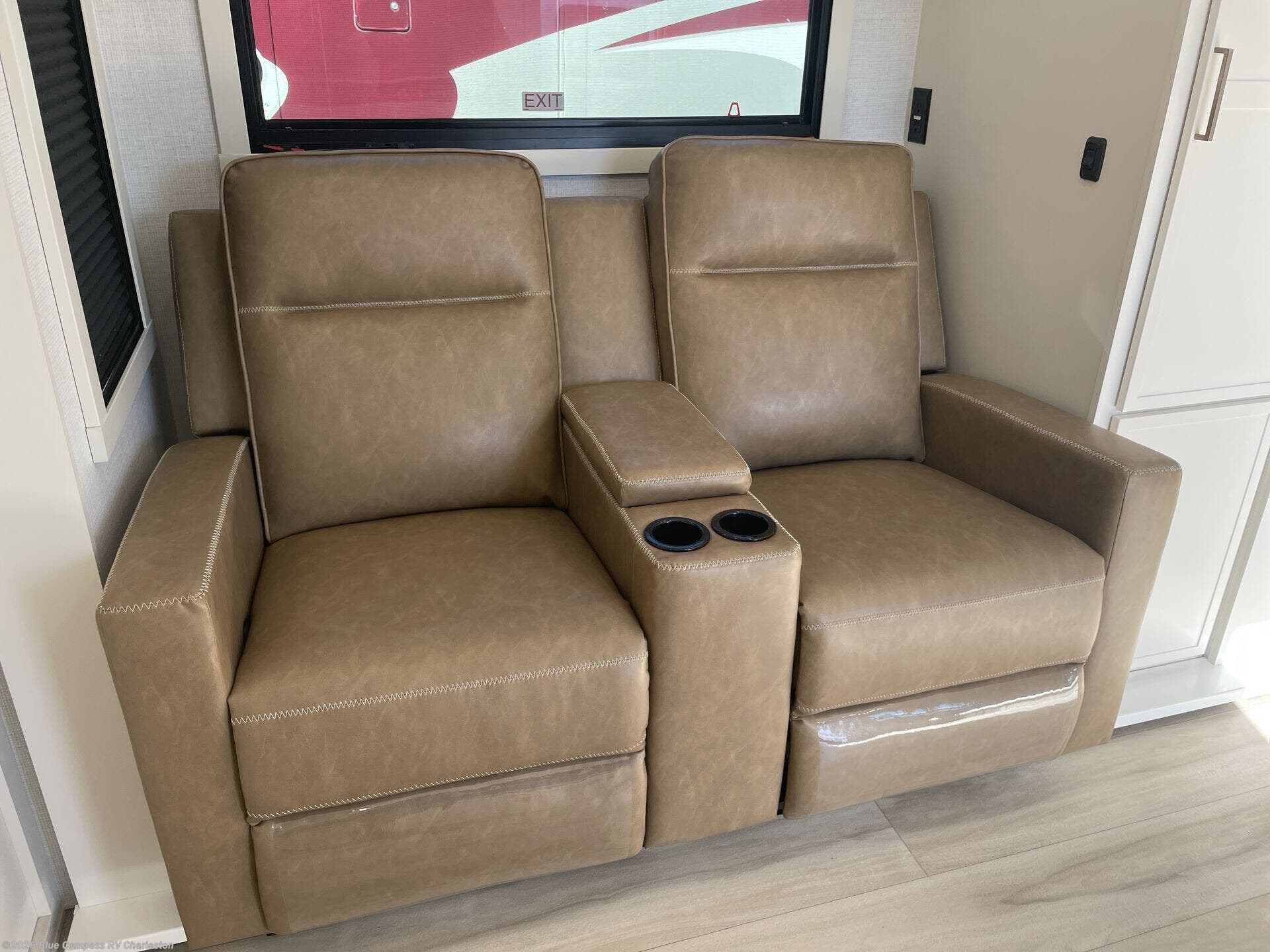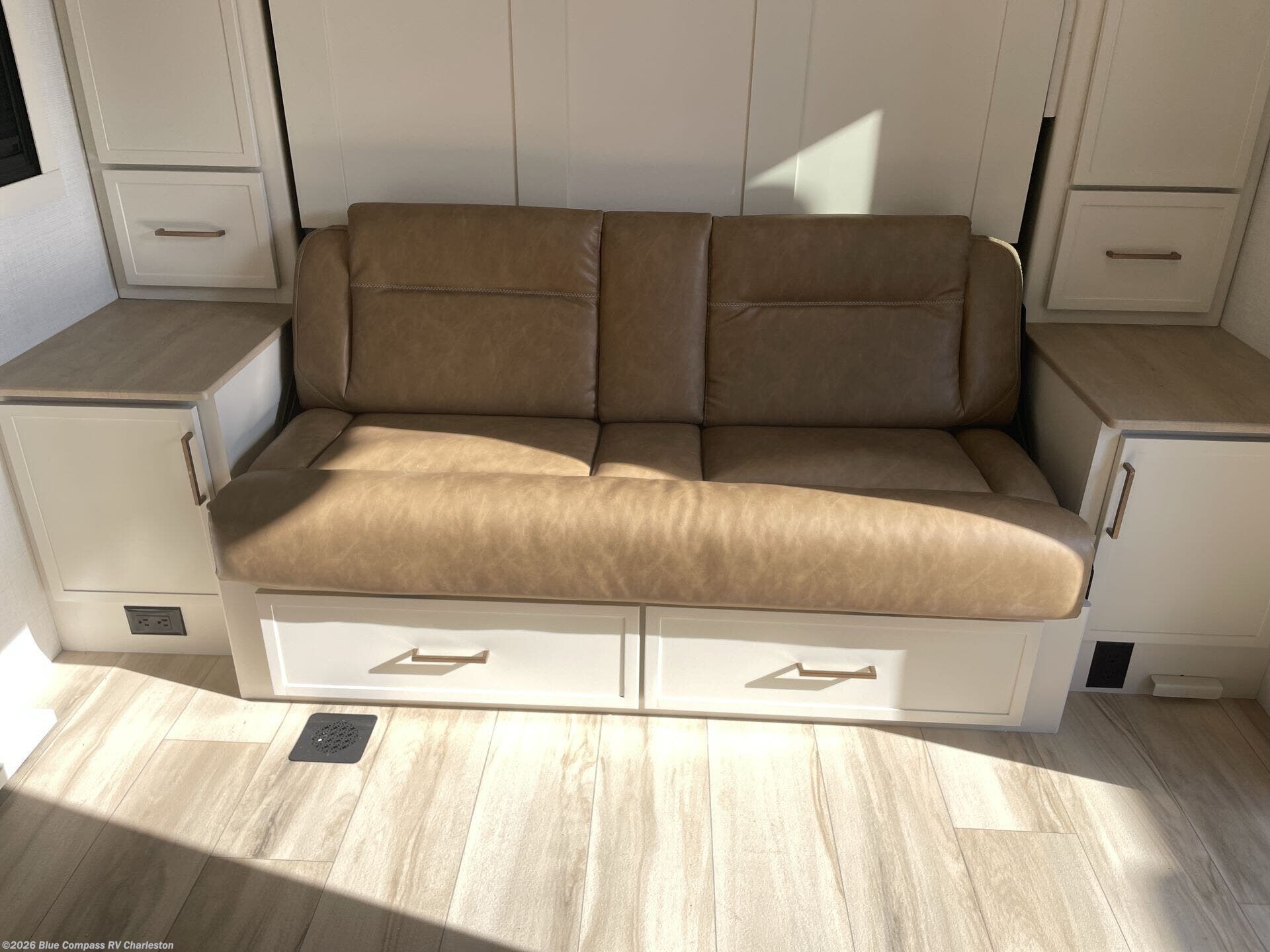 This is the perfect travel trailer for the couple looking for comfort at the campground! Once you've unloaded the pass-thru storage, you can put out the 16' patio awning and relax in your camp chairs. Head inside to make lunch in the fully equipped kitchen that includes a three-burner range, 30" convection microwave, and dishwasher prep. There is a pantry with outlets within the large slide out, along with a 10-cu. ft. refrigerator, plus theater seating across from the TV. And if you need sleeping space for guests, just choose the optional tri-fold sofa in place of the theater seating! You'll appreciate the front sofa plus a Feather-Lift bed system, providing seating space during the day and sleeping space at night! A pull-out table with a drawer provides a place to dine together, and a full bath on board will let you freshen up each day.