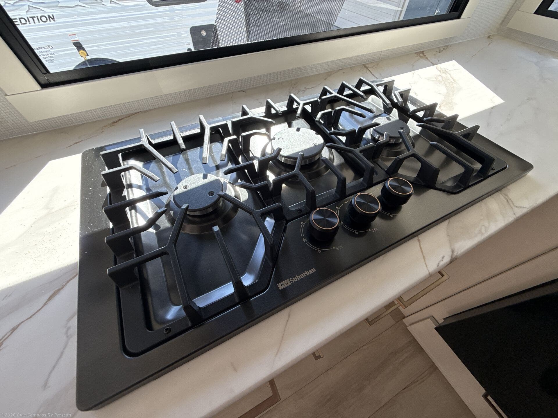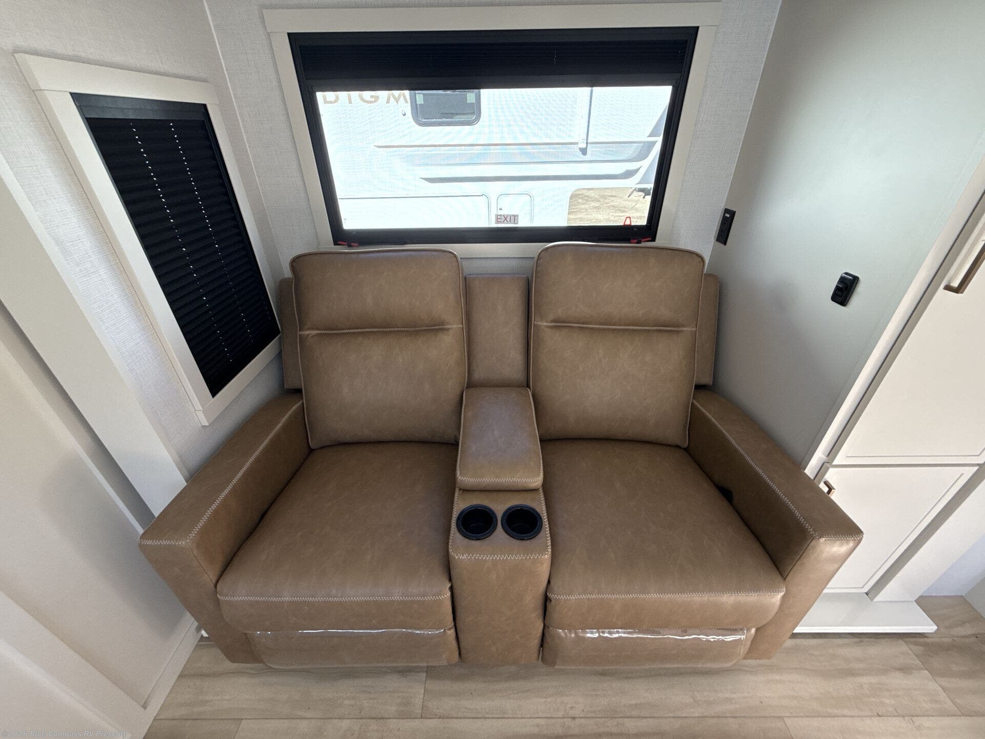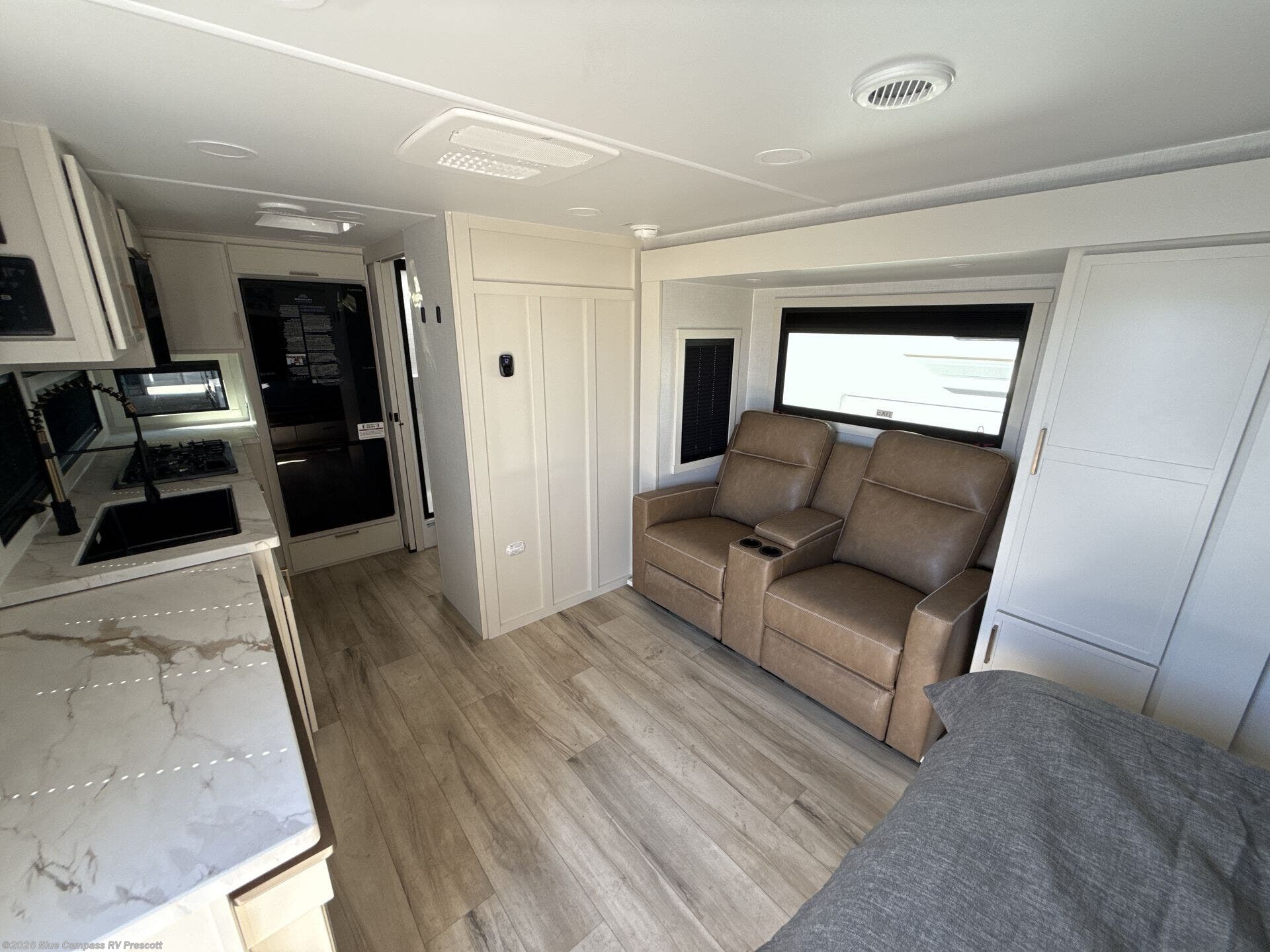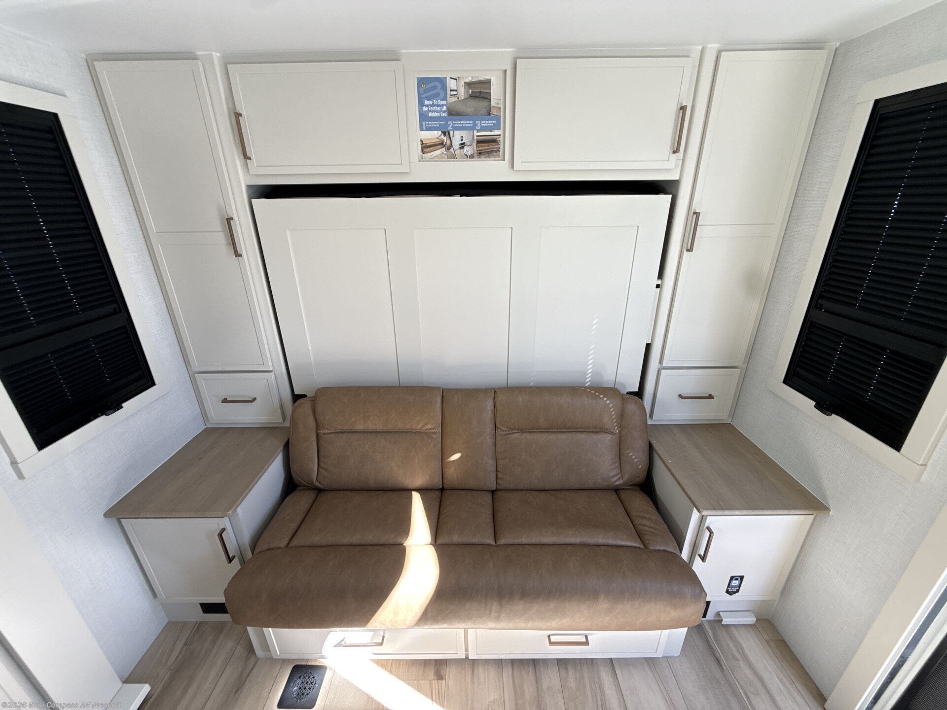 This is the perfect travel trailer for the couple looking for comfort at the campground! Once you've unloaded the pass-thru storage, you can put out the 16' patio awning and relax in your camp chairs. Head inside to make lunch in the fully equipped kitchen that includes a three-burner range, 30" convection microwave, and dishwasher prep. There is a pantry with outlets within the large slide out, along with a 10-cu. ft. refrigerator, plus theater seating across from the TV. And if you need sleeping space for guests, just choose the optional tri-fold sofa in place of the theater seating! You'll appreciate the front sofa plus a Feather-Lift bed system, providing seating space during the day and sleeping space at night! A pull-out table with a drawer provides a place to dine together, and a full bath on board will let you freshen up each day.