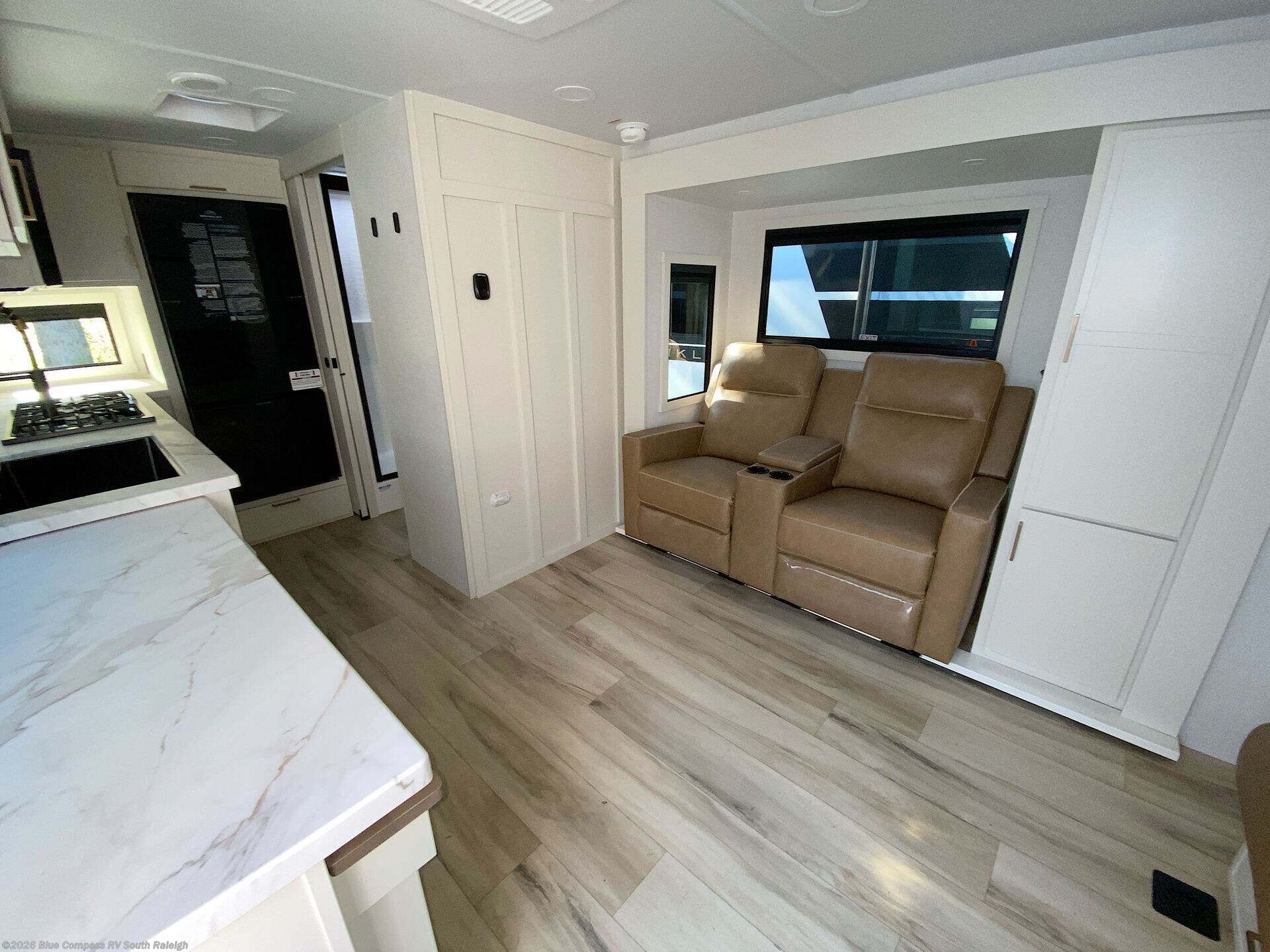 This is the perfect travel trailer for the couple looking for comfort at the campground! Once you've unloaded the pass-thru storage, you can put out the 16' patio awning and relax in your camp chairs. Head inside to make lunch in the fully equipped kitchen that includes a three-burner range, 30" convection microwave, and dishwasher prep. There is a pantry with outlets within the large slide out, along with a 10-cu. ft. refrigerator, plus theater seating across from the TV. And if you need sleeping space for guests, just choose the optional tri-fold sofa in place of the theater seating! You'll appreciate the front sofa plus a Feather-Lift bed system, providing seating space during the day and sleeping space at night! A pull-out table with a drawer provides a place to dine together, and a full bath on board will let you freshen up each day.