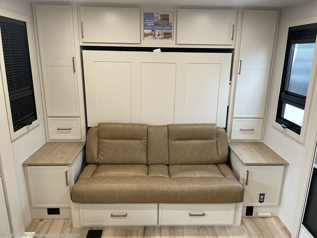This is the perfect travel trailer for the couple looking for comfort at the campground! Once you've unloaded the pass-thru storage, you can put out the 16' patio awning and relax in your camp chairs. Head inside to make lunch in the fully equipped kitchen that includes a three-burner range, 30" convection microwave, and dishwasher prep. There is a pantry with outlets within the large slide out, along with a 10-cu. ft. refrigerator, plus theater seating across from the TV. And if you need sleeping space for guests, just choose the optional tri-fold sofa in place of the theater seating! You'll appreciate the front sofa plus a Feather-Lift bed system, providing seating space during the day and sleeping space at night! A pull-out table with a drawer provides a place to dine together, and a full bath on board will let you freshen up each day.