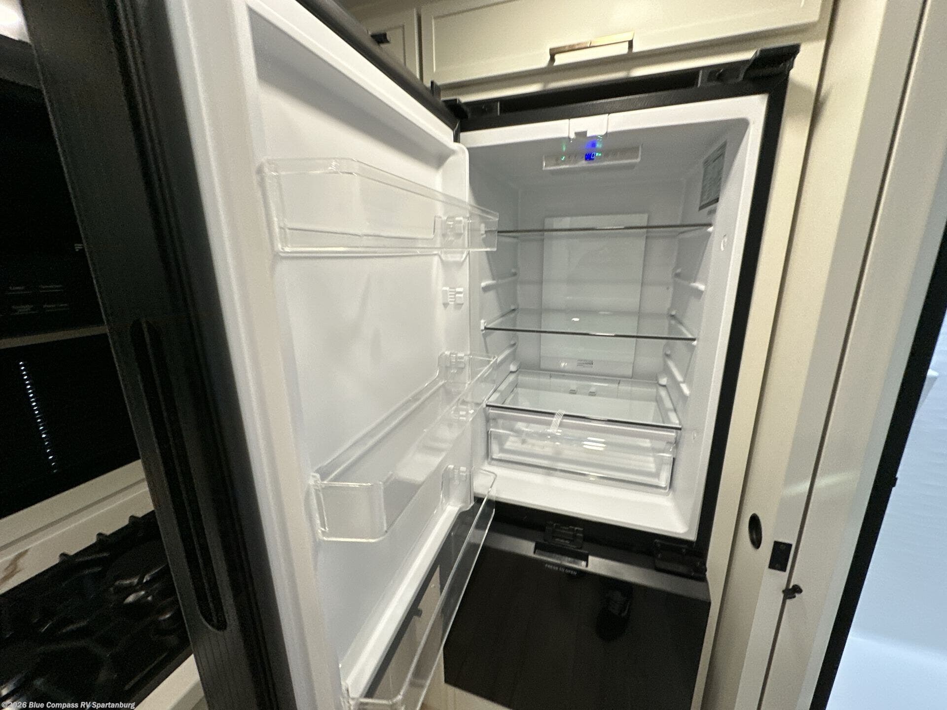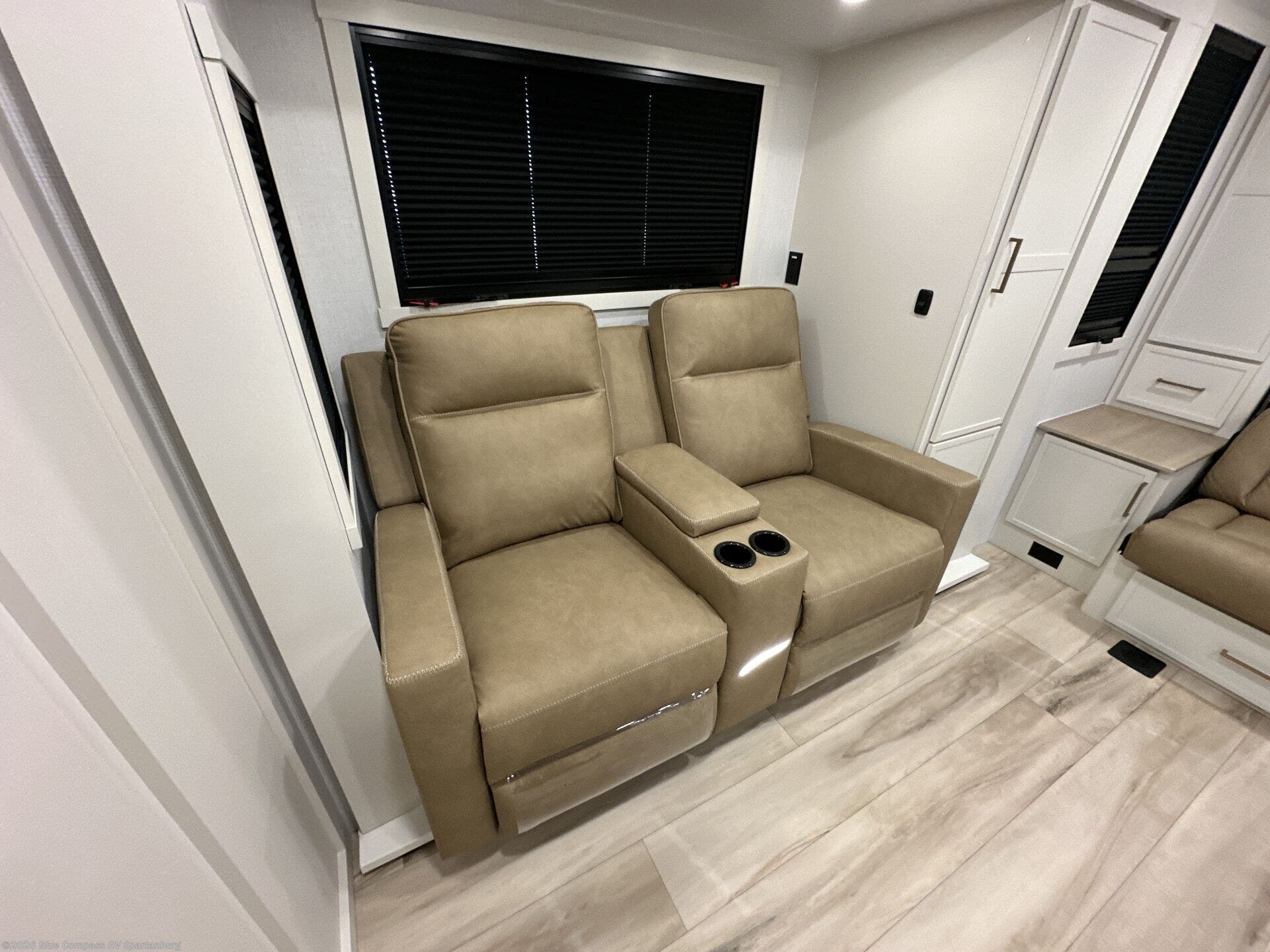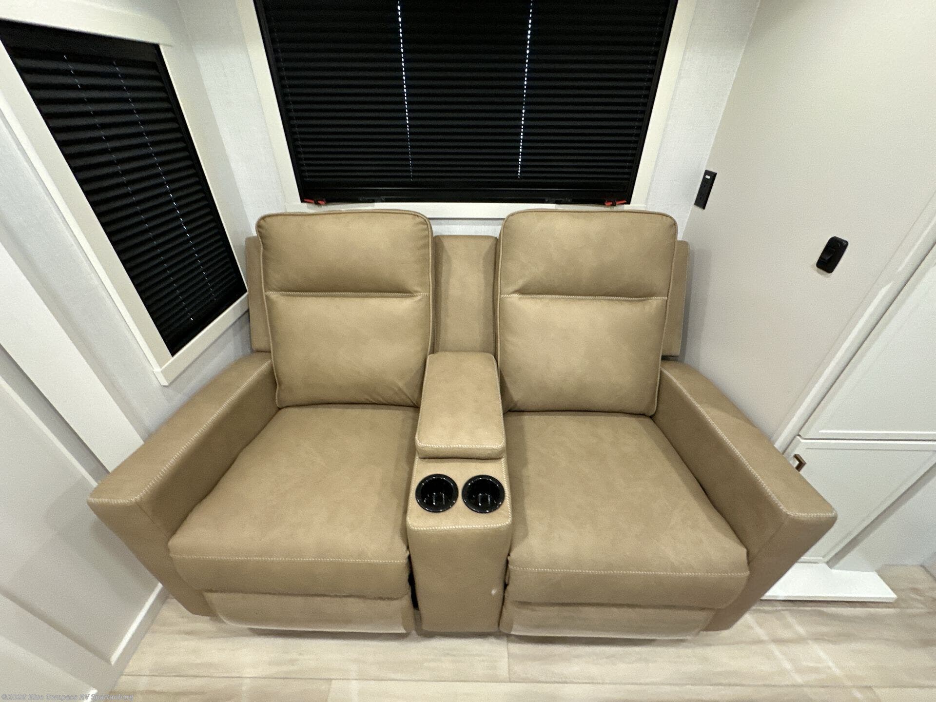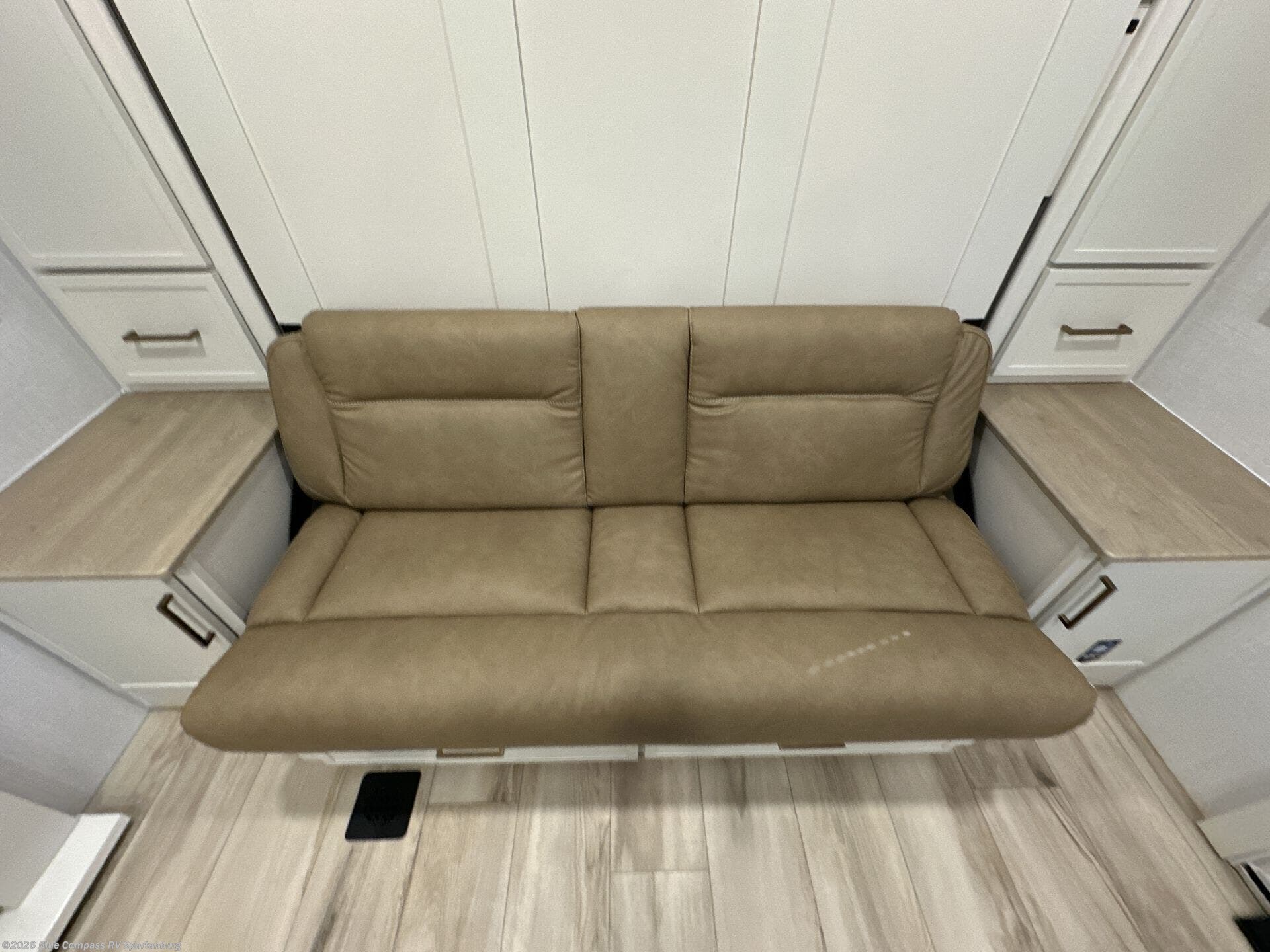 This is the perfect travel trailer for the couple looking for comfort at the campground! Once you've unloaded the pass-thru storage, you can put out the 16' patio awning and relax in your camp chairs. Head inside to make lunch in the fully equipped kitchen that includes a three-burner range, 30" convection microwave, and dishwasher prep. There is a pantry with outlets within the large slide out, along with a 10-cu. ft. refrigerator, plus theater seating across from the TV. And if you need sleeping space for guests, just choose the optional tri-fold sofa in place of the theater seating! You'll appreciate the front sofa plus a Feather-Lift bed system, providing seating space during the day and sleeping space at night! A pull-out table with a drawer provides a place to dine together, and a full bath on board will let you freshen up each day.