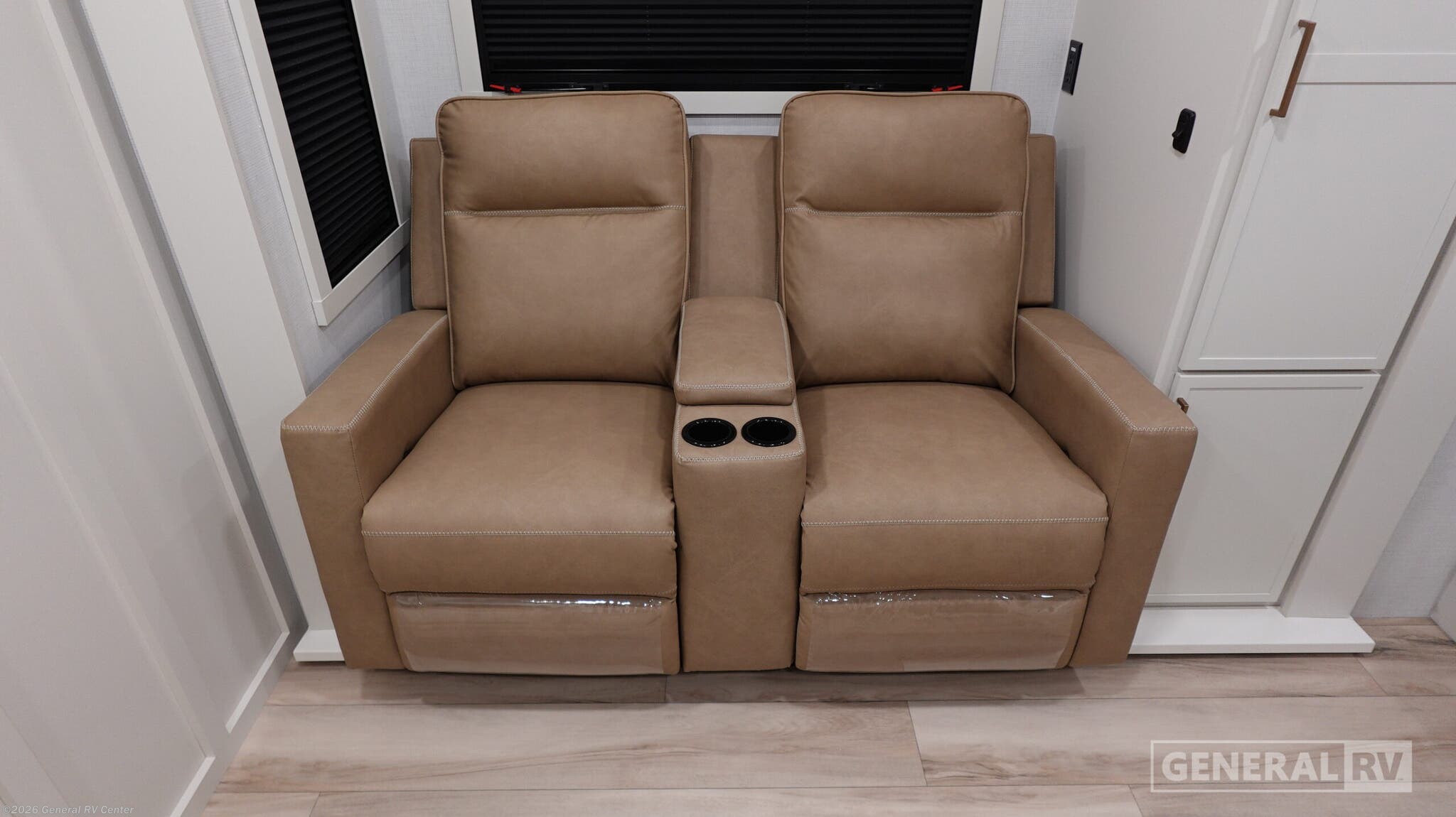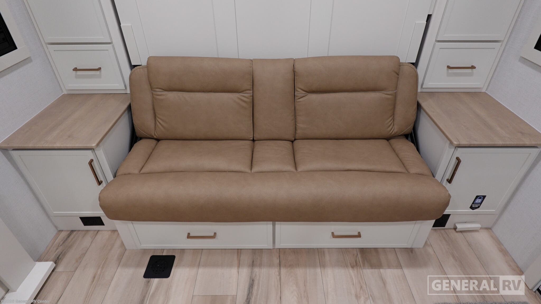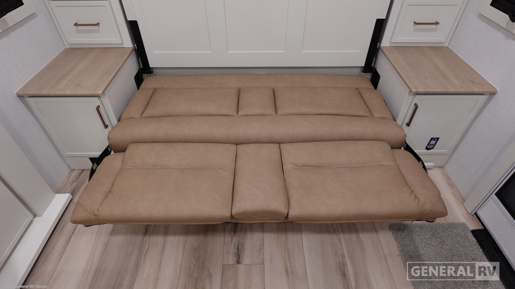 Brinkley Model Ix travel trailer 20x highlights: Front Hidden Bed System Exterior Pass-Thru Storage 36" x 30" Shower Pull-Out Dining Table This is the perfect travel trailer for the couple looking for comfort at the campground! Once you've unloaded the pass-thru storage, you can put out the 16' patio awning and relax in your camp chairs. Head inside to make lunch in the fully equipped kitchen that includes a three-burner range, 30" convection microwave, and dishwasher prep. There is a pantry with outlets within the large slide out, along with a 10-cu. ft. refrigerator, plus theater seating across from the TV. And if you need sleeping space for guests, just choose the optional tri-fold sofa in place of the theater seating! You'll appreciate the front sofa plus a Feather-Lift bed system, providing seating space during the day and sleeping space at night! A pull-out table with a drawer provides a place to dine together, and a full bath on board will let you freshen up each day. The Model Ix by Brinkley is your ticket to lightweight towing and exceptional features. This premium half-ton towable travel trailer features Brinkley's CraftSense building materials for a higher level of construction, along with a seamless laminated aluminum exterior with automotive grade full-body paint and modern graphics. You will stay powered up thanks to the power package with a 200-watt solar panel, and the Road Armor suspension will help provide a smooth tow from home to campground. The interior of the Model Ix includes premium residential cabinets with dovetail drawers, an ultra quiet and efficient A/C system, and a SoundCore Boom 2 Bluetooth waterproof speaker so you can listen to your favorite tunes indoors or outdoors!