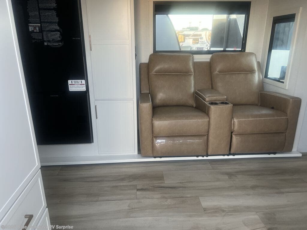 This is the perfect travel trailer for the couple looking for comfort at the campground! Once you've unloaded the pass-thru storage, you can put out the 17' patio awning and relax in your camp chairs. Head inside to make lunch in the fully-equipped kitchen that incudes a range, 30" convection microwave, and dishwasher prep. There is a pantry with outlets within the large slide out, along with a 10 cu. ft. refrigerator that you can access with the slide in, plus theater seating across from the TV. And if you need sleeping space for guests, just choose the optional tri-fold sofa in place of the theater seating! A pull-out table with a drawer provides a place to dine together, and the entryway closet will be perfect to keep jackets and shoes tidy. You'll get a great night's rest on the front queen bed with four drawers, nightstand cubbies, and a room divider for a little more privacy.