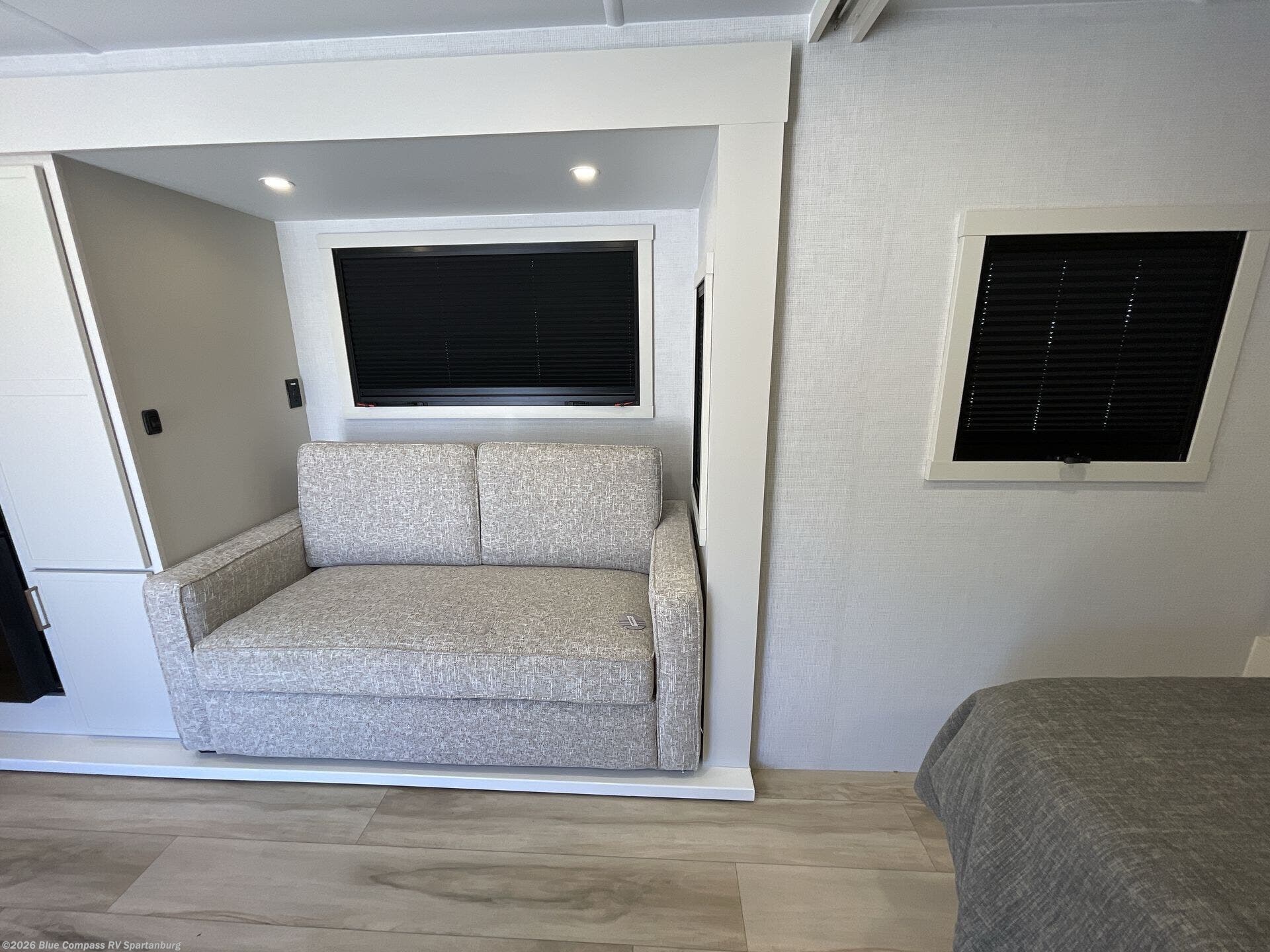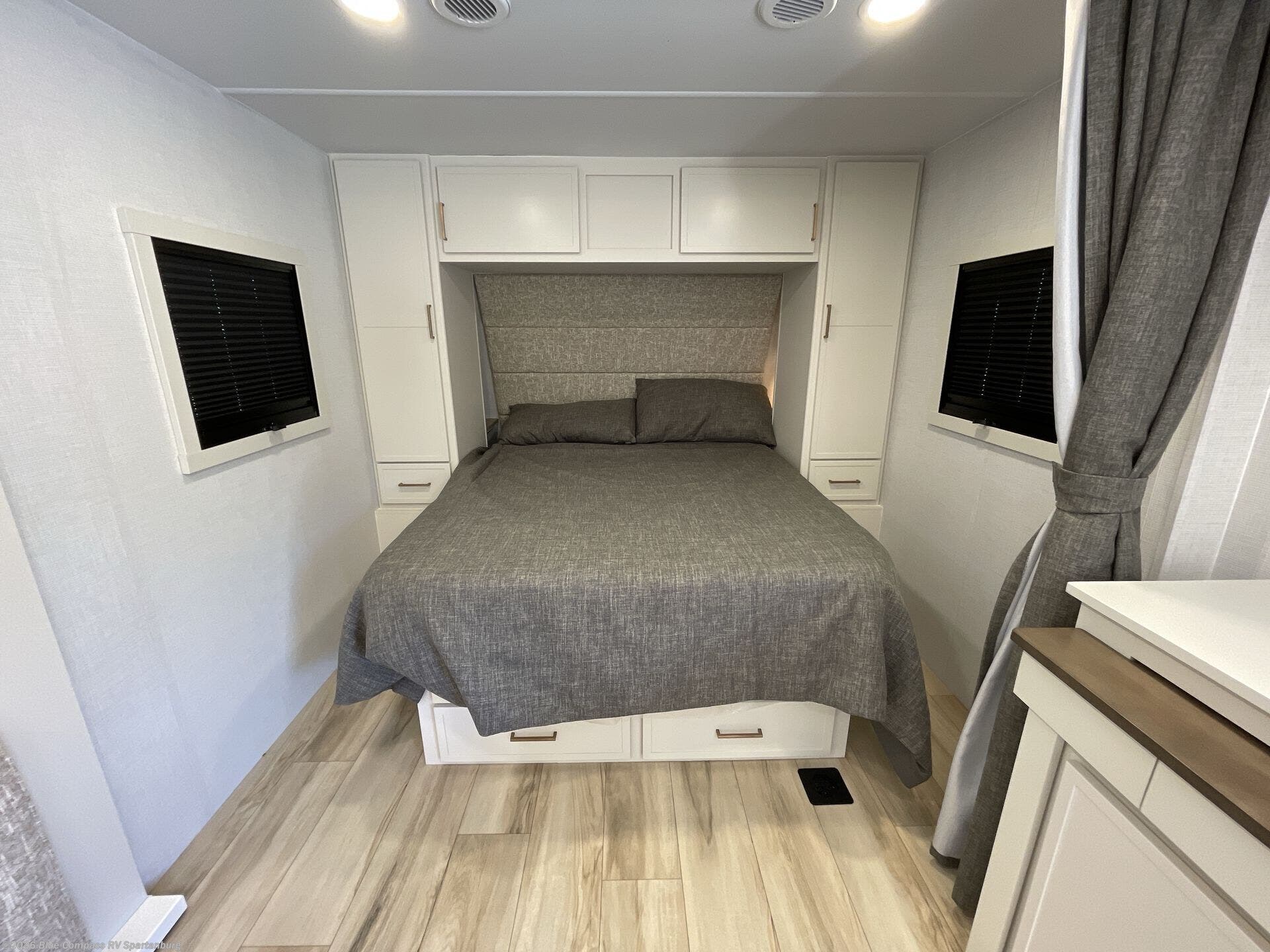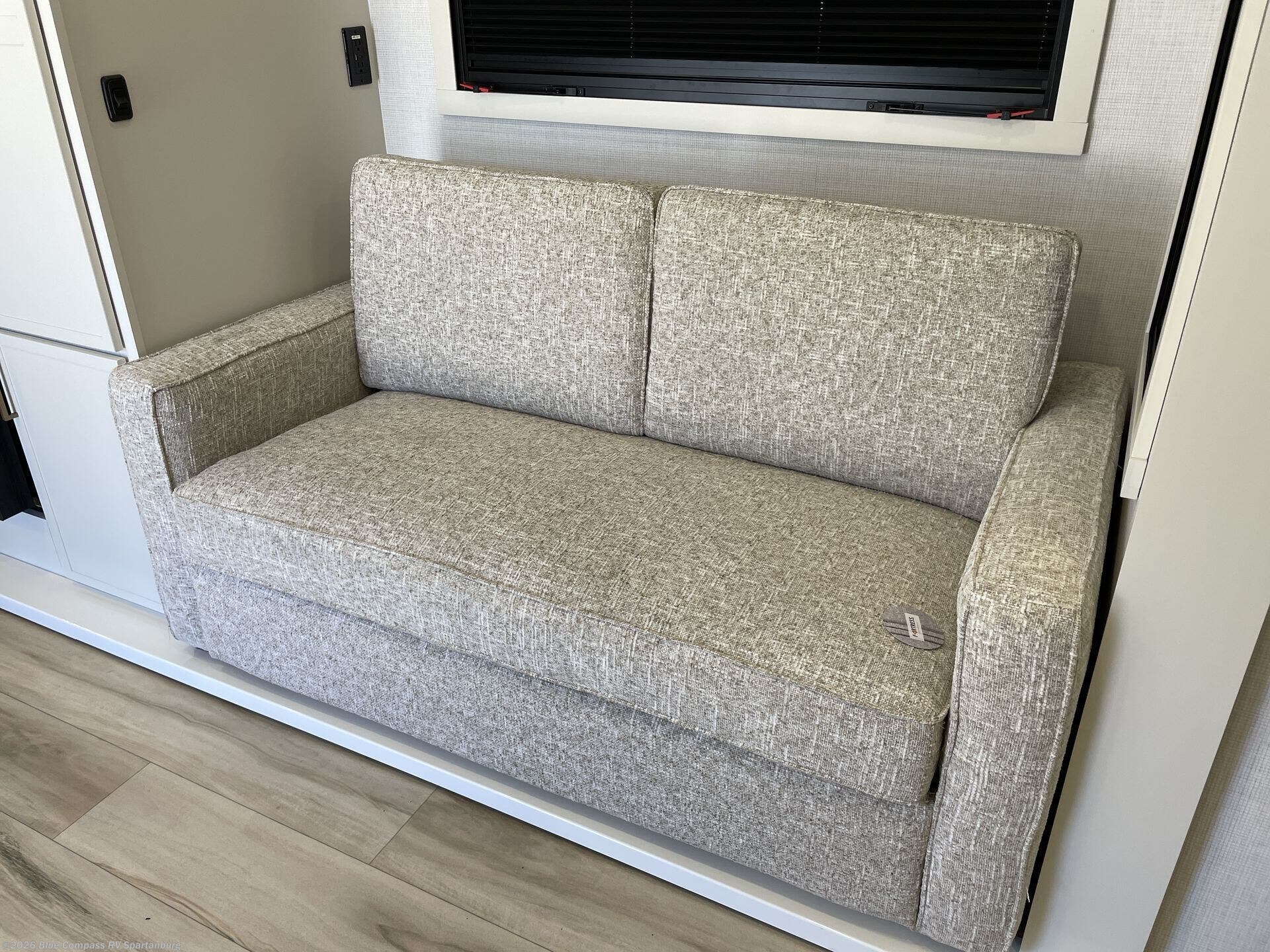 This is the perfect travel trailer for the couple looking for comfort at the campground! Once you've unloaded the pass-thru storage, you can put out the 17' patio awning and relax in your camp chairs. Head inside to make lunch in the fully-equipped kitchen that incudes a range, 30" convection microwave, and dishwasher prep. There is a pantry with outlets within the large slide out, along with a 10 cu. ft. refrigerator that you can access with the slide in, plus theater seating across from the TV. And if you need sleeping space for guests, just choose the optional tri-fold sofa in place of the theater seating! A pull-out table with a drawer provides a place to dine together, and the entryway closet will be perfect to keep jackets and shoes tidy. You'll get a great night's rest on the front queen bed with four drawers, nightstand cubbies, and a room divider for a little more privacy.
