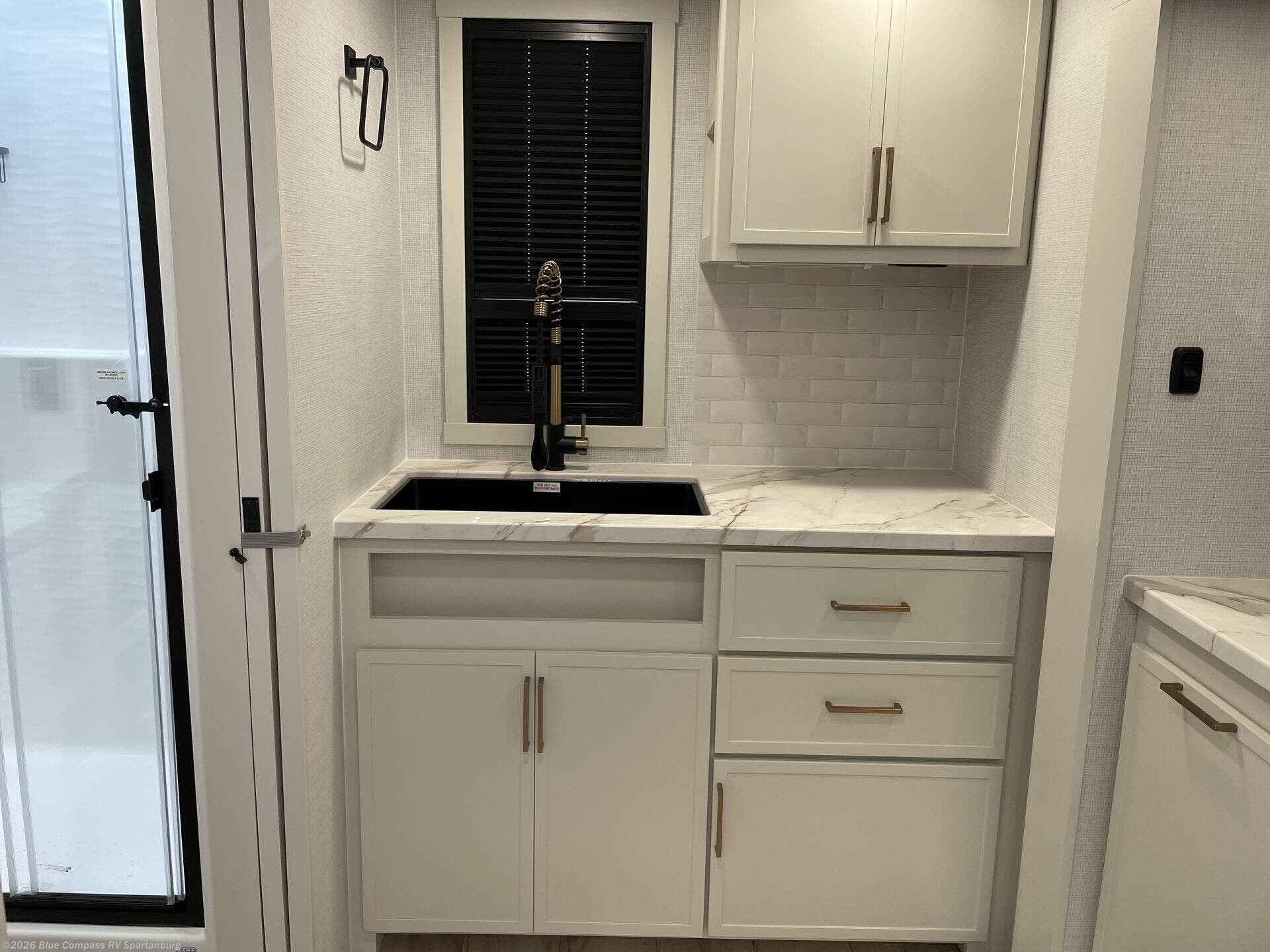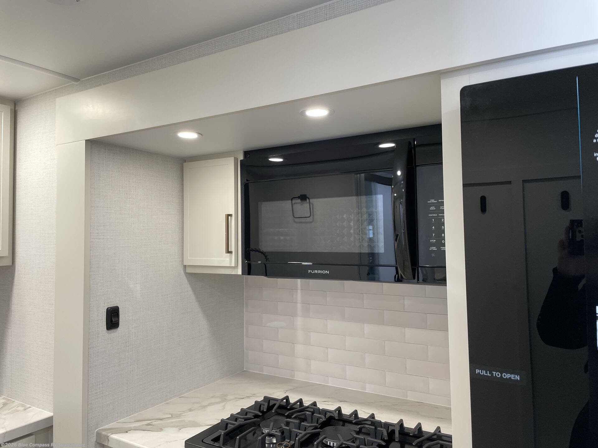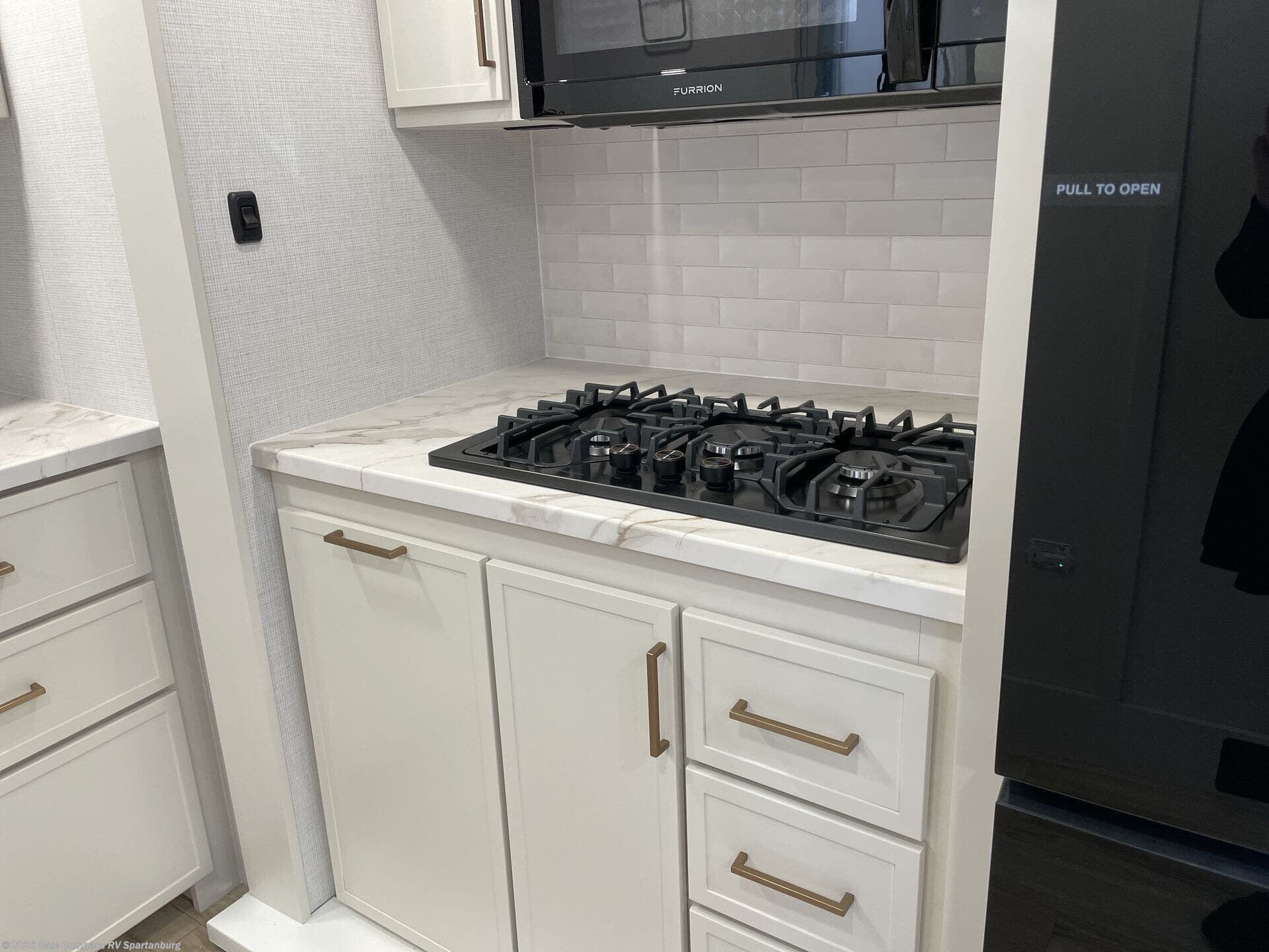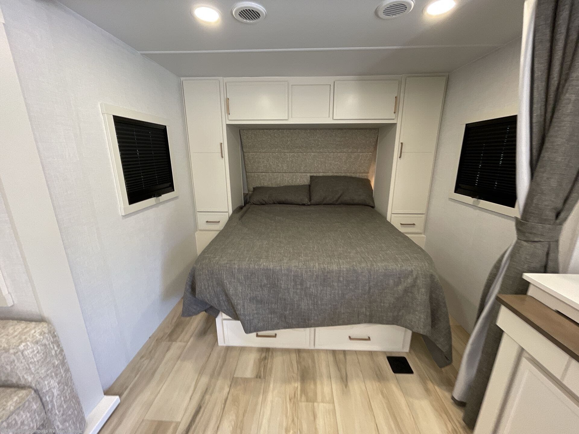 This is the perfect travel trailer for the couple looking for comfort at the campground! Once you've unloaded the pass-thru storage, you can put out the 17' patio awning and relax in your camp chairs. Head inside to make lunch in the fully-equipped kitchen that incudes a range, 30" convection microwave, and dishwasher prep. There is a pantry with outlets within the large slide out, along with a 10 cu. ft. refrigerator that you can access with the slide in, plus theater seating across from the TV. And if you need sleeping space for guests, just choose the optional tri-fold sofa in place of the theater seating! A pull-out table with a drawer provides a place to dine together, and the entryway closet will be perfect to keep jackets and shoes tidy. You'll get a great night's rest on the front queen bed with four drawers, nightstand cubbies, and a room divider for a little more privacy.