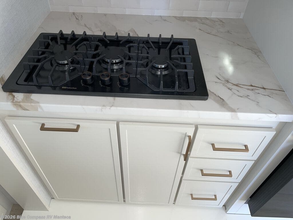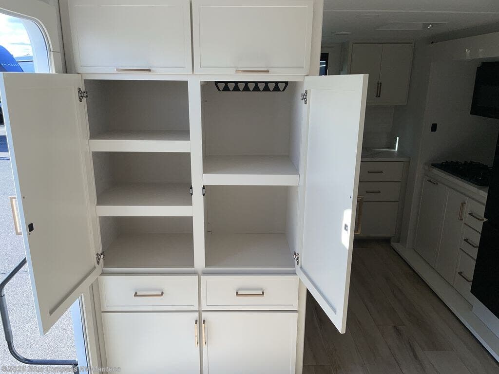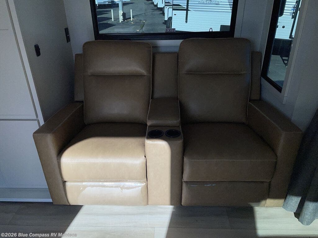 This is the perfect travel trailer for the couple looking for comfort at the campground! Once you've unloaded the pass-thru storage, you can put out the 17' patio awning and relax in your camp chairs. Head inside to make lunch in the fully equipped kitchen that includes a three-burner range, 30" convection microwave, and dishwasher prep. There is a pantry with outlets within the large slide out, along with a 10-cu. ft. refrigerator that you can access with the slide in, plus theater seating across from the TV. And if you need sleeping space for guests, just choose the optional tri-fold sofa in place of the theater seating! A pull-out table with a drawer provides a place to dine together, and the entryway closet will be perfect to keep jackets and shoes tidy. You'll get a great night's rest on the front queen bed with four drawers, nightstand cubbies, and a room divider for a little more privacy.