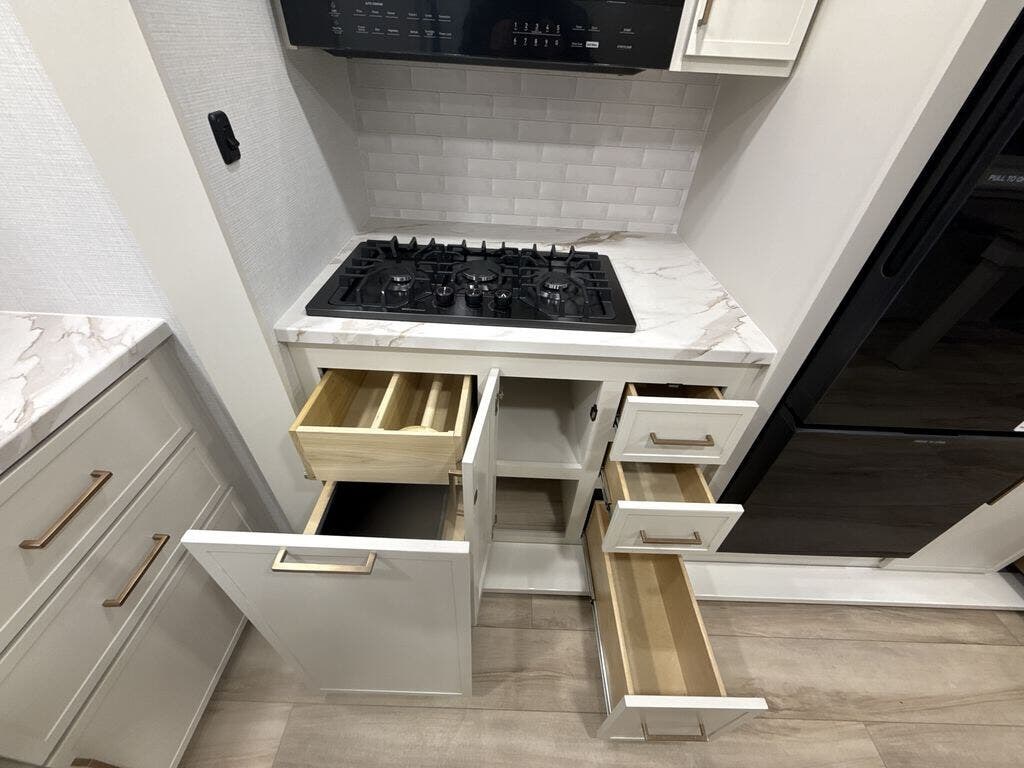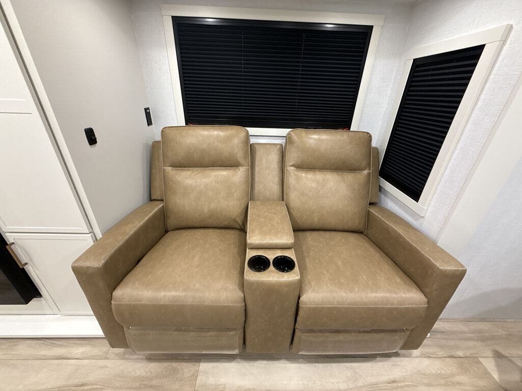 This is the perfect travel trailer for the couple looking for comfort at the campground! Once you've unloaded the pass-thru storage, you can put out the 17' patio awning and relax in your camp chairs. Head inside to make lunch in the fully equipped kitchen that includes a three-burner range, 30" convection microwave, and dishwasher prep. There is a pantry with outlets within the large slide out, along with a 10-cu. ft. refrigerator that you can access with the slide in, plus theater seating across from the TV. And if you need sleeping space for guests, just choose the optional tri-fold sofa in place of the theater seating! A pull-out table with a drawer provides a place to dine together, and the entryway closet will be perfect to keep jackets and shoes tidy. You'll get a great night's rest on the front queen bed with four drawers, nightstand cubbies, and a room divider for a little more privacy.