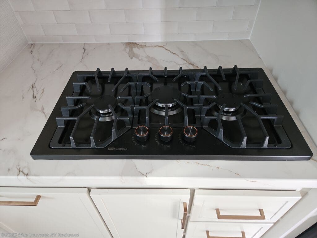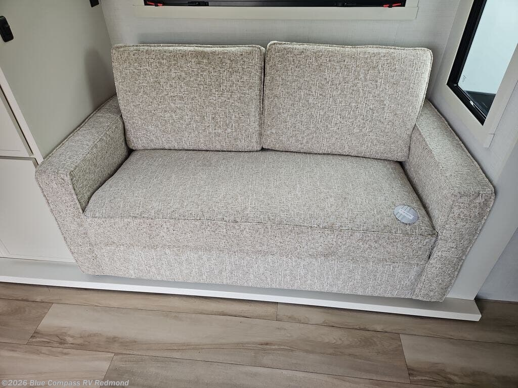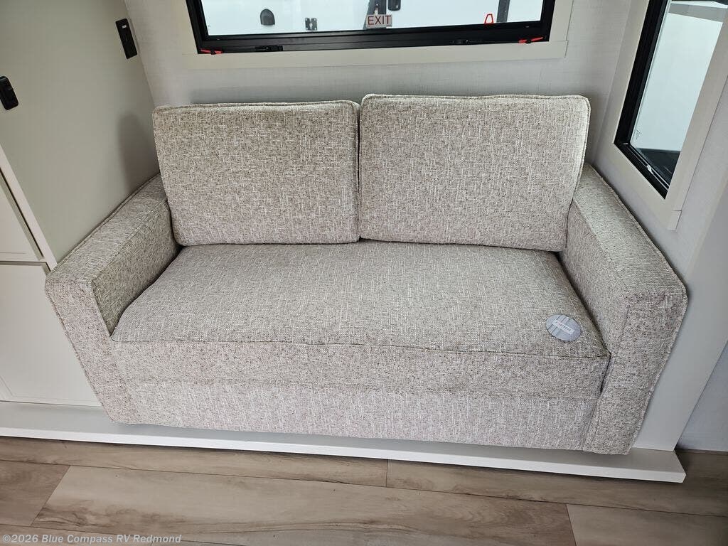 This is the perfect travel trailer for the couple looking for comfort at the campground! Once you've unloaded the pass-thru storage, you can put out the 17' patio awning and relax in your camp chairs. Head inside to make lunch in the fully equipped kitchen that includes a three-burner range, 30" convection microwave, and dishwasher prep. There is a pantry with outlets within the large slide out, along with a 10-cu. ft. refrigerator that you can access with the slide in, plus theater seating across from the TV. And if you need sleeping space for guests, just choose the optional tri-fold sofa in place of the theater seating! A pull-out table with a drawer provides a place to dine together, and the entryway closet will be perfect to keep jackets and shoes tidy. You'll get a great night's rest on the front queen bed with four drawers, nightstand cubbies, and a room divider for a little more privacy.