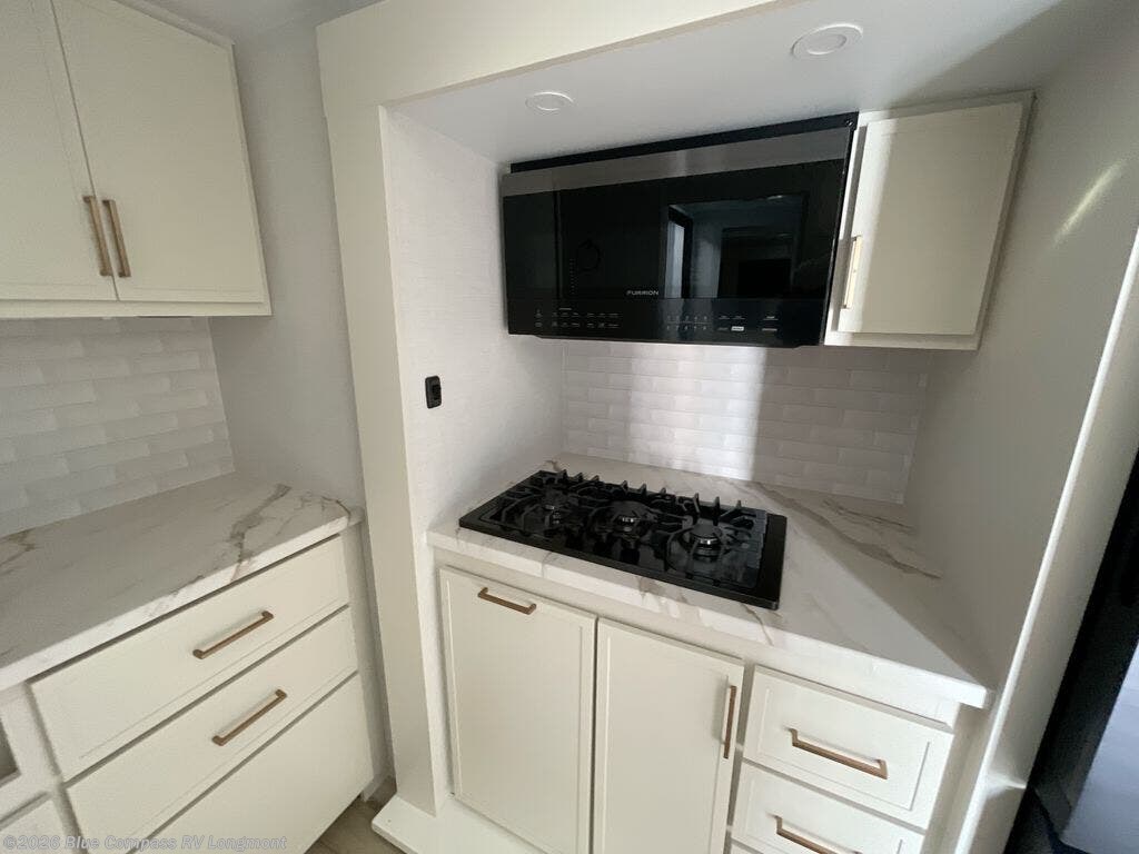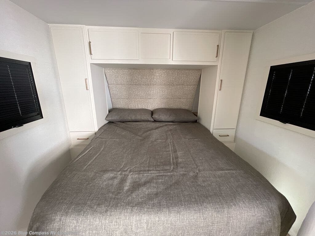 This is the perfect travel trailer for the couple looking for comfort at the campground! Once you've unloaded the pass-thru storage, you can put out the 17' patio awning and relax in your camp chairs. Head inside to make lunch in the fully equipped kitchen that includes a three-burner range, 30" convection microwave, and dishwasher prep. There is a pantry with outlets within the large slide out, along with a 10-cu. ft. refrigerator that you can access with the slide in, plus theater seating across from the TV. And if you need sleeping space for guests, just choose the optional tri-fold sofa in place of the theater seating! A pull-out table with a drawer provides a place to dine together, and the entryway closet will be perfect to keep jackets and shoes tidy. You'll get a great night's rest on the front queen bed with four drawers, nightstand cubbies, and a room divider for a little more privacy.