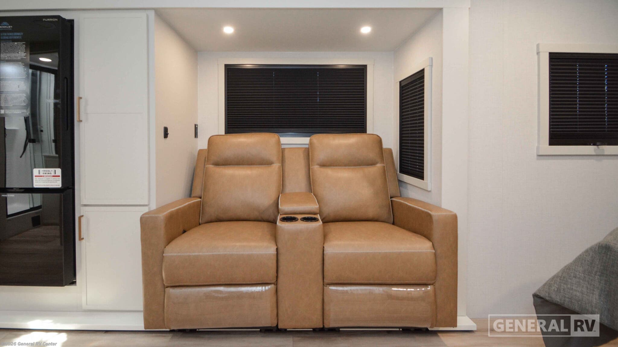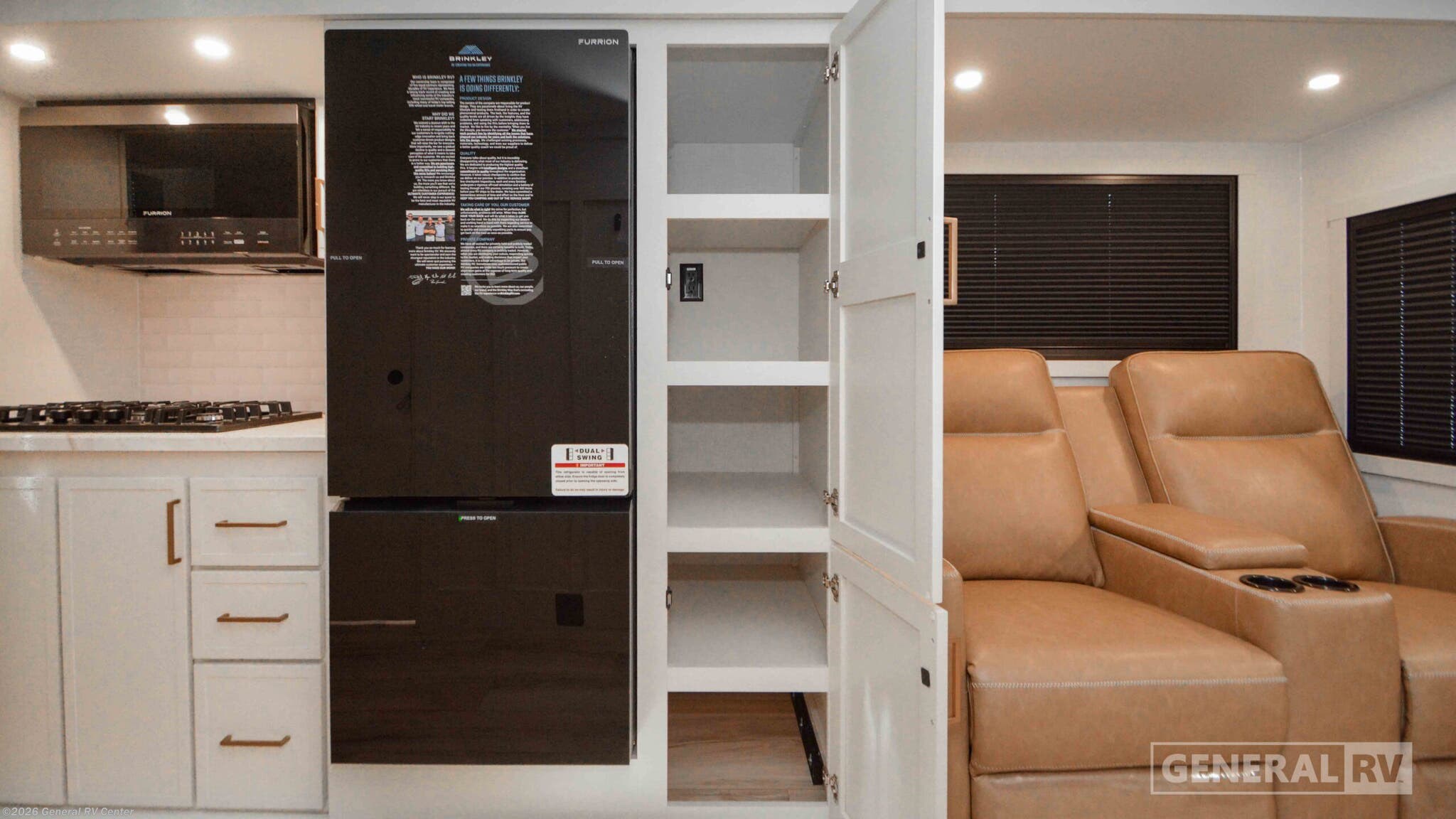 Brinkley Model Ix travel trailer 23x highlights: Front Semi-Private Bedroom Exterior Pass-Thru Storage Spacious Full Bath Living Room TV This is the perfect travel trailer for the couple looking for comfort at the campground! Once you've unloaded the pass-thru storage, you can put out the 17' patio awning and relax in your camp chairs. Head inside to make lunch in the fully equipped kitchen that includes a three-burner range, 30" convection microwave, and dishwasher prep. There is a pantry with outlets within the large slide out, along with a 10-cu. ft. refrigerator that you can access with the slide in, plus theater seating across from the TV. And if you need sleeping space for guests, just choose the optional tri-fold sofa in place of the theater seating! A pull-out table with a drawer provides a place to dine together, and the entryway closet will be perfect to keep jackets and shoes tidy. You'll get a great night's rest on the front queen bed with four drawers, nightstand cubbies, and a room divider for a little more privacy. The Model Ix by Brinkley is your ticket to lightweight towing and exceptional features. This premium half-ton towable travel trailer features Brinkley's CraftSense building materials for a higher level of construction, along with a seamless laminated aluminum exterior with automotive grade full-body paint and modern graphics. You will stay powered up thanks to the power package with a 200-watt solar panel, and the Road Armor suspension will help provide a smooth tow from home to campground. The interior of the Model Ix includes premium residential cabinets with dovetail drawers, an ultra quiet and efficient A/C system, and a SoundCore Boom 2 Bluetooth waterproof speaker so you can listen to your favorite tunes indoors or outdoors!