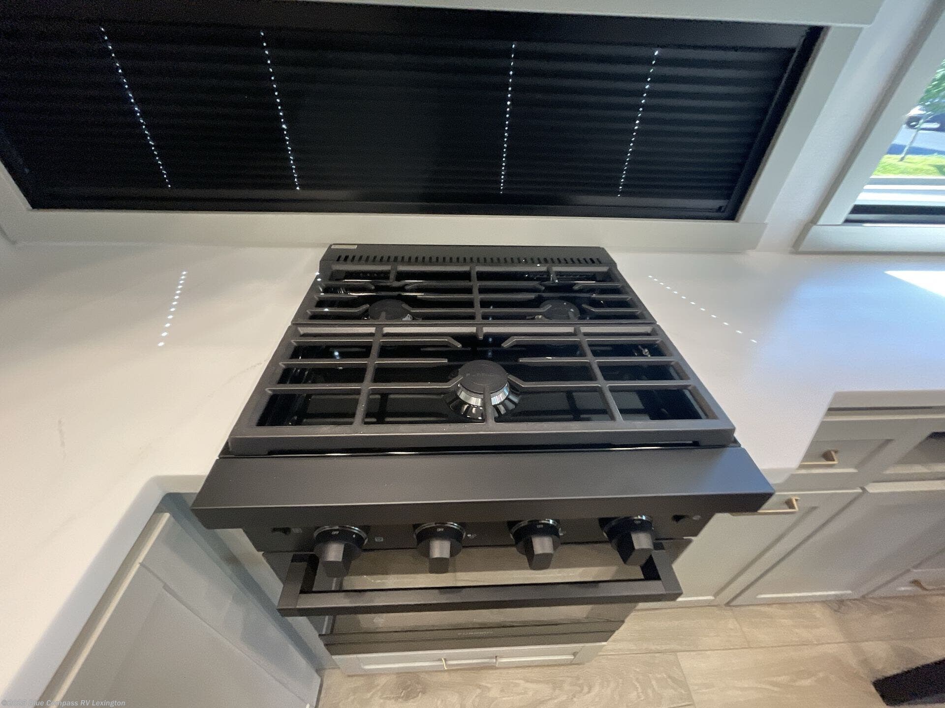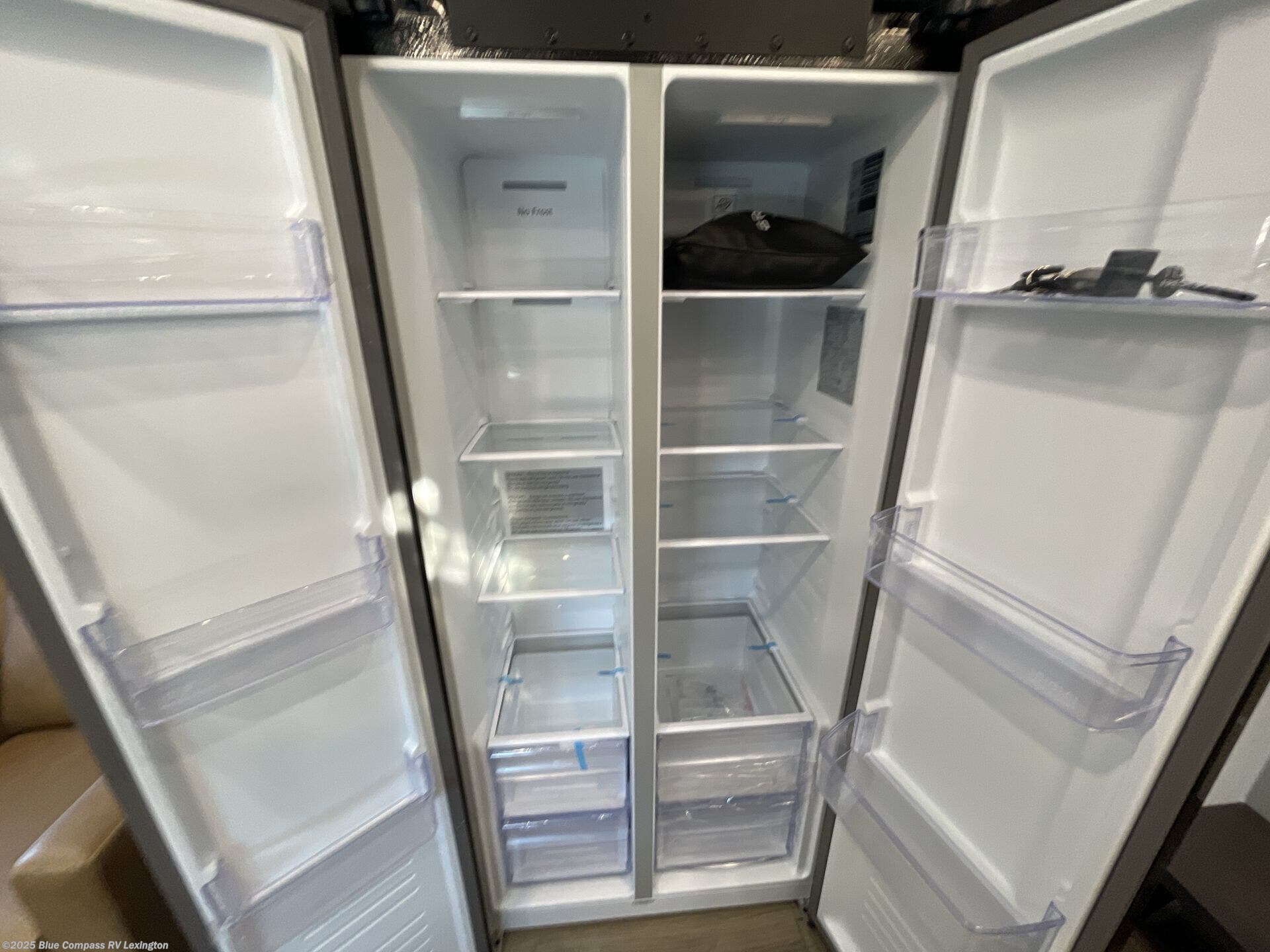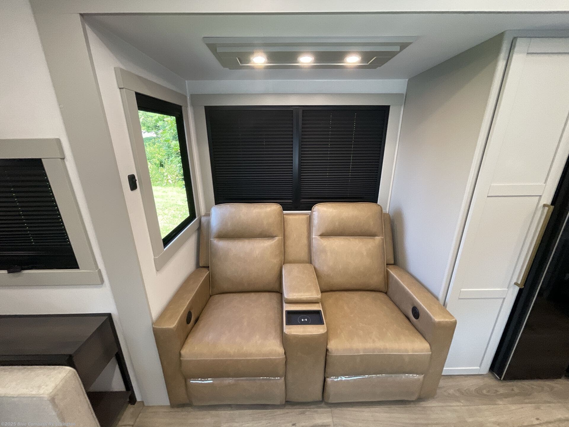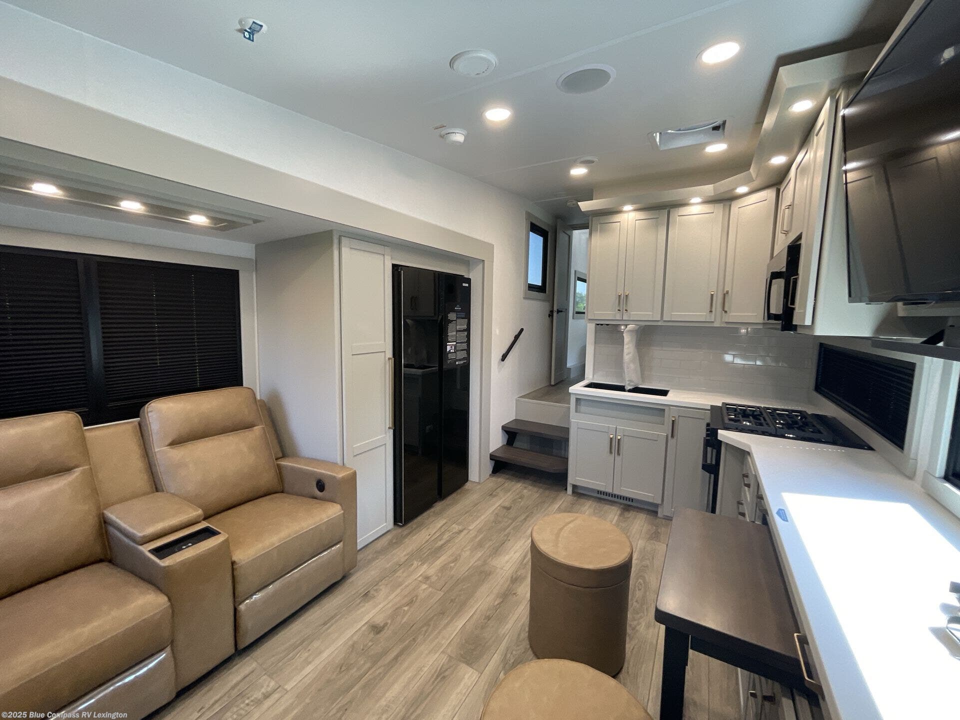 You'll love every minute spent in this luxury fifth wheel! Your crew can get comfortable in the rear living room on the 72" tri-fold sofa that converts to a 62" x 70" bed, or on the theater seating within the slide out. There is also a sliding dining table and a TV with swivel so everyone can have a good view of the movie. A full kitchen, complete with a cooktop, 30" residential microwave, and 16 cu. ft. refrigerator will let you cook and store food, and there is a handy trash bin with a Stow N' Go paper towel holder for easy clean up. The full bath will let you freshen up before heading to bed in the front private bedroom!
