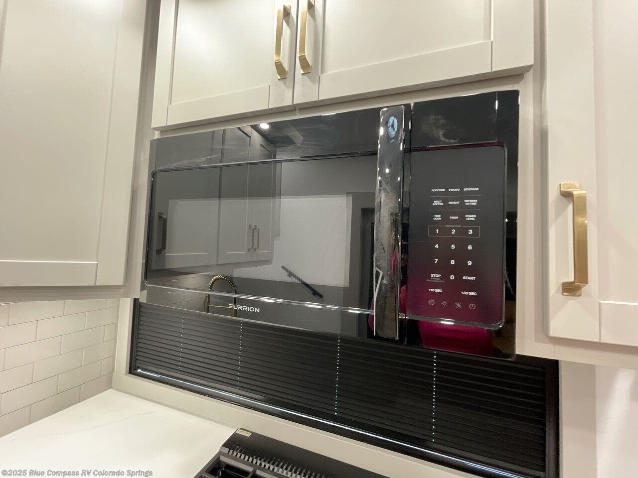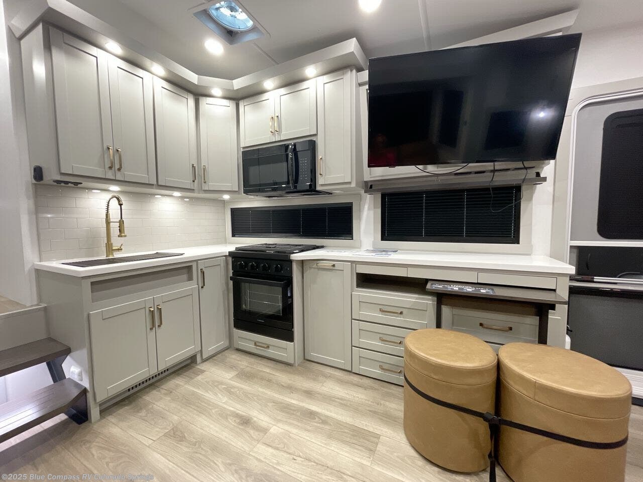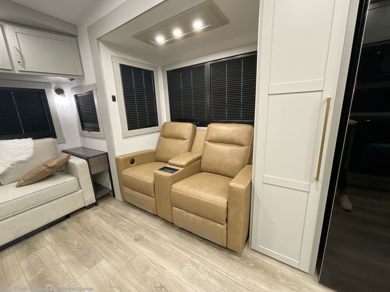 You'll love every minute spent in this luxury fifth wheel! Your crew can get comfortable in the rear living room on the 72" tri-fold sofa that converts to a 62" x 70" bed, or on the theater seating within the slide out. There is also a sliding dining table and a TV with swivel so everyone can have a good view of the movie. A full kitchen, complete with a cooktop, 30" residential microwave, and 16 cu. ft. refrigerator will let you cook and store food, and there is a handy trash bin with a Stow N' Go paper towel holder for easy clean up. The full bath will let you freshen up before heading to bed in the front private bedroom!
