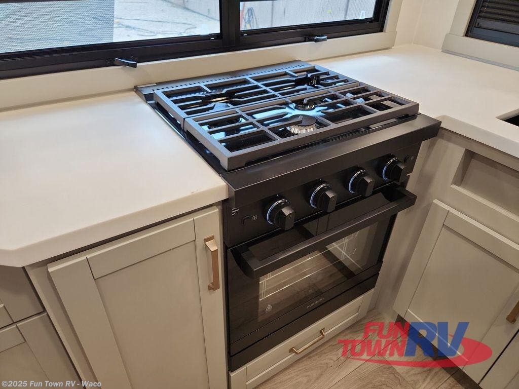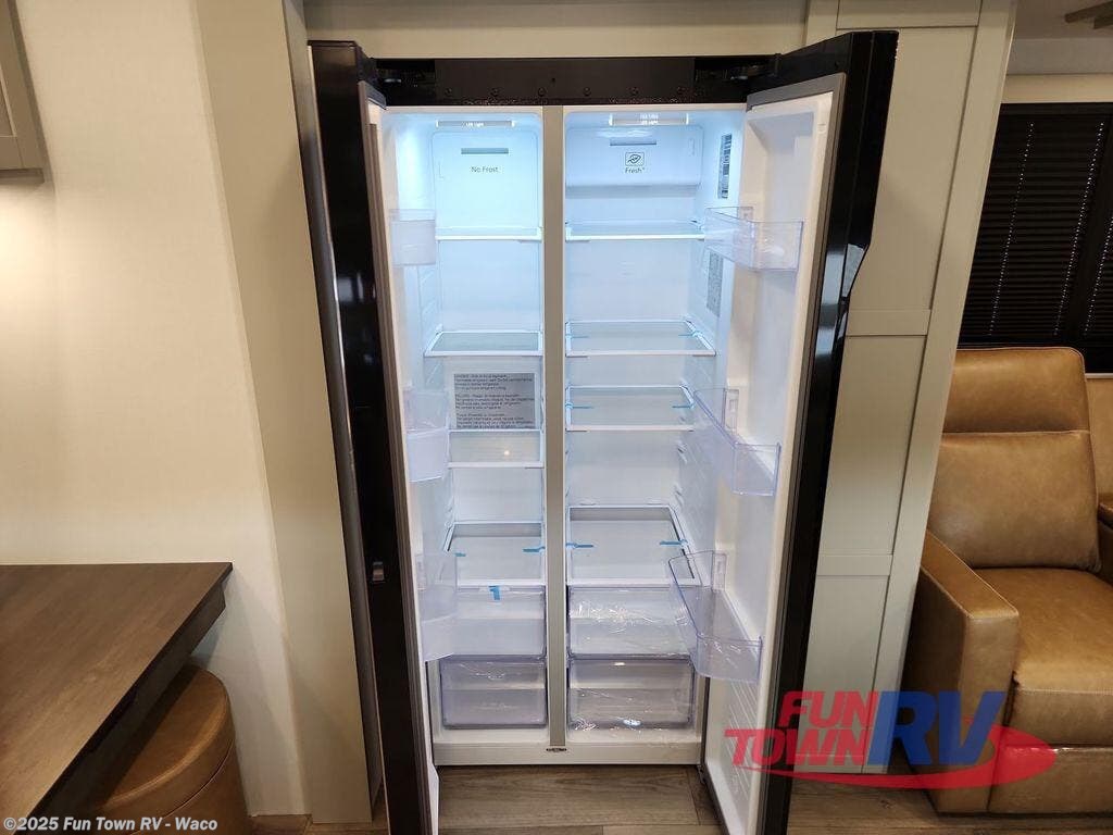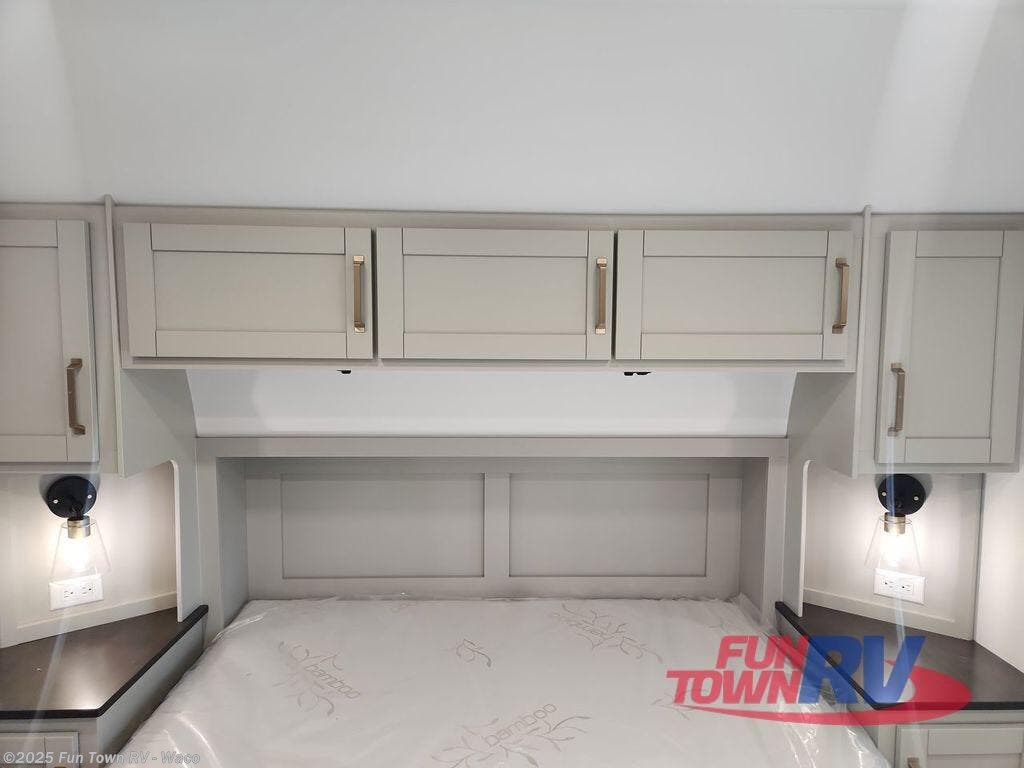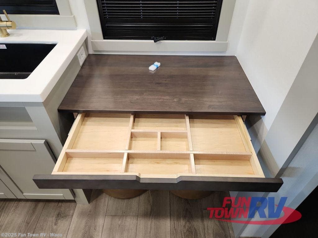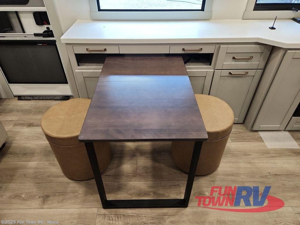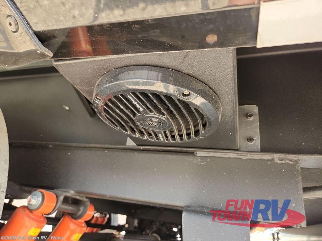 You'll love every minute spent in this spacious fifth wheel that can sleep four each night. There is a front private bedroom with a queen bed and 4x under-bed drawers to keep your space tidy. Your guests can sleep on the tri-fold sofa that extends to a 54" x 70" bed at night. The theater seating sits directly across from the 50" articulating TV for movie nights, and the pantry with drawers is right next to the theater seating for quick access to snacks! The chef of your group is sure to love the kitchen with its ample counter space, 30" residential microwave, and a sliding dining table with a drawer for even more storage. The desk in the back will allow you to get some work done if needed, or you can just spend your days outdoors under the two power awnings. There is also an exterior 12V refrigerator and storage, exterior speakers and controls, and a pass-thru storage for camp gear!
