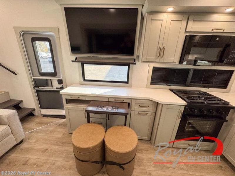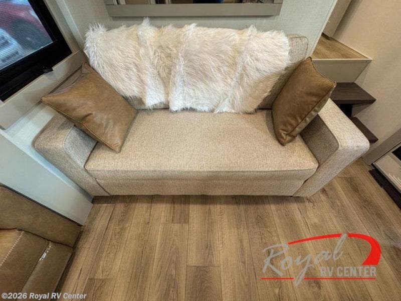 You'll love every minute spent in this spacious fifth wheel that can sleep four each night. There is a front private bedroom with a queen bed and 4x under-bed drawers to keep your space tidy. Your guests can sleep on the tri-fold sofa that extends to a 54" x 70" bed at night. The theater seating sits directly across from the 50" articulating TV for movie nights, and the pantry with drawers is right next to the theater seating for quick access to snacks! The chef of your group is sure to love the kitchen with its ample counter space, 30" residential microwave, and a sliding dining table with a drawer for even more storage. The desk in the back will allow you to get some work done if needed, or you can just spend your days outdoors under the two power awnings. There is also an exterior 12V refrigerator and storage, exterior speakers and controls, and a pass-thru storage for camp gear!