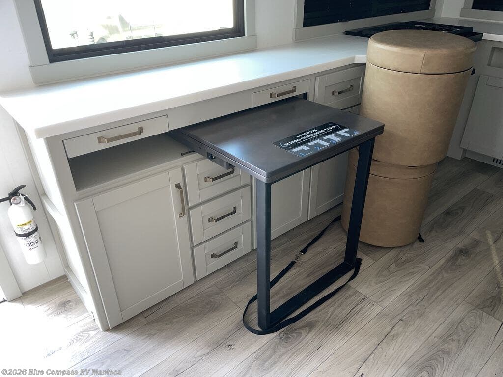 You'll love every minute spent in this spacious fifth wheel that can sleep four each night. There is a front private bedroom with a queen bed and 4x under-bed drawers to keep your space tidy. Your guests can sleep on the tri-fold sofa that extends to a 54" x 70" bed at night. The theater seating sits directly across from the 50" articulating TV for movie nights, and the pantry with drawers is right next to the theater seating for quick access to snacks! The chef of your group is sure to love the kitchen with its ample counter space, 30" residential microwave, and a sliding dining table with a drawer for even more storage. The desk in the back will allow you to get some work done if needed, or you can just spend your days outdoors under the two power awnings. There is also an exterior 12V refrigerator and storage, exterior speakers and controls, and a pass-thru storage for camp gear!