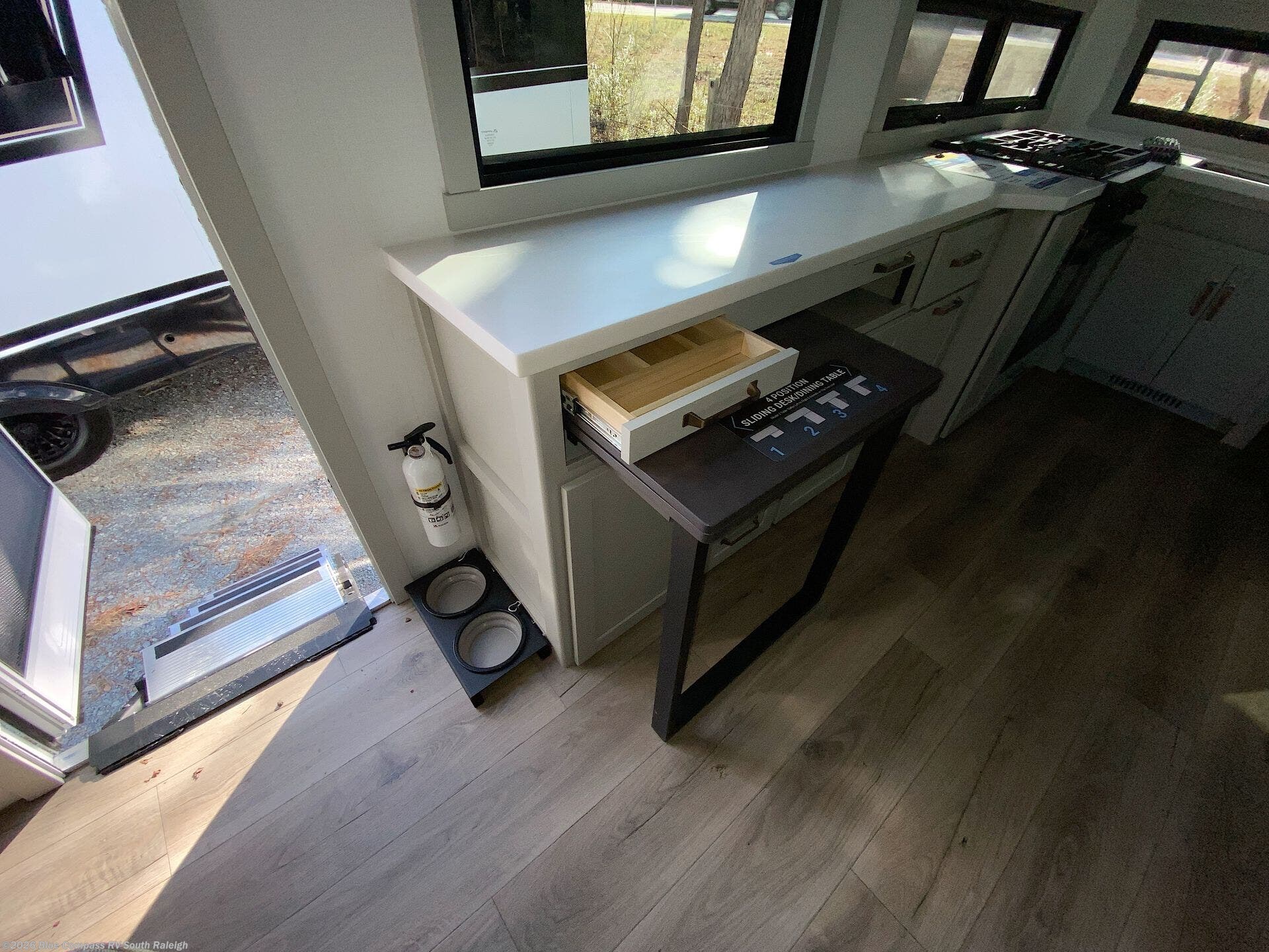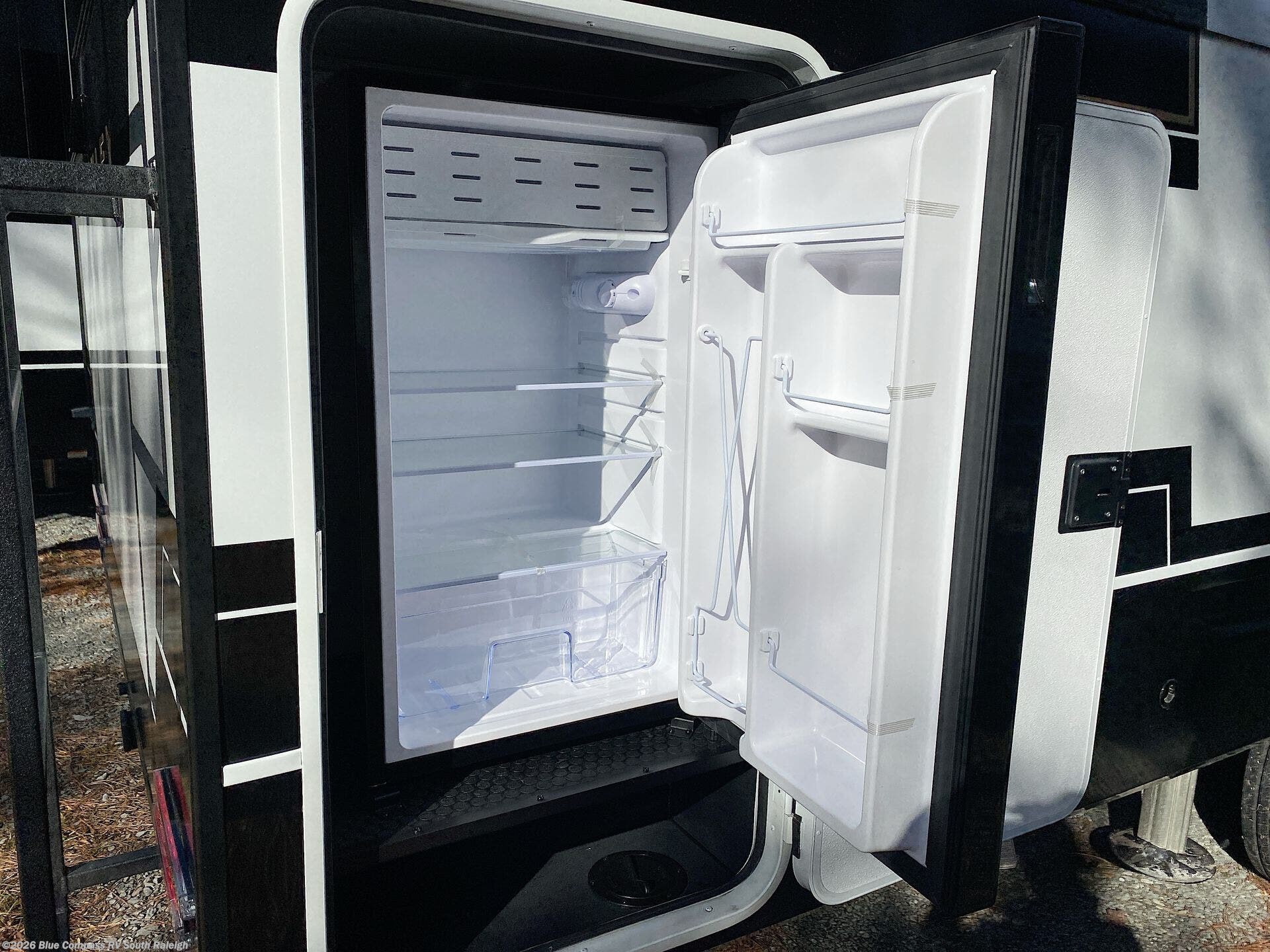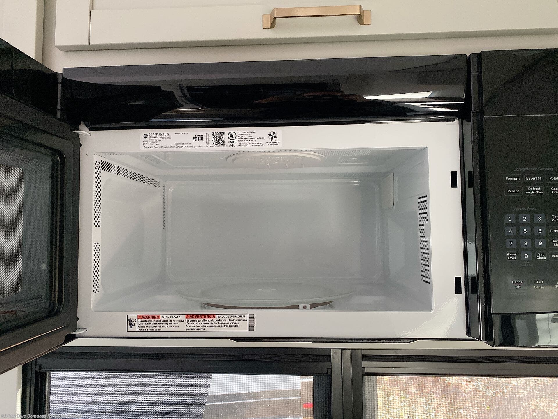 You'll love every minute spent in this spacious fifth wheel that can sleep four each night. There is a front private bedroom with a queen bed and 4x under-bed drawers to keep your space tidy. Your guests can sleep on the tri-fold sofa that extends to a 54" x 70" bed at night. The theater seating sits directly across from the 50" articulating TV for movie nights, and the pantry with drawers is right next to the theater seating for quick access to snacks! The chef of your group is sure to love the kitchen with its ample counter space, 30" residential microwave, and a sliding dining table with a drawer for even more storage. The desk in the back will allow you to get some work done if needed, or you can just spend your days outdoors under the two power awnings. There is also an exterior 12V refrigerator and storage, exterior speakers and controls, and a pass-thru storage for camp gear!