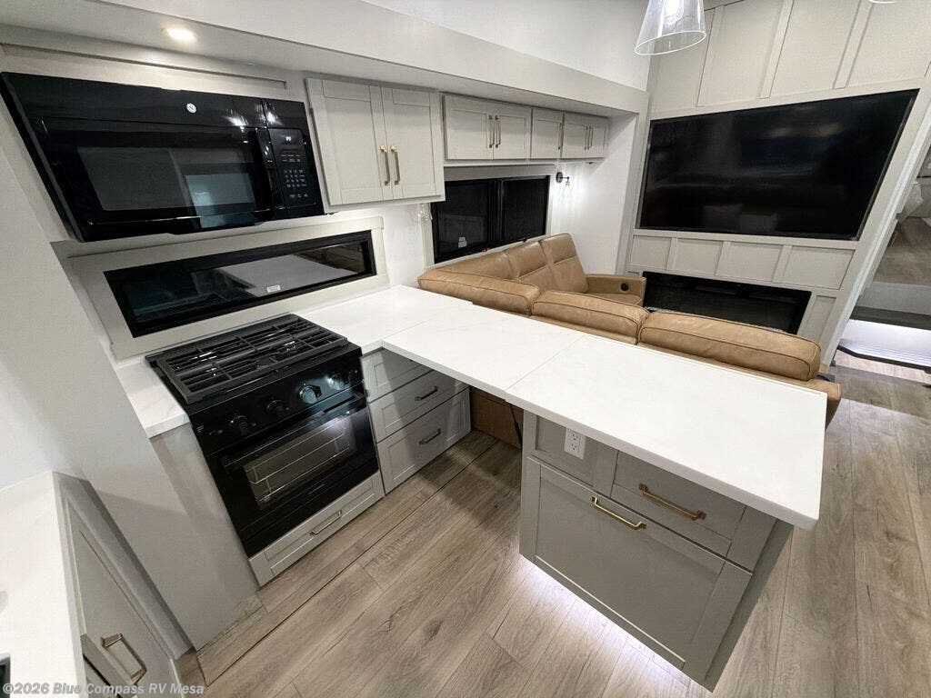 Featuring a spacious L-sofa with four recliners and a 65” articulating TV for endless entertainment, this fifth wheel is a great option to get on the road! The convertible dining table/L desk seats up to four people, making it perfect for meals, work, or play. You can cozy up by the fireplace and enjoy quality time with loved ones. Plus, ample shoe storage keeps your gear organized. The kitchen is equipped with solid surface countertops, dishwasher prep, a residential microwave, and a three-burner cooktop. Also, the large pantry with pull-out drawers provides ample storage for your favorite ingredients and cooking essentials. The one-piece fiberglass shower is a highlight of the bathroom, offering a convenient space to get ready, and additional storage is provided by the linen closet. And you will love the front main bedroom featuring a residential queen memory foam mattress with nightstands, outlets, and USB & USB-C ports for convenient charging.