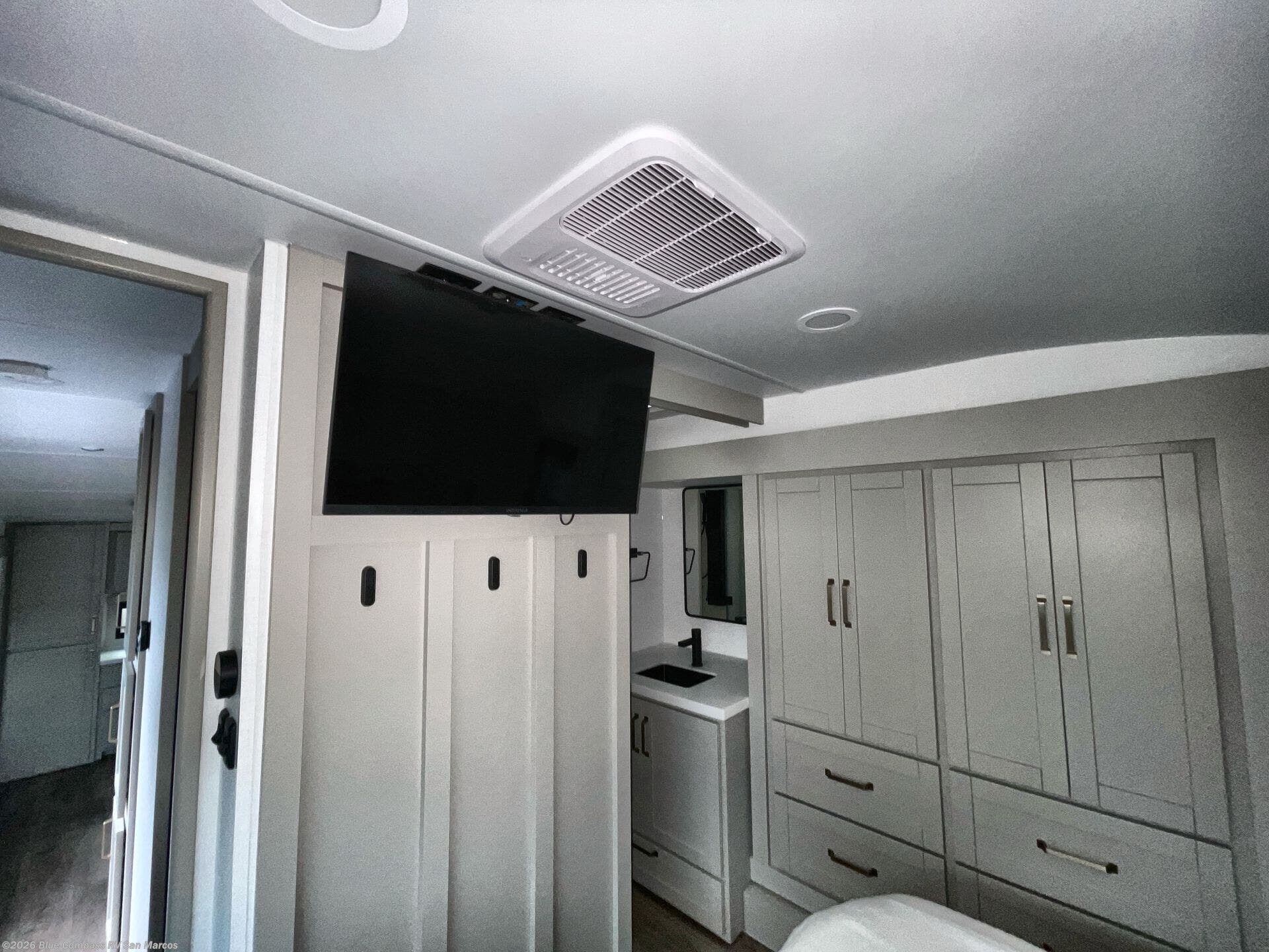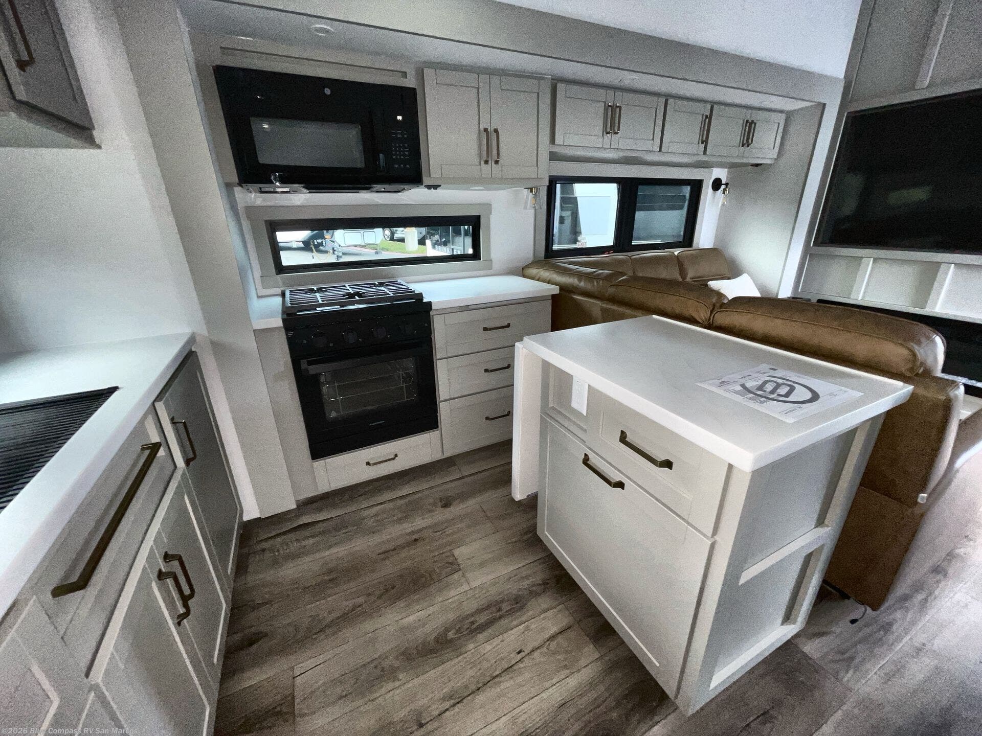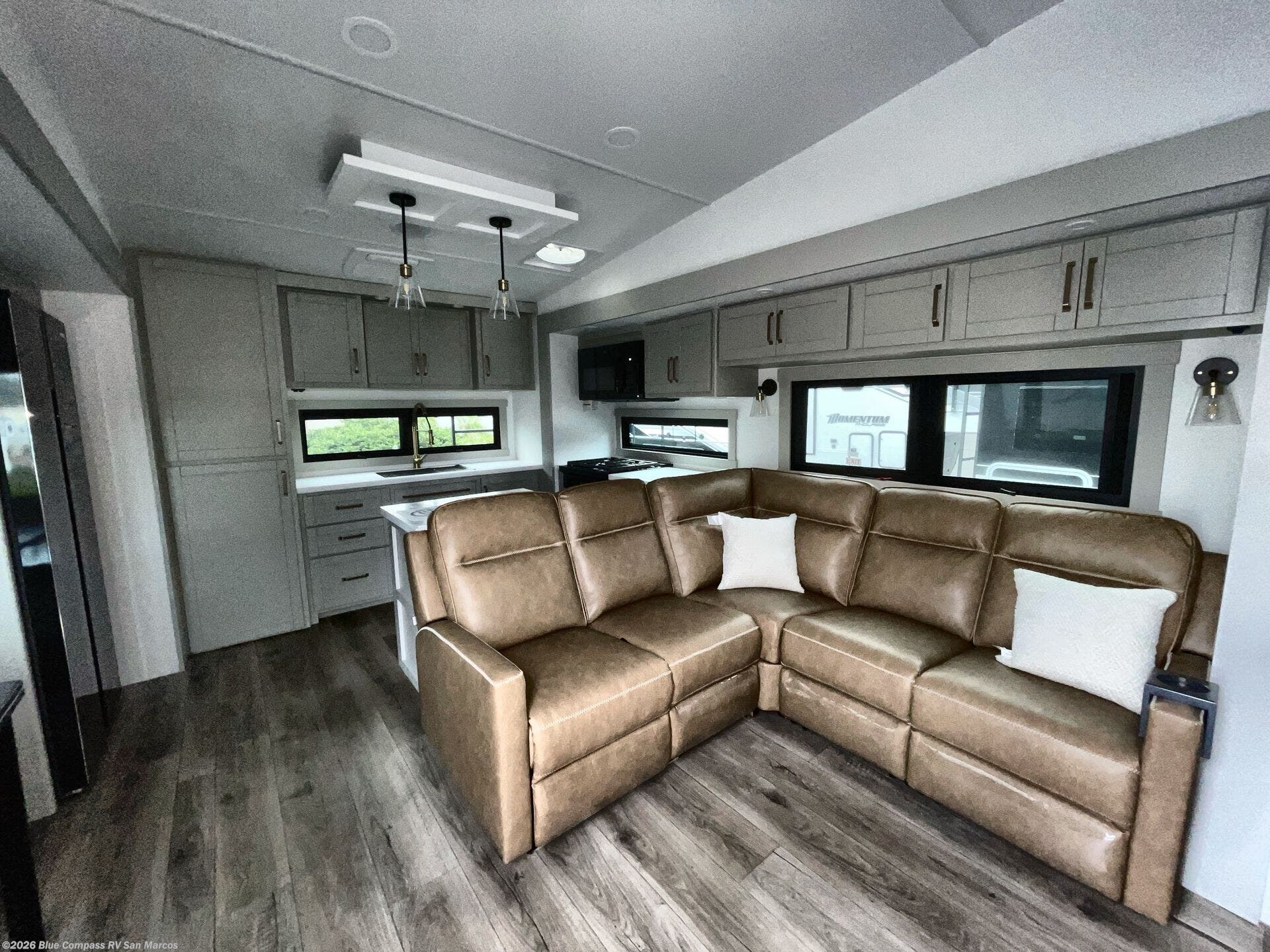 Featuring a spacious L-sofa with four recliners and a 65” articulating TV for endless entertainment, this fifth wheel is a great option to get on the road! The convertible dining table/L desk seats up to four people, making it perfect for meals, work, or play. You can cozy up by the fireplace and enjoy quality time with loved ones. Plus, ample shoe storage keeps your gear organized. The kitchen is equipped with solid surface countertops, dishwasher prep, a residential microwave, and a three-burner cooktop. Also, the large pantry with pull-out drawers provides ample storage for your favorite ingredients and cooking essentials. The one-piece fiberglass shower is a highlight of the bathroom, offering a convenient space to get ready, and additional storage is provided by the linen closet. And you will love the front main bedroom featuring a residential queen memory foam mattress with nightstands, outlets, and USB & USB-C ports for convenient charging.