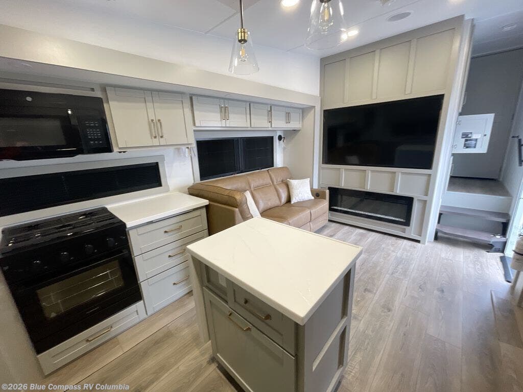 Featuring a spacious L-sofa with four recliners and a 65” articulating TV for endless entertainment, this fifth wheel is a great option to get on the road! The convertible dining table/L desk seats up to four people, making it perfect for meals, work, or play. You can cozy up by the fireplace and enjoy quality time with loved ones. Plus, ample shoe storage keeps your gear organized. The kitchen is equipped with solid surface countertops, dishwasher prep, a residential microwave, and a three-burner cooktop. Also, the large pantry with pull-out drawers provides ample storage for your favorite ingredients and cooking essentials. The one-piece fiberglass shower is a highlight of the bathroom, offering a convenient space to get ready, and additional storage is provided by the linen closet. And you will love the front main bedroom featuring a residential queen memory foam mattress with nightstands, outlets, and USB & USB-C ports for convenient charging.