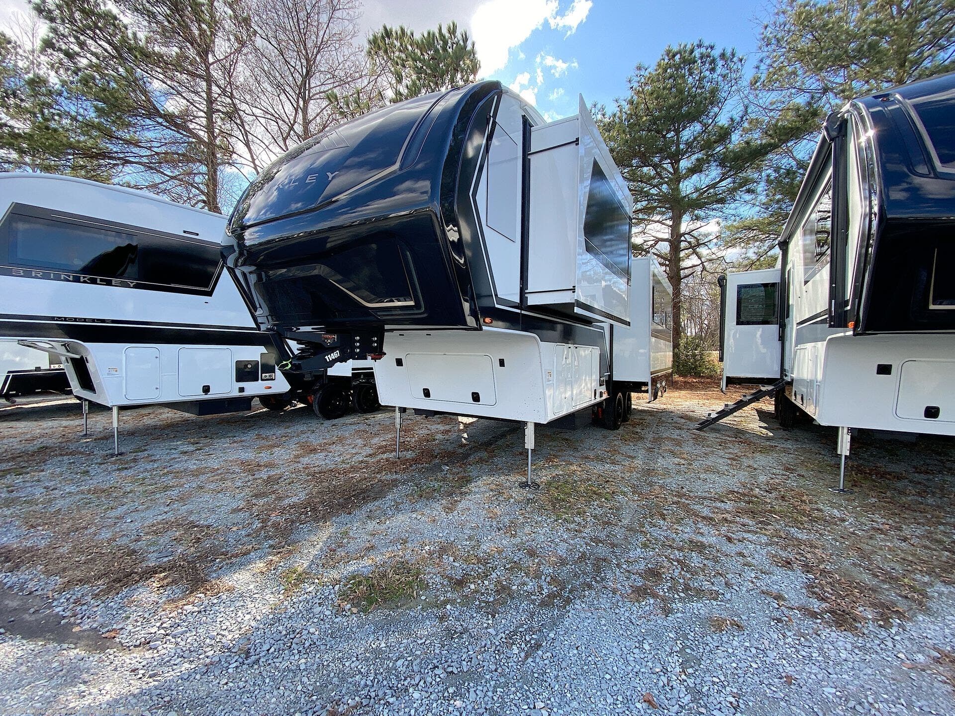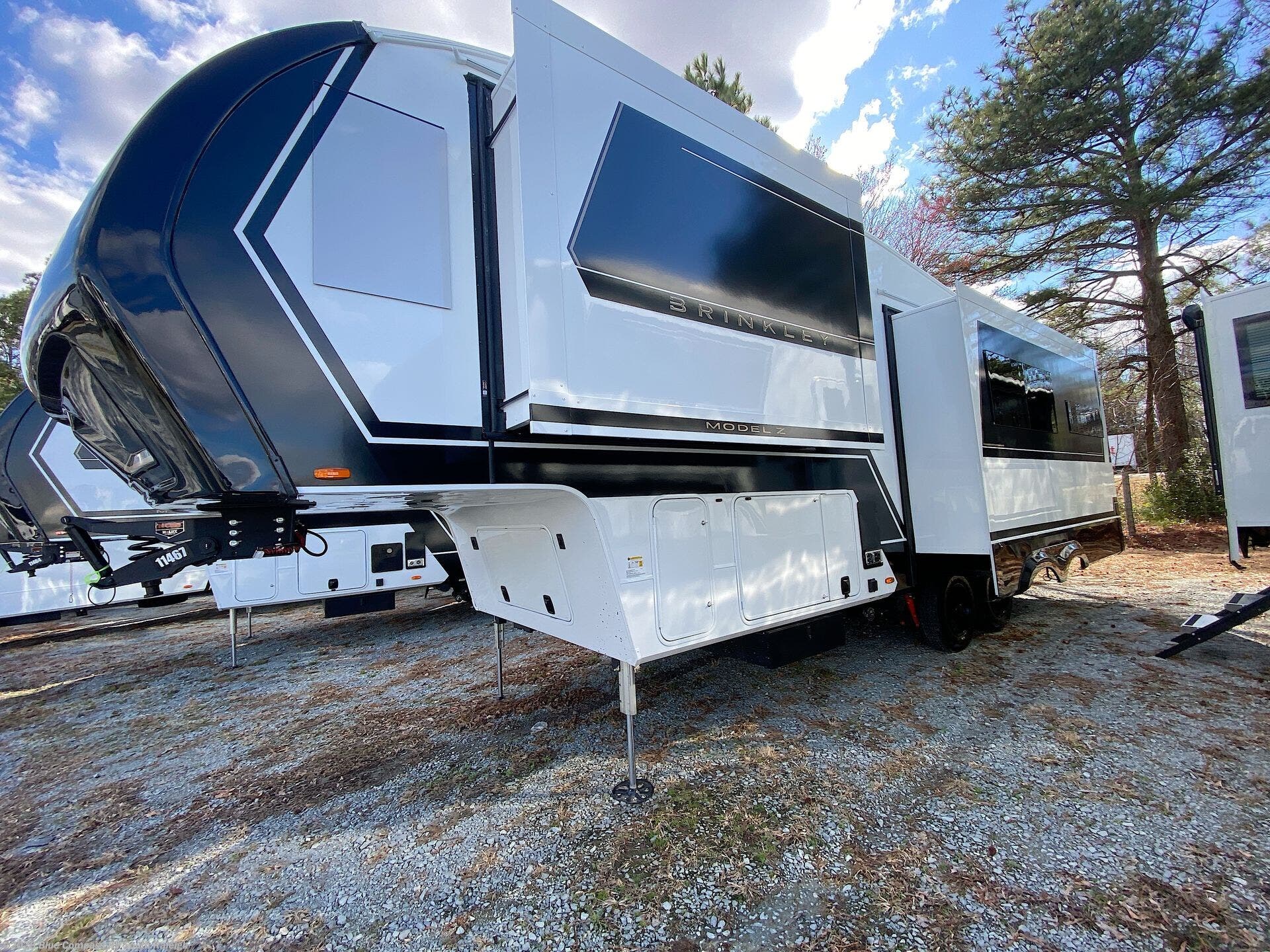 The Brinkley mid-profile Model Z fifth wheels bring you clean lines and an upscale look with plenty of style and exciting new features like the industry first brass plumbing connections. These units also feature an automotive grade front cap, plenty of exterior storage, exterior hot and cold showers, and wide stance leveling jacks for easy set up. Residential frameless windows provide a clean look and beautiful views, and ample electrical outlets and 6 USB/USB-C outlets allow all of your electronics and appliances to easily be used and charged.