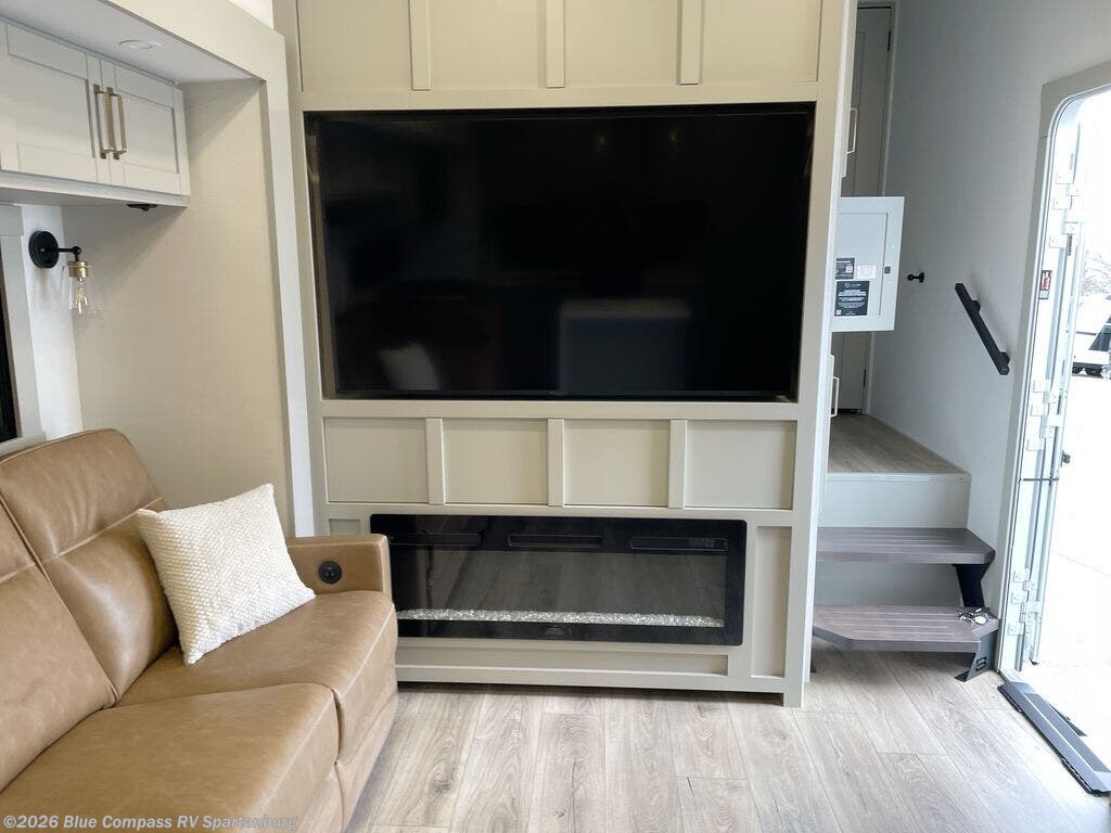 Featuring a spacious L-sofa with four recliners and a 65” articulating TV for endless entertainment, this fifth wheel is a great option to get on the road! The convertible dining table/L desk seats up to four people, making it perfect for meals, work, or play. You can cozy up by the fireplace and enjoy quality time with loved ones. Plus, ample shoe storage keeps your gear organized. The kitchen is equipped with solid surface countertops, dishwasher prep, a residential microwave, and a three-burner cooktop. Also, the large pantry with pull-out drawers provides ample storage for your favorite ingredients and cooking essentials. The one-piece fiberglass shower is a highlight of the bathroom, offering a convenient space to get ready, and additional storage is provided by the linen closet. And you will love the front main bedroom featuring a residential queen memory foam mattress with nightstands, outlets, and USB & USB-C ports for convenient charging.