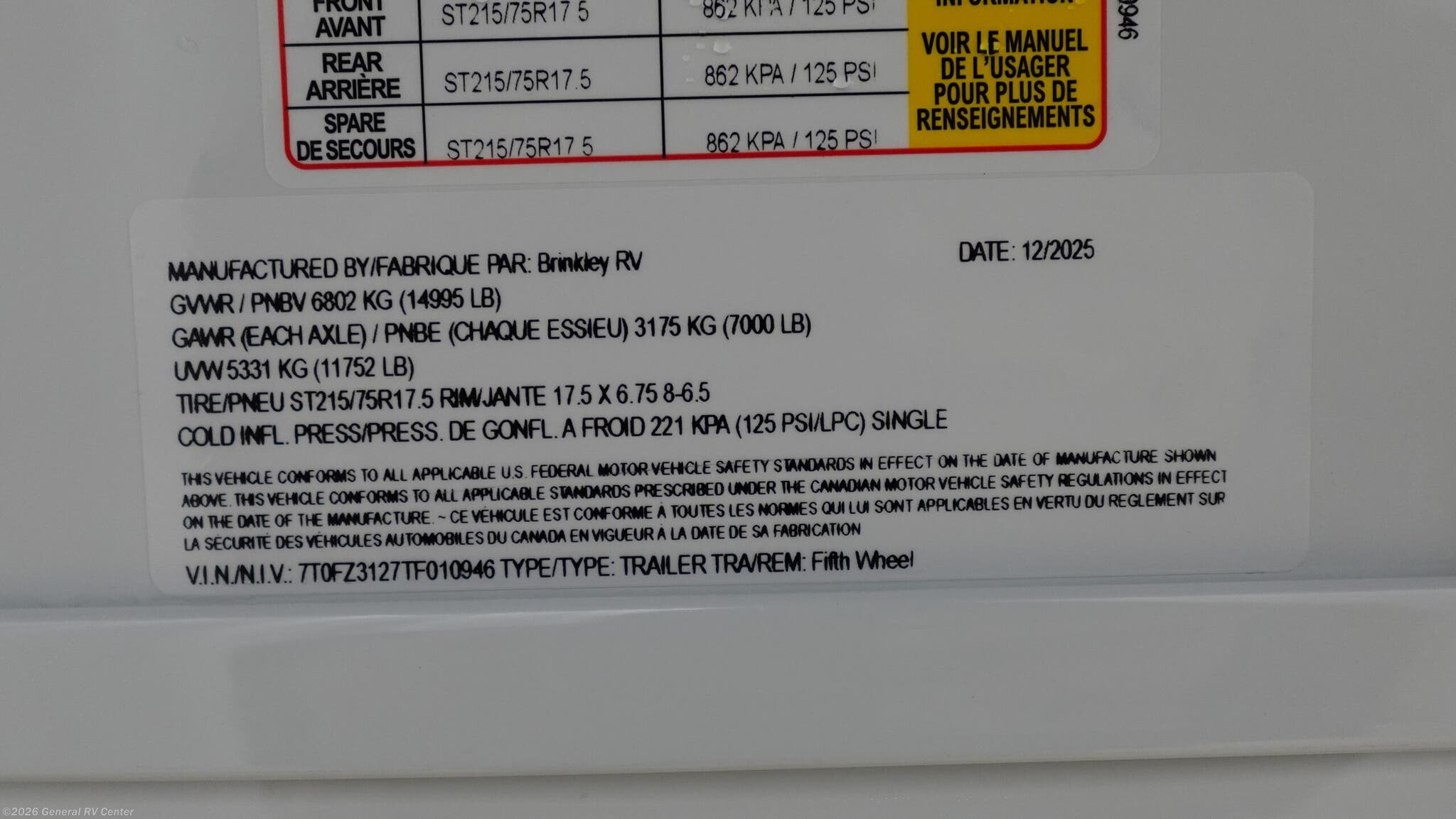 Experience the perfect blend of style and functionality with the 2026 Brinkley Model Z 2700. This stunning RV, stretching 29 feet in length, is designed to accommodate up to seven guests comfortably, making it ideal for family adventures or group getaways. The spacious interior features a 72" tri-fold sofa and 62" theater seating, providing ample room for relaxation and entertainment. The sliding dining/desk table offers versatility, whether you're enjoying a meal or catching up on work. The kitchen is a chef's delight, boasting a 16 cu. ft. refrigerator and a 30" residential microwave, ensuring you have everything you need to prepare delicious meals on the go. The queen bed with under-bed storage and the thoughtfully designed bathroom with a 30" x 42" shower add to the convenience and comfort. Outside, the 19' awning creates a perfect outdoor living space, while the pass-thru storage ensures you have room for all your travel essentials. Discover this exceptional RV at your nearest General RV dealership and embark on your next adventure in style!