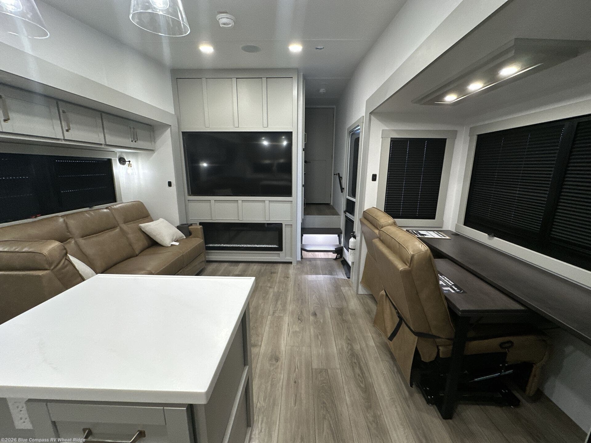 Featuring a spacious L-sofa with four recliners and a 65” articulating TV for endless entertainment, this fifth wheel is a great option to get on the road! The convertible dining table/L desk seats up to four people, making it perfect for meals, work, or play. You can cozy up by the fireplace and enjoy quality time with loved ones. Plus, ample shoe storage keeps your gear organized. The kitchen is equipped with solid surface countertops, dishwasher prep, a residential microwave, and a three-burner cooktop. Also, the large pantry with pull-out drawers provides ample storage for your favorite ingredients and cooking essentials. The one-piece fiberglass shower is a highlight of the bathroom, offering a convenient space to get ready, and additional storage is provided by the linen closet. And you will love the front main bedroom featuring a residential queen memory foam mattress with nightstands, outlets, and USB & USB-C ports for convenient charging.