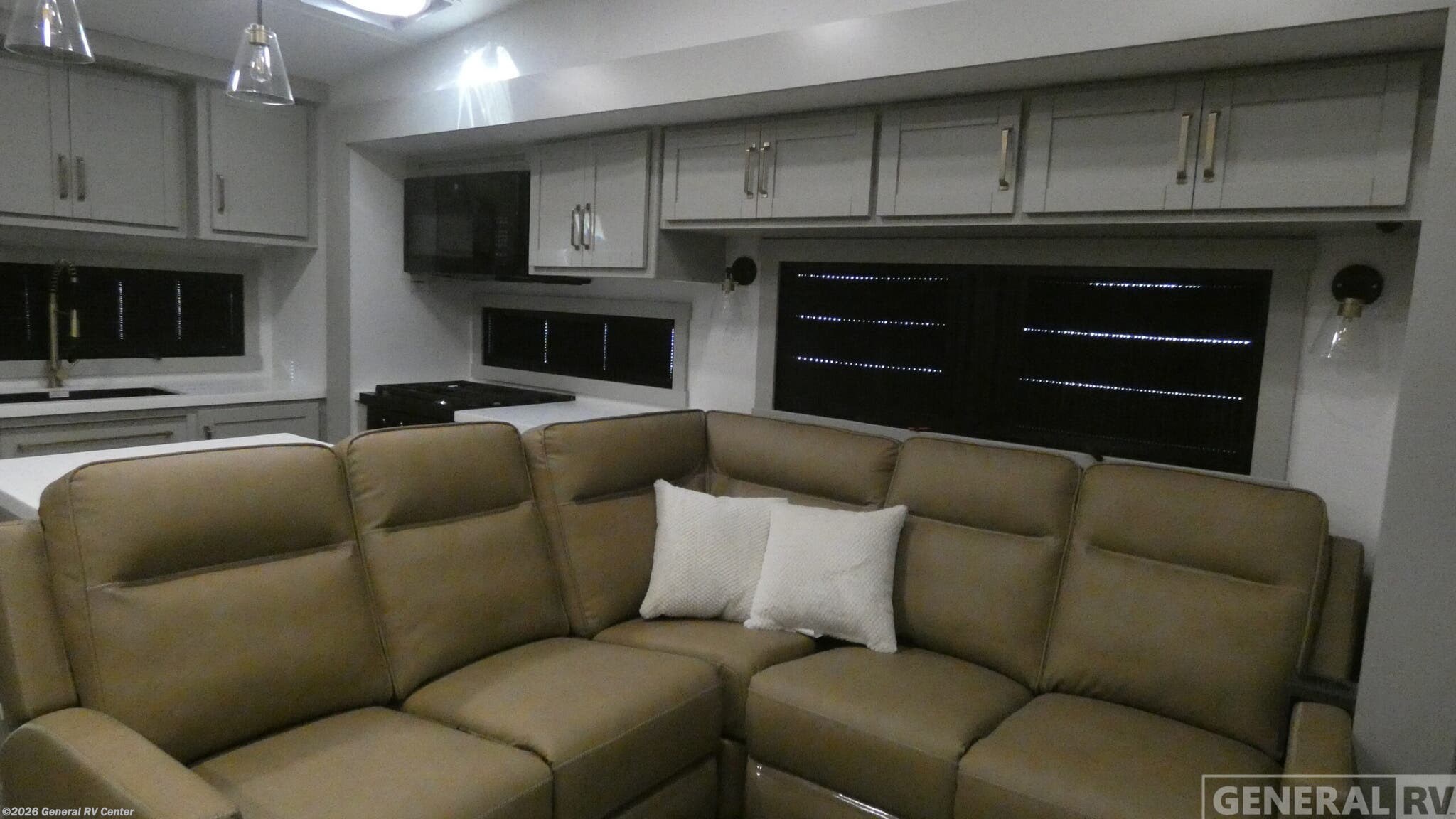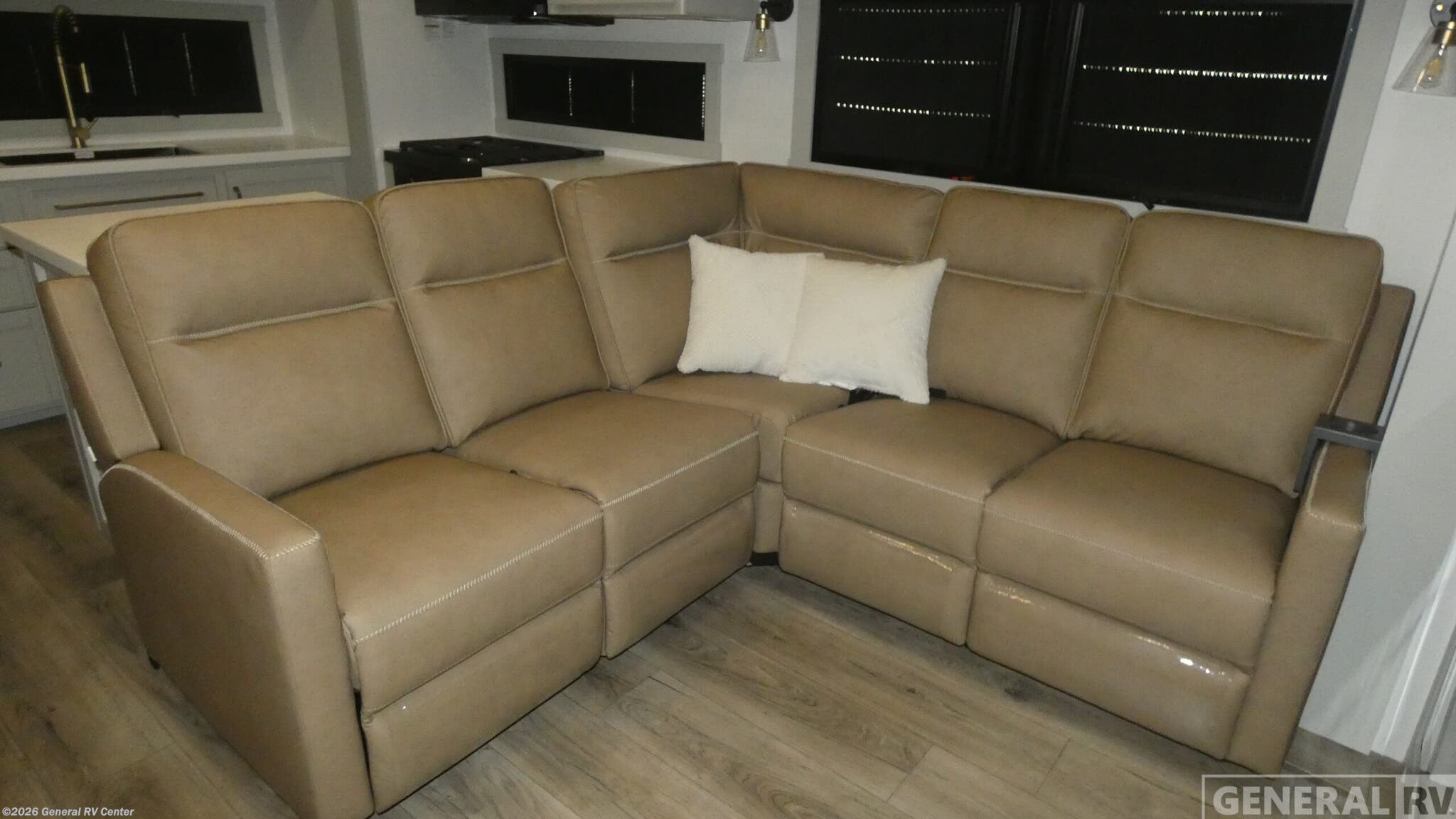 Brinkley Model Z 2700 fifth wheel highlights: L-Sofa with Four Recliners Flip-Up Countertop Fireplace Dual Awnings Shoe Storage Featuring a spacious L-sofa with four recliners and a 65” articulating TV for endless entertainment, this fifth wheel is a great option to get on the road! The convertible dining table/L desk seats up to four people, making it perfect for meals, work, or play. You can cozy up by the fireplace and enjoy quality time with loved ones. Plus, ample shoe storage keeps your gear organized. The kitchen is equipped with solid surface countertops, dishwasher prep, a residential microwave, and a three-burner cooktop. Also, the large pantry with pull-out drawers provides ample storage for your favorite ingredients and cooking essentials. The one-piece fiberglass shower is a highlight of the bathroom, offering a convenient space to get ready, and additional storage is provided by the linen closet. And you will love the front main bedroom featuring a residential queen memory foam mattress with nightstands, outlets, and USB & USB-C ports for convenient charging. The Brinkley mid-profile Model Z fifth wheels bring you clean lines and an upscale look with plenty of style and exciting new features like the industry first brass plumbing connections. These units also feature an automotive grade front cap, plenty of exterior storage, exterior hot and cold showers, and wide stance leveling jacks for easy set up. Residential frameless windows provide a clean look and beautiful views, and ample electrical outlets and 6 USB/USB-C outlets allow all of your electronics and appliances to easily be used and charged.