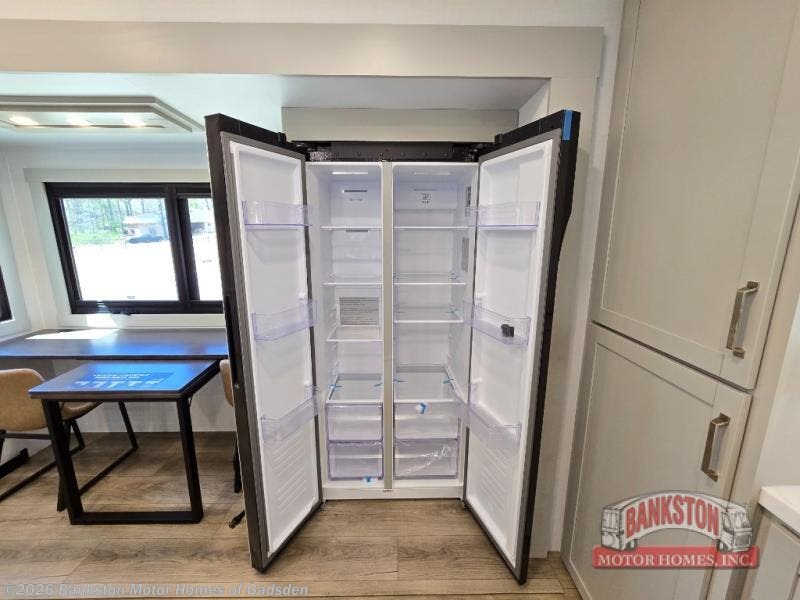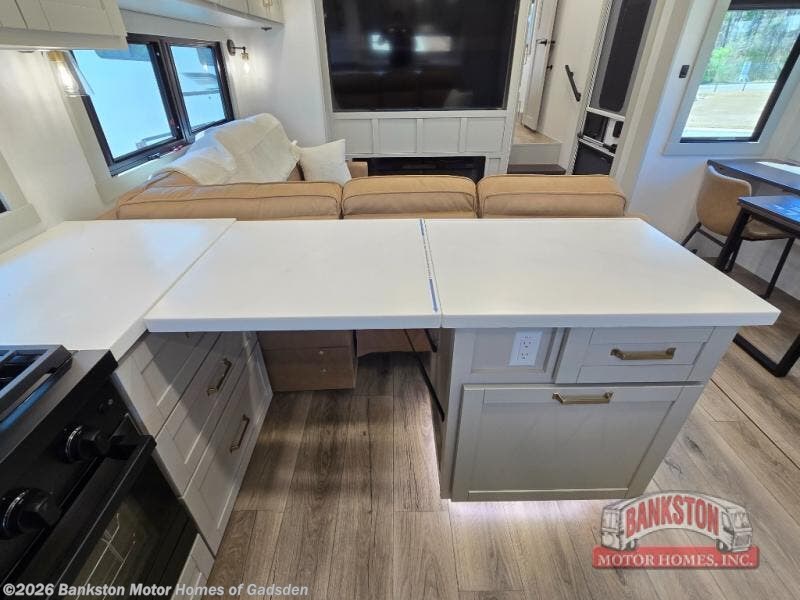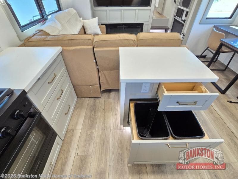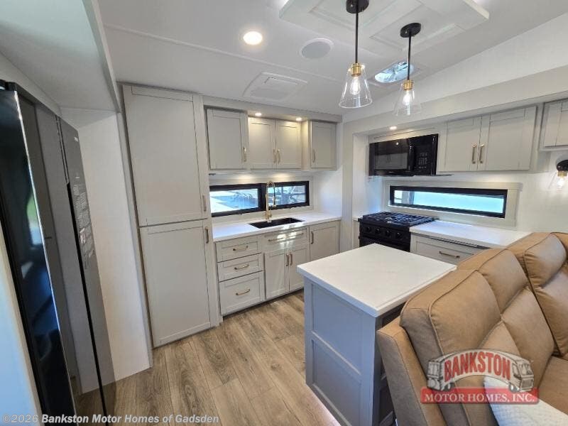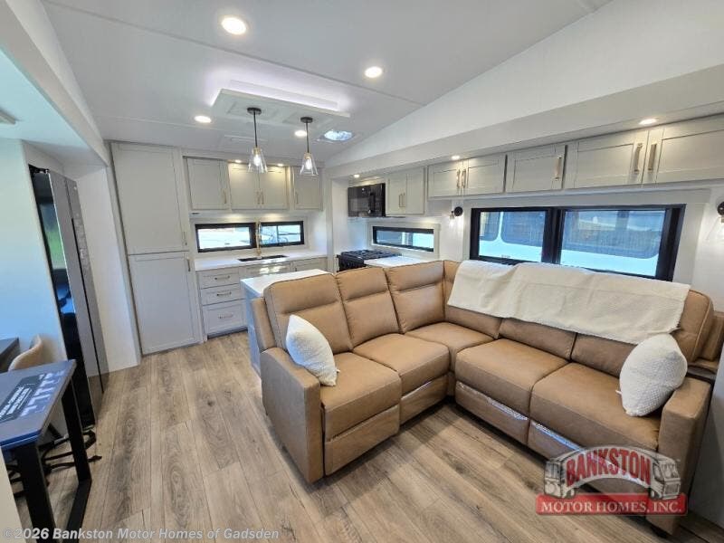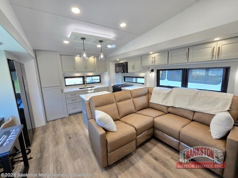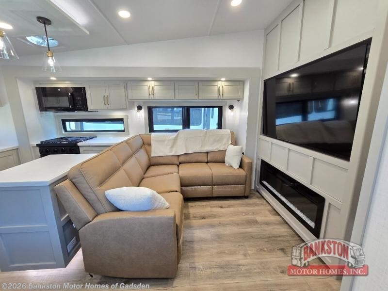Featuring a spacious L-sofa with four recliners and a 65” articulating TV for endless entertainment, this fifth wheel is a great option to get on the road! The convertible dining table/L desk seats up to four people, making it perfect for meals, work, or play. You can cozy up by the fireplace and enjoy quality time with loved ones. Plus, ample shoe storage keeps your gear organized. The kitchen is equipped with solid surface countertops, dishwasher prep, a residential microwave, and a three-burner cooktop. Also, the large pantry with pull-out drawers provides ample storage for your favorite ingredients and cooking essentials. The one-piece fiberglass shower is a highlight of the bathroom, offering a convenient space to get ready, and additional storage is provided by the linen closet. And you will love the front main bedroom featuring a residential queen memory foam mattress with nightstands, outlets, and USB & USB-C ports for convenient charging.