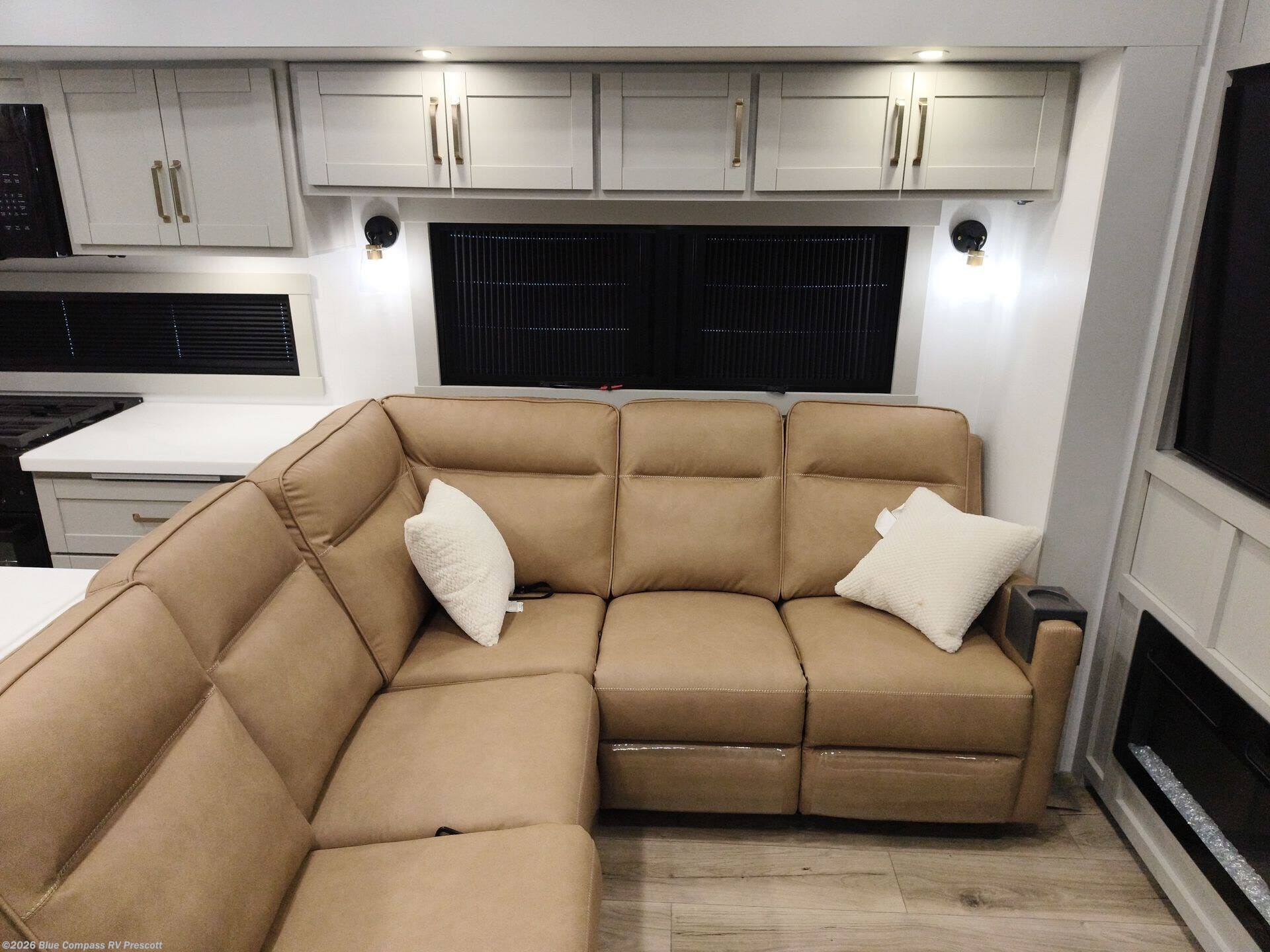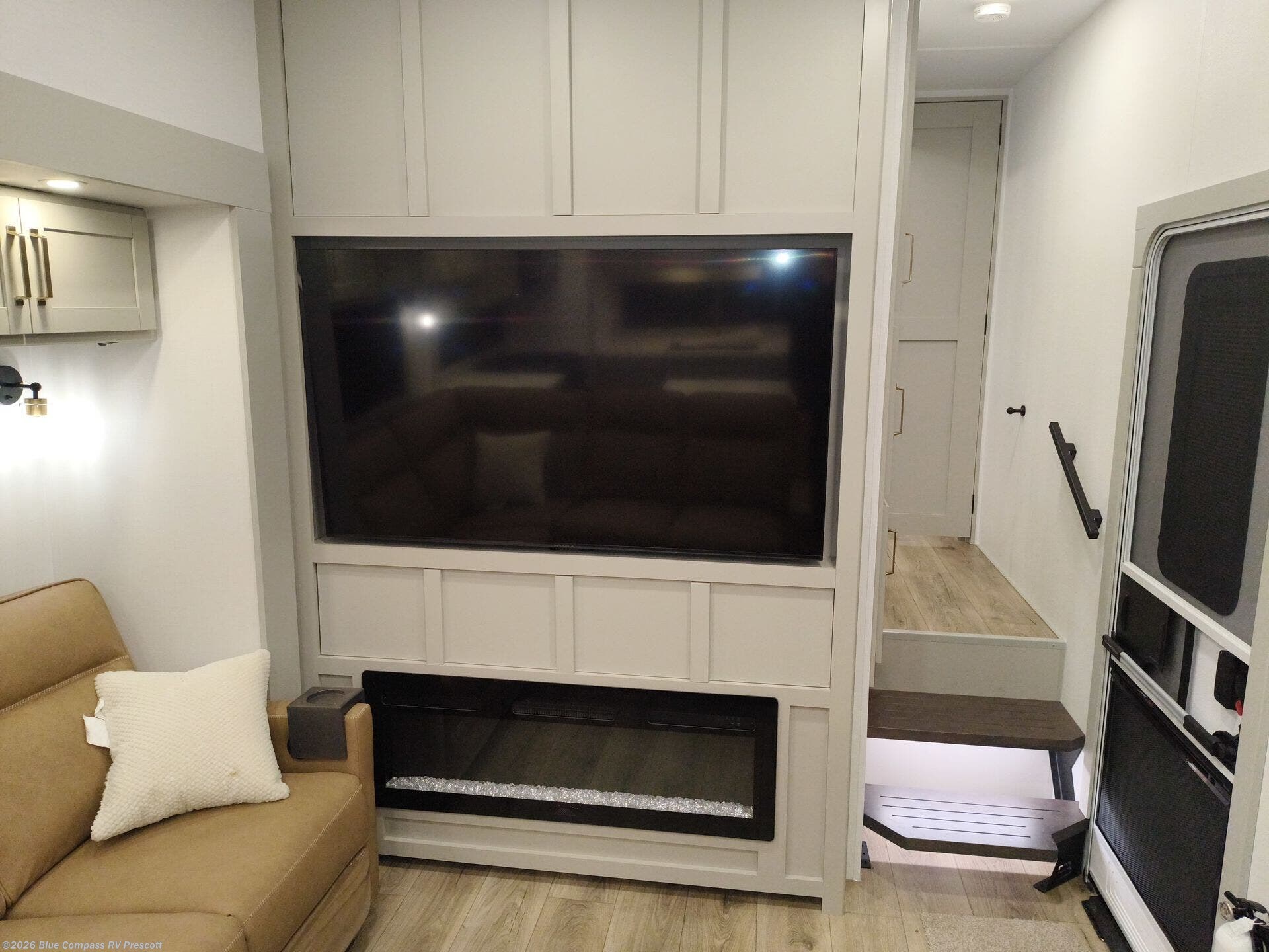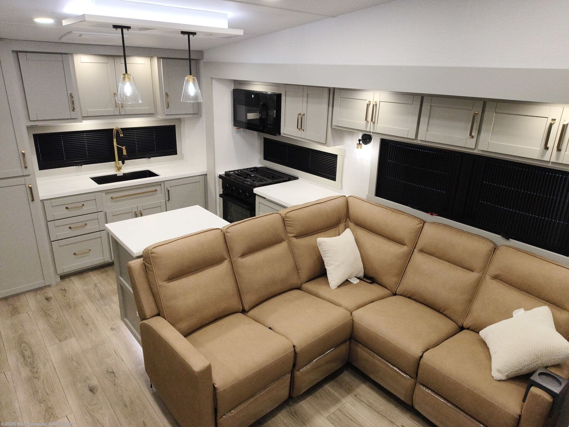 Featuring a spacious L-sofa with four recliners and a 65” articulating TV for endless entertainment, this fifth wheel is a great option to get on the road! The convertible dining table/L desk seats up to four people, making it perfect for meals, work, or play. You can cozy up by the fireplace and enjoy quality time with loved ones. Plus, ample shoe storage keeps your gear organized. The kitchen is equipped with solid surface countertops, dishwasher prep, a residential microwave, and a three-burner cooktop. Also, the large pantry with pull-out drawers provides ample storage for your favorite ingredients and cooking essentials. The one-piece fiberglass shower is a highlight of the bathroom, offering a convenient space to get ready, and additional storage is provided by the linen closet. And you will love the front main bedroom featuring a residential queen memory foam mattress with nightstands, outlets, and USB & USB-C ports for convenient charging.