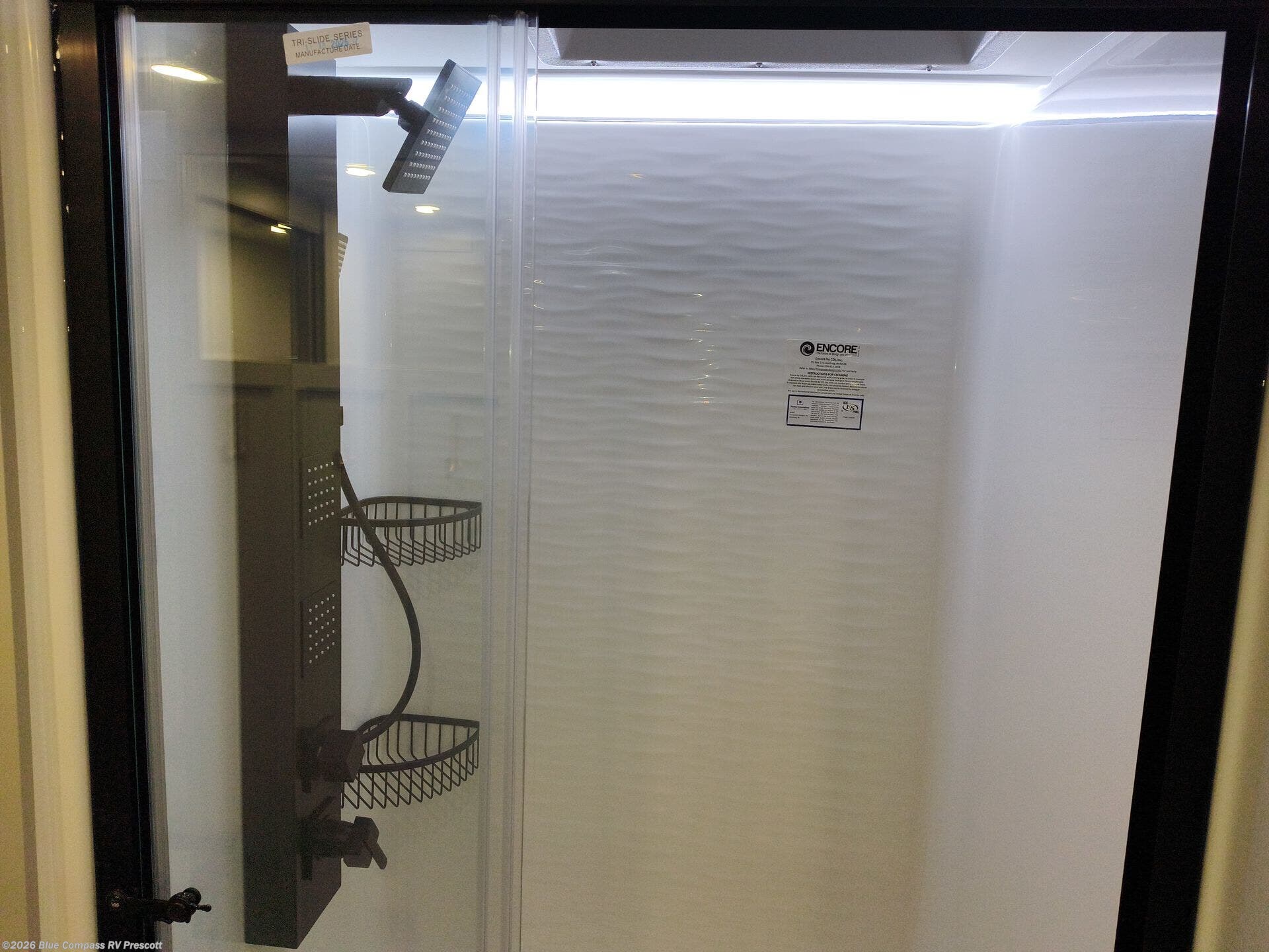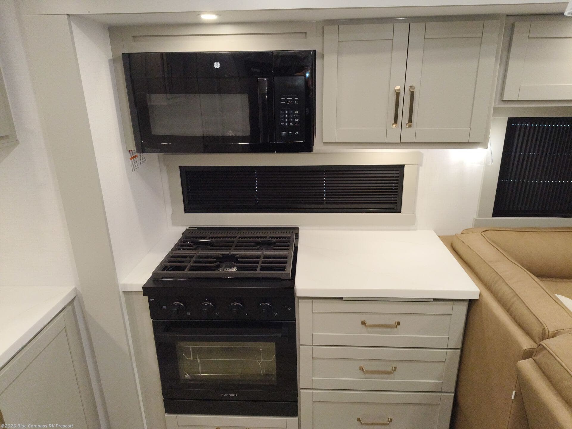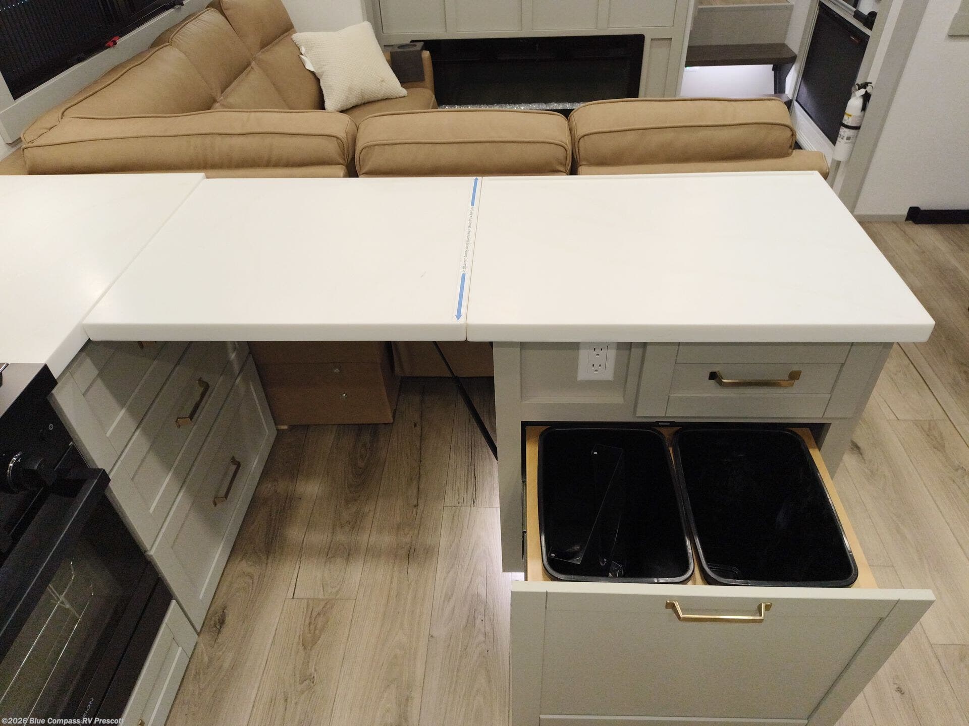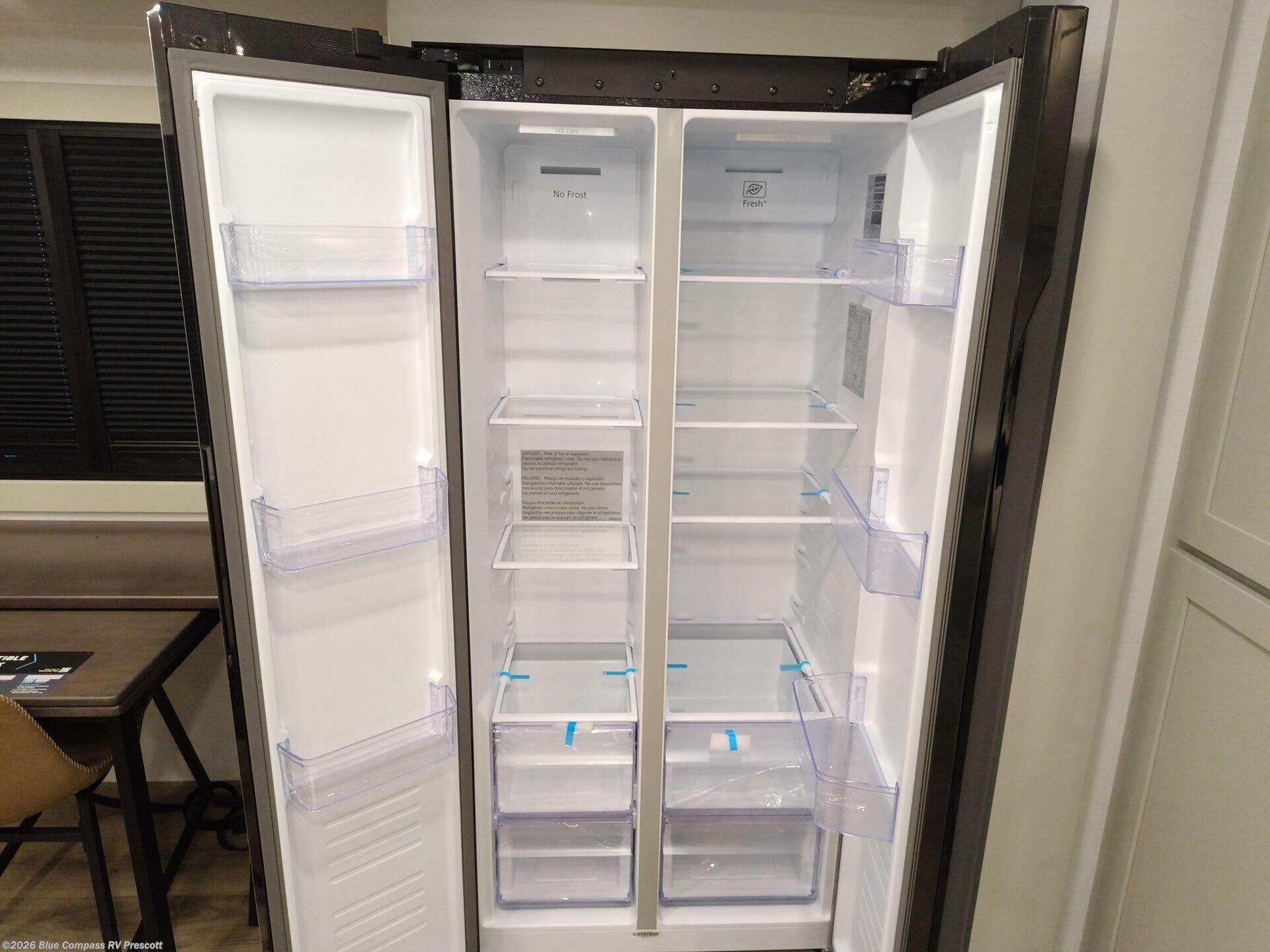 Featuring a spacious L-sofa with four recliners and a 65” articulating TV for endless entertainment, this fifth wheel is a great option to get on the road! The convertible dining table/L desk seats up to four people, making it perfect for meals, work, or play. You can cozy up by the fireplace and enjoy quality time with loved ones. Plus, ample shoe storage keeps your gear organized. The kitchen is equipped with solid surface countertops, dishwasher prep, a residential microwave, and a three-burner cooktop. Also, the large pantry with pull-out drawers provides ample storage for your favorite ingredients and cooking essentials. The one-piece fiberglass shower is a highlight of the bathroom, offering a convenient space to get ready, and additional storage is provided by the linen closet. And you will love the front main bedroom featuring a residential queen memory foam mattress with nightstands, outlets, and USB & USB-C ports for convenient charging.