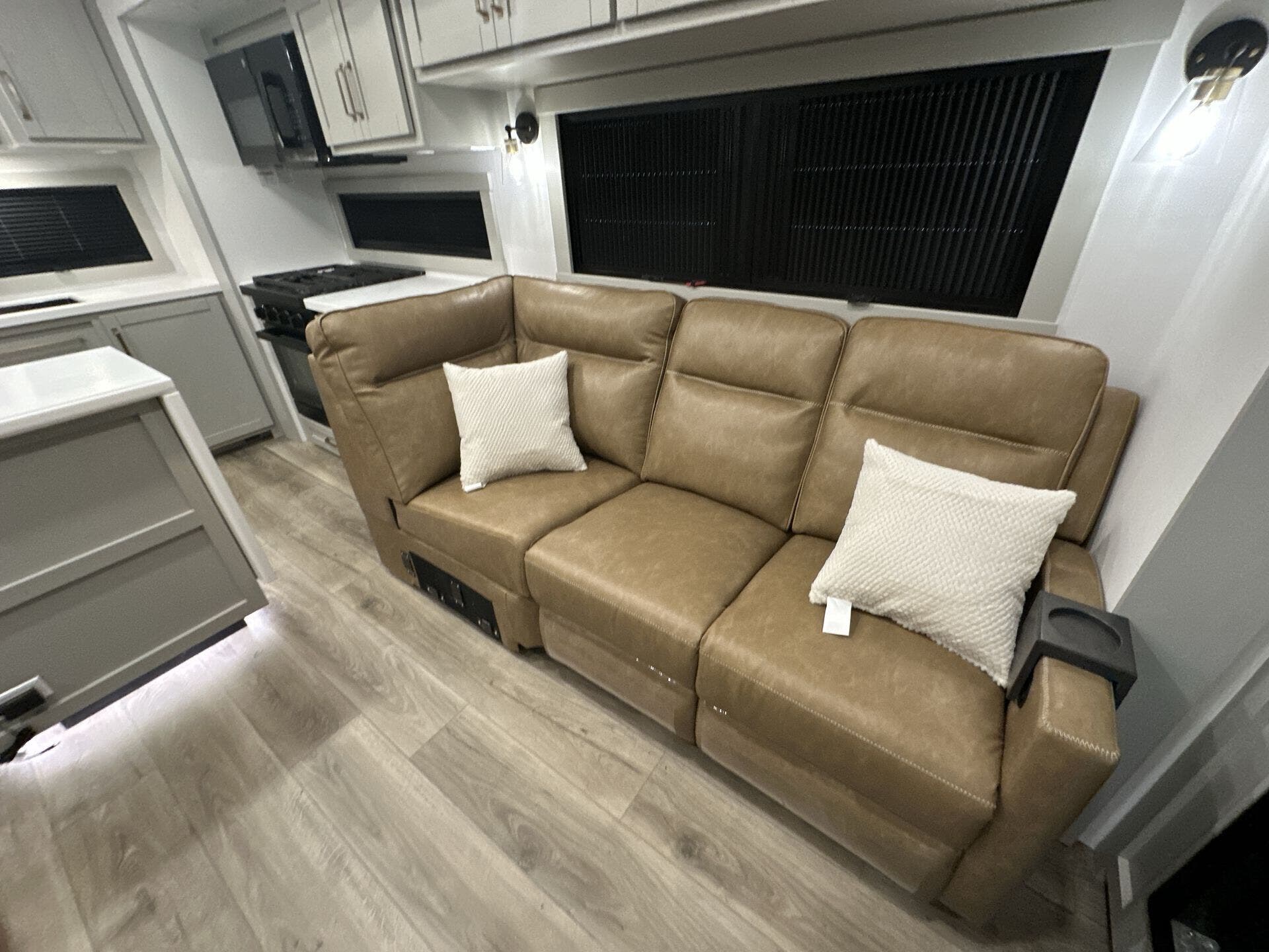 Featuring a spacious L-sofa with four recliners and a 65” articulating TV for endless entertainment, this fifth wheel is a great option to get on the road! The convertible dining table/L desk seats up to four people, making it perfect for meals, work, or play. You can cozy up by the fireplace and enjoy quality time with loved ones. Plus, ample shoe storage keeps your gear organized. The kitchen is equipped with solid surface countertops, dishwasher prep, a residential microwave, and a three-burner cooktop. Also, the large pantry with pull-out drawers provides ample storage for your favorite ingredients and cooking essentials. The one-piece fiberglass shower is a highlight of the bathroom, offering a convenient space to get ready, and additional storage is provided by the linen closet. And you will love the front main bedroom featuring a residential queen memory foam mattress with nightstands, outlets, and USB & USB-C ports for convenient charging.