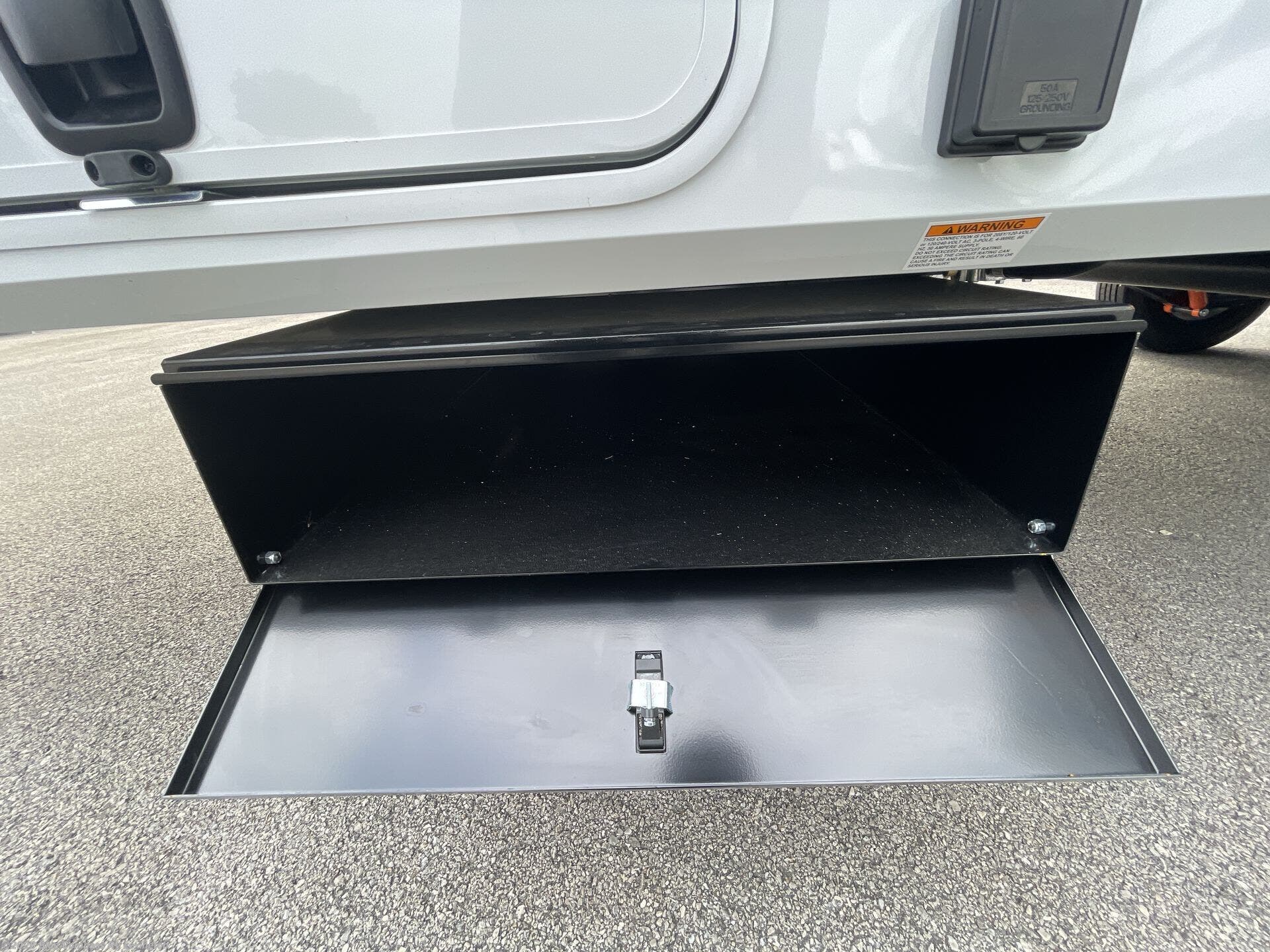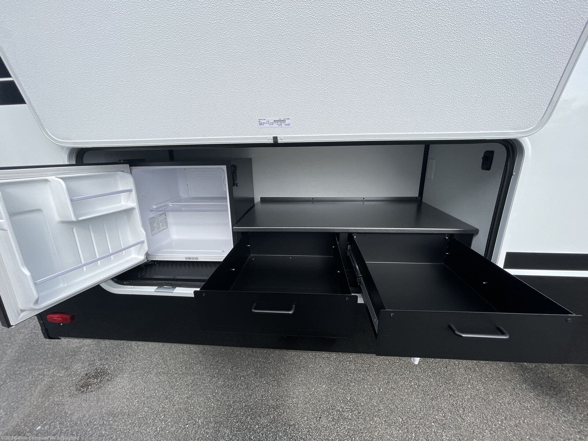 Start living your best camping life in this fifth wheel! The rear bunkhouse has an L shaped 72" x 92" x 32" top bunk above cubbies and a 44" x 72" bottom bunk, plus its very own private entrance/exit door to the unit. Just outside the bunkhouse is the kitchen which has everything you need to prepare your best home cooked meals including a flip-up countertop extension, a trash bin with Stow N' Go paper towel, and an area prepped for a dishwasher. Enjoy your delicious home cooked meals at the sliding dining/desk table then relax on either the 62" theater seating or 64" tri-fold sofa that extends into a 54" x 70" bed for more guests. As you step up the stairs to head up to the full bathroom and front private bedroom, you will notice that they have shoe storage to keep things tidy. Crank up the tunes with the exterior speakers and grab a cold beverage from the exterior refrigerator with storage drawers near it too!