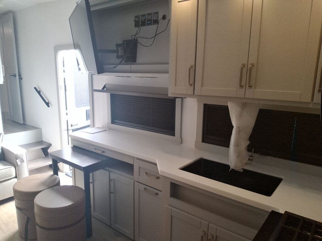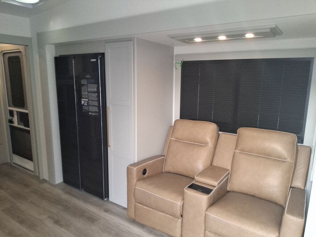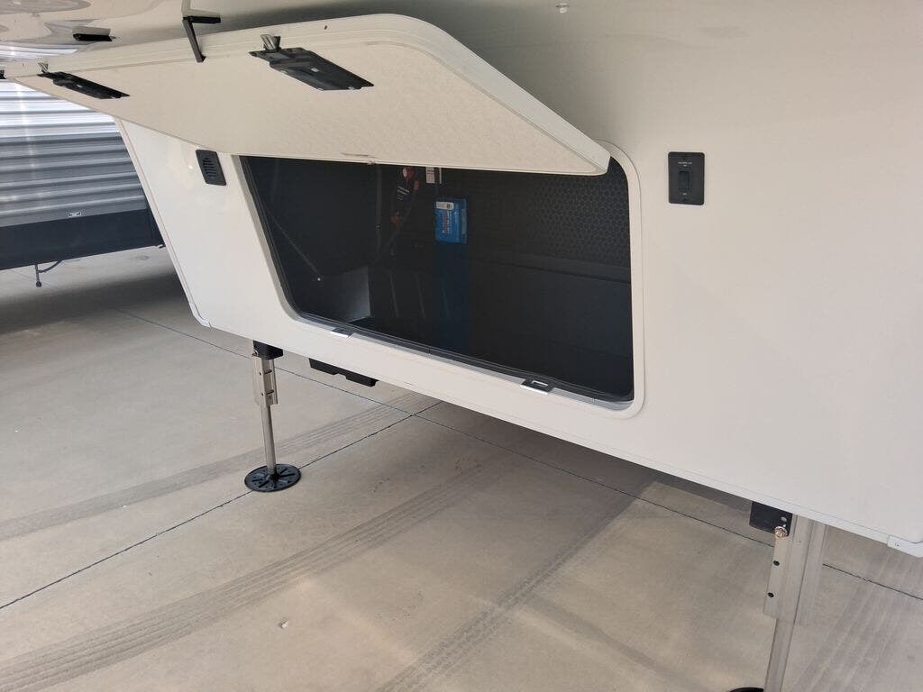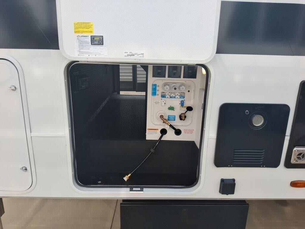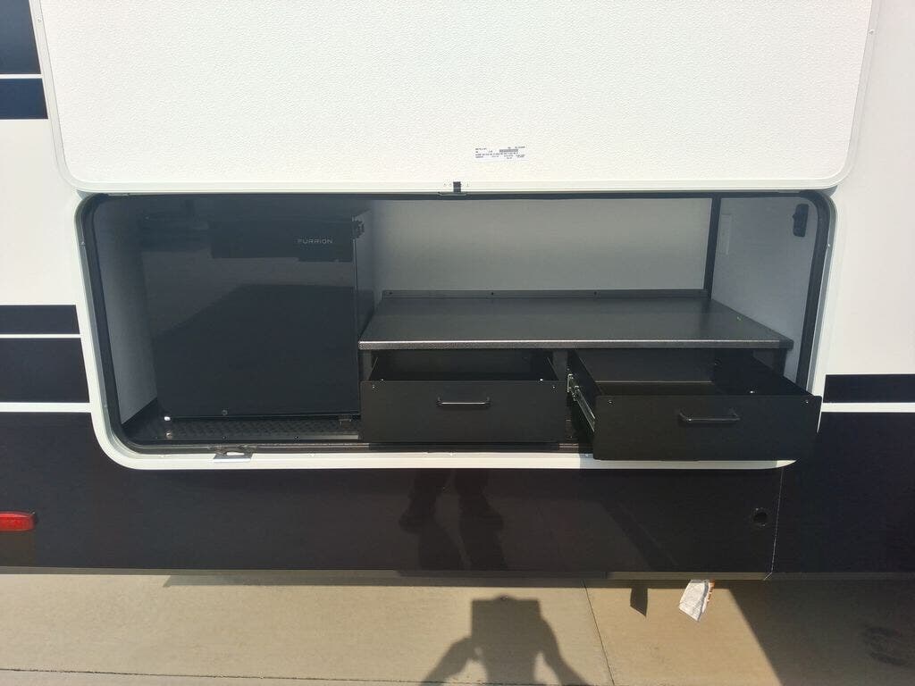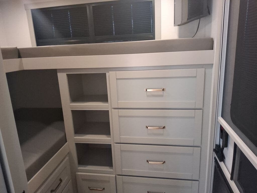Start living your best camping life in this fifth wheel! The rear bunkhouse has an L shaped 72" x 92" x 32" top bunk above cubbies and a 44" x 72" bottom bunk, plus its very own private entrance/exit door to the unit. Just outside the bunkhouse is the kitchen which has everything you need to prepare your best home cooked meals including a flip-up countertop extension, a trash bin with Stow N' Go paper towel, and an area prepped for a dishwasher. Enjoy your delicious home cooked meals at the sliding dining/desk table then relax on either the 62" theater seating or 64" tri-fold sofa that extends into a 54" x 70" bed for more guests. As you step up the stairs to head up to the full bathroom and front private bedroom, you will notice that they have shoe storage to keep things tidy. Crank up the tunes with the exterior speakers and grab a cold beverage from the exterior refrigerator with storage drawers near it too!