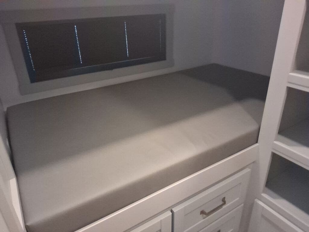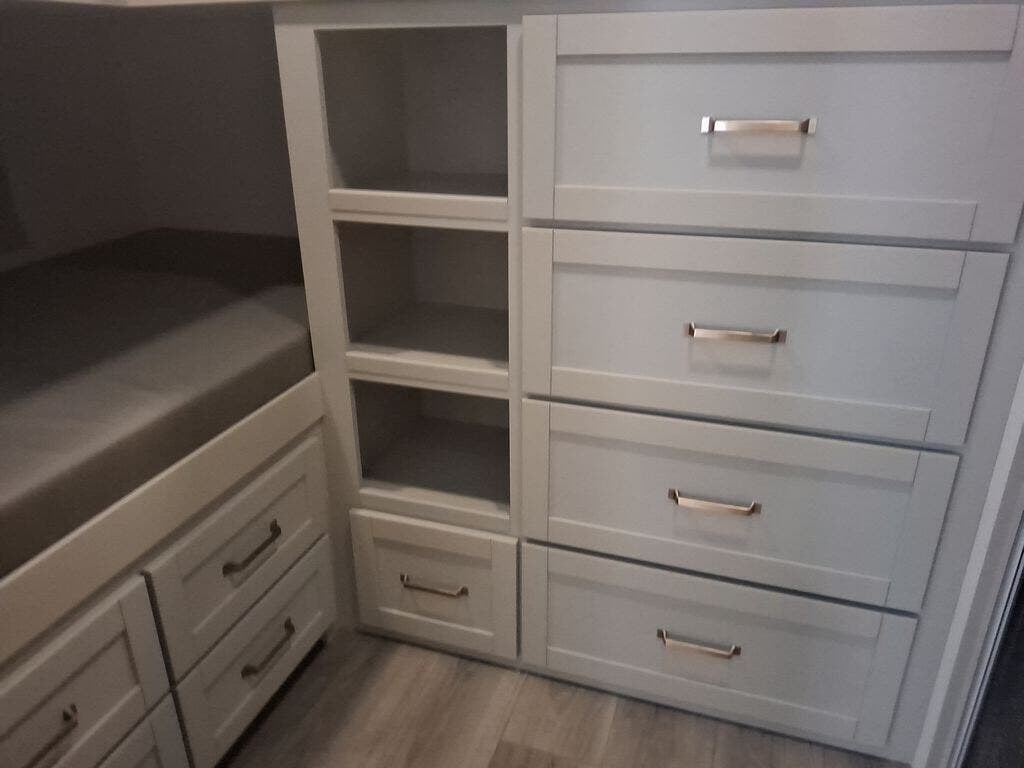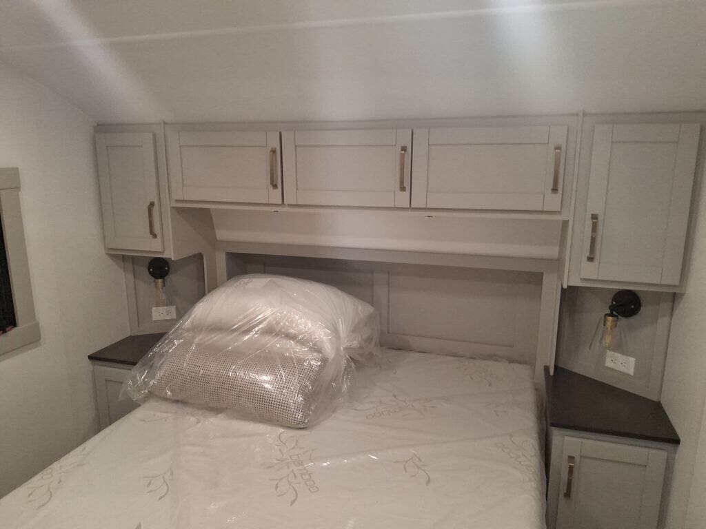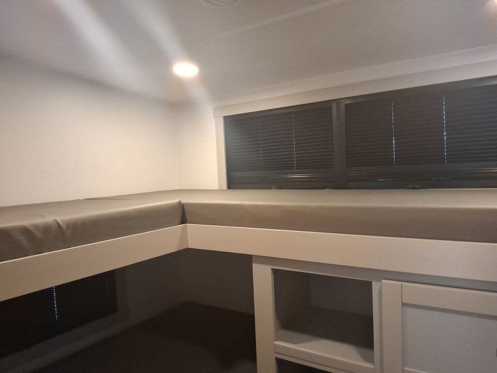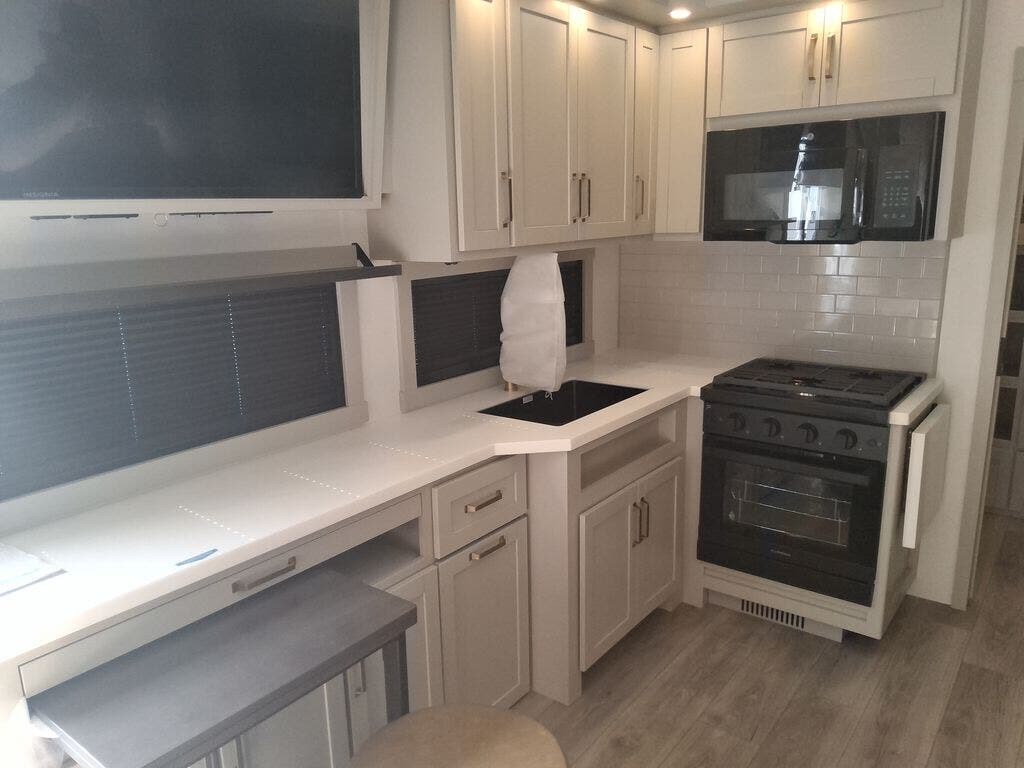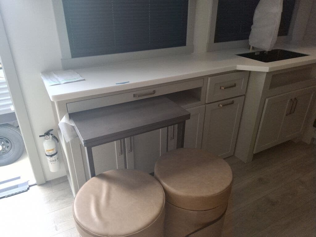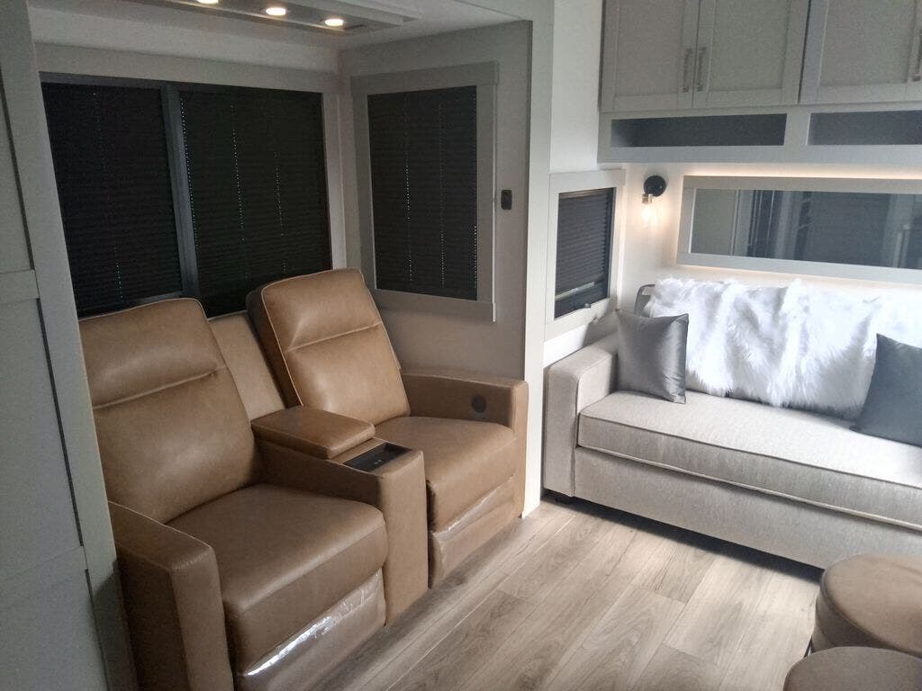 Start living your best camping life in this fifth wheel! The rear bunkhouse has an L shaped 72" x 92" x 32" top bunk above cubbies and a 44" x 72" bottom bunk, plus its very own private entrance/exit door to the unit. Just outside the bunkhouse is the kitchen which has everything you need to prepare your best home cooked meals including a flip-up countertop extension, a trash bin with Stow N' Go paper towel, and an area prepped for a dishwasher. Enjoy your delicious home cooked meals at the sliding dining/desk table then relax on either the 62" theater seating or 64" tri-fold sofa that extends into a 54" x 70" bed for more guests. As you step up the stairs to head up to the full bathroom and front private bedroom, you will notice that they have shoe storage to keep things tidy. Crank up the tunes with the exterior speakers and grab a cold beverage from the exterior refrigerator with storage drawers near it too!
