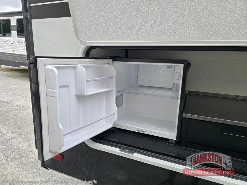 Start living your best camping life in this fifth wheel! The rear bunkhouse has an L shaped 72" x 92" x 32" top bunk above cubbies and a 44" x 72" bottom bunk, plus its very own private entrance/exit door to the unit. Just outside the bunkhouse is the kitchen which has everything you need to prepare your best home cooked meals including a flip-up countertop extension, a trash bin with Stow N' Go paper towel, and an area prepped for a dishwasher. Enjoy your delicious home cooked meals at the sliding dining/desk table then relax on either the 62" theater seating or 64" tri-fold sofa that extends into a 54" x 70" bed for more guests. As you step up the stairs to head up to the full bathroom and front private bedroom, you will notice that they have shoe storage to keep things tidy. Crank up the tunes with the exterior speakers and grab a cold beverage from the exterior refrigerator with storage drawers near it too!