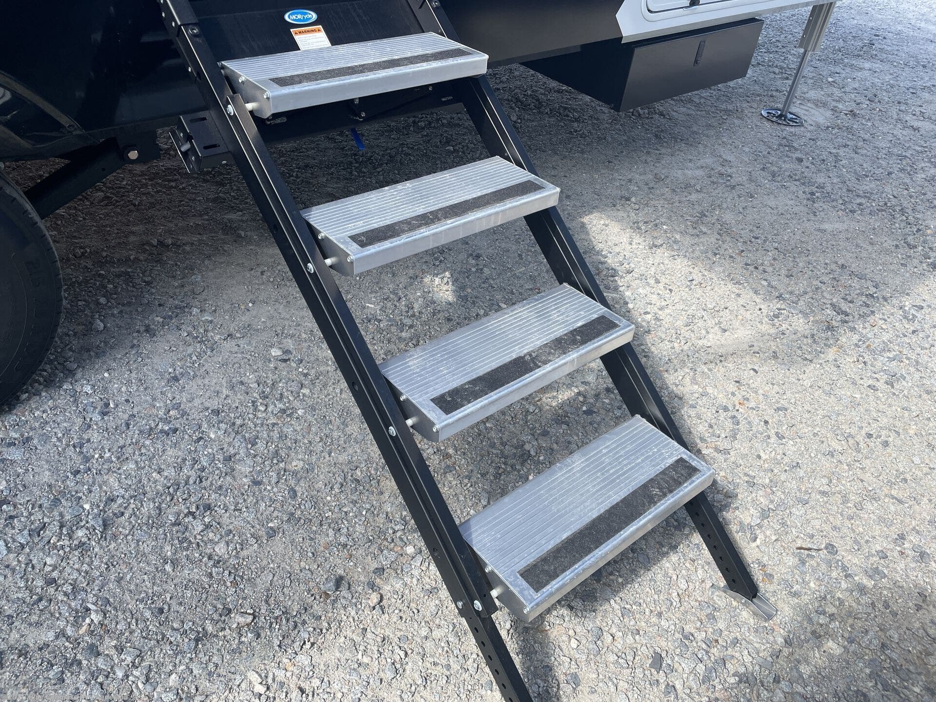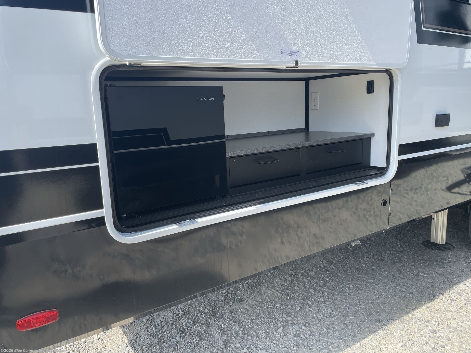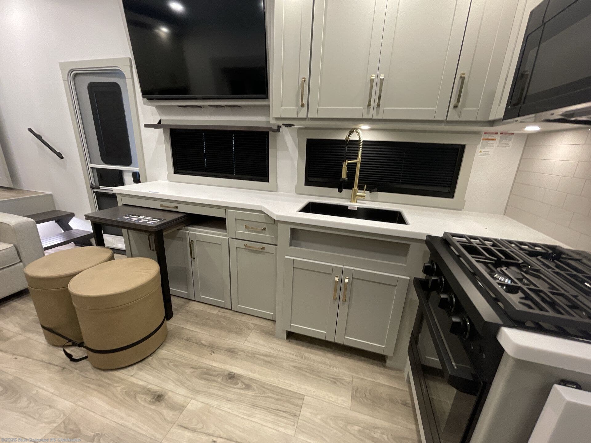 Start living your best camping life in this fifth wheel! The rear bunkhouse has an L shaped 72" x 92" x 32" top bunk above cubbies and a 44" x 72" bottom bunk, plus its very own private entrance/exit door to the unit. Just outside the bunkhouse is the kitchen which has everything you need to prepare your best home cooked meals including a flip-up countertop extension, a trash bin with Stow N' Go paper towel, and an area prepped for a dishwasher. Enjoy your delicious home cooked meals at the sliding dining/desk table then relax on either the 62" theater seating or 64" tri-fold sofa that extends into a 54" x 70" bed for more guests. As you step up the stairs to head up to the full bathroom and front private bedroom, you will notice that they have shoe storage to keep things tidy. Crank up the tunes with the exterior speakers and grab a cold beverage from the exterior refrigerator with storage drawers near it too!