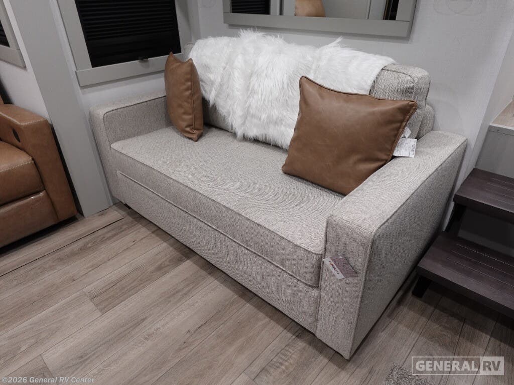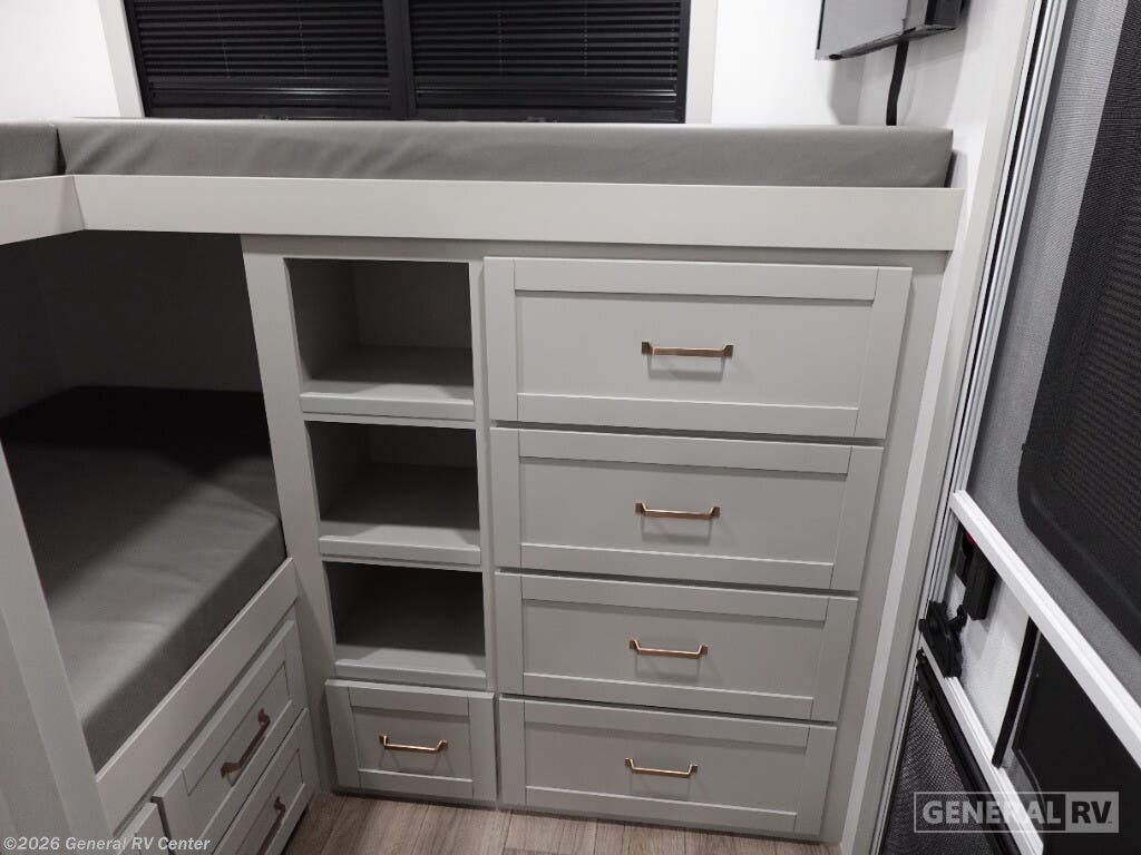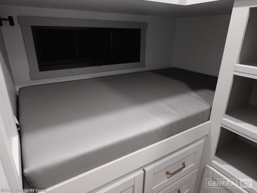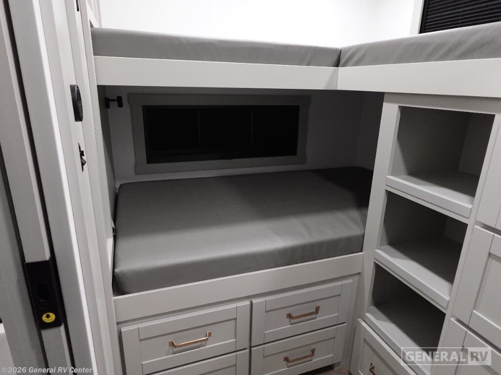 The 2026 Brinkley Model Z 2810 is a 34'9" luxury fifth wheel designed for families seeking comfort and functionality. It features a private bunkroom with a large bottom bunk, an extra-large L-shaped top bunk, and storage drawers, accommodating up to seven people. The living area includes a 64" tri-fold sofa, a sliding desk/dining table with a storage drawer, and a 50” articulating TV with Rockford stereo system prep. The kitchen boasts solid surface countertops, dishwasher prep, and premium residential cabinets with dovetail joints. Built on tandem 7,000 lb axles with 17.5” H-rated tires, it offers a GVWR of 14,995 lbs and a dry weight of 11,834 lbs. Additional features include two entry/exit doors, a 30" x 42" shower, and ample storage throughout, making it ideal for both weekend getaways and full-time living