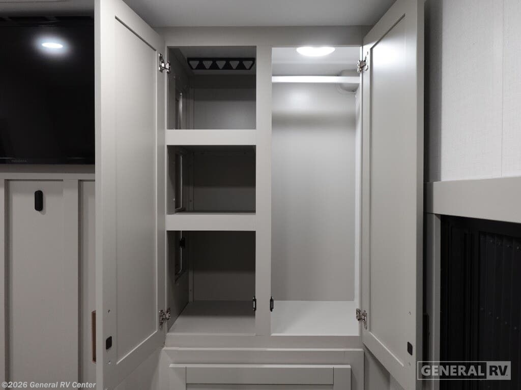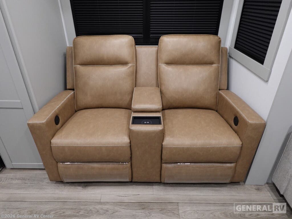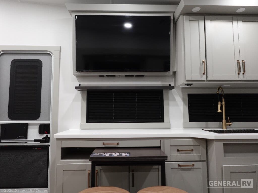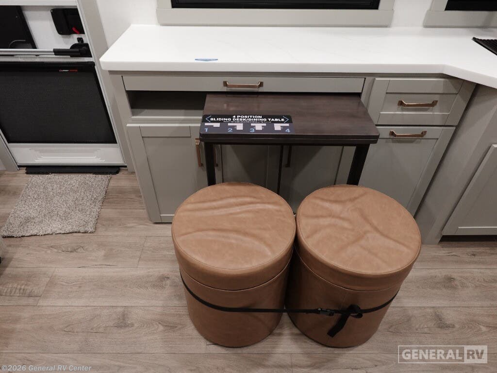 The 2026 Brinkley Model Z 2810 is a 34'9" luxury fifth wheel designed for families seeking comfort and functionality. It features a private bunkroom with a large bottom bunk, an extra-large L-shaped top bunk, and storage drawers, accommodating up to seven people. The living area includes a 64" tri-fold sofa, a sliding desk/dining table with a storage drawer, and a 50” articulating TV with Rockford stereo system prep. The kitchen boasts solid surface countertops, dishwasher prep, and premium residential cabinets with dovetail joints. Built on tandem 7,000 lb axles with 17.5” H-rated tires, it offers a GVWR of 14,995 lbs and a dry weight of 11,834 lbs. Additional features include two entry/exit doors, a 30" x 42" shower, and ample storage throughout, making it ideal for both weekend getaways and full-time living