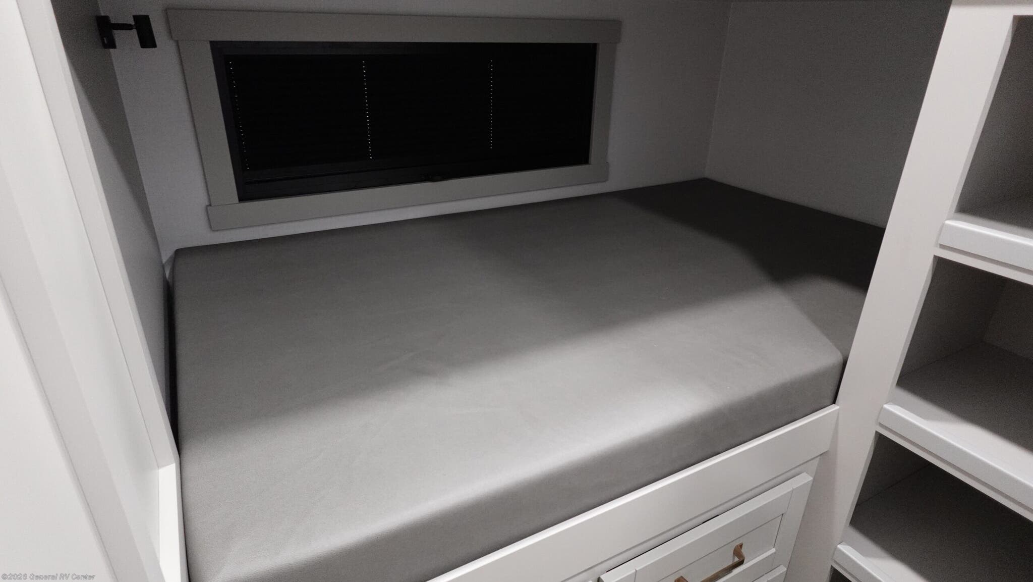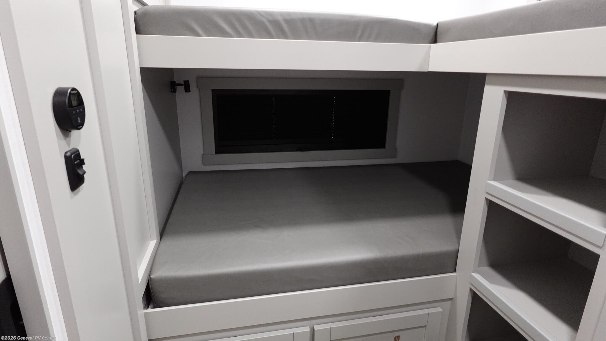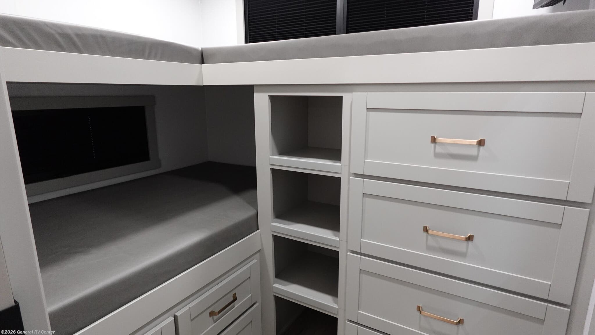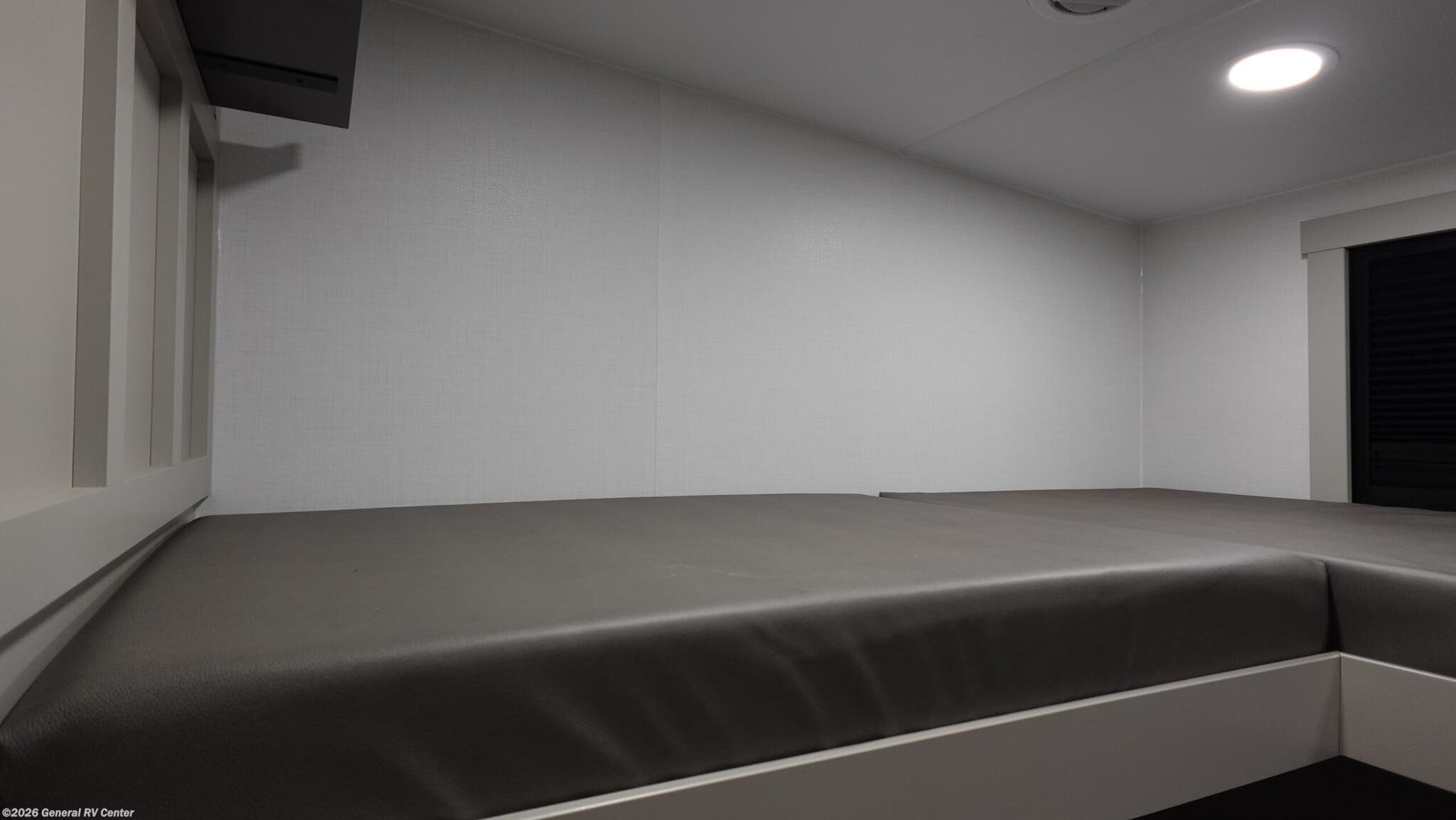 The 2026 Brinkley Model Z 2810 is a 34'9" luxury fifth wheel designed for families seeking comfort and functionality. It features a private bunkroom with a large bottom bunk, an extra-large L-shaped top bunk, and storage drawers, accommodating up to seven people. The living area includes a 64" tri-fold sofa, a sliding desk/dining table with a storage drawer, and a 50” articulating TV with Rockford stereo system prep. The kitchen boasts solid surface countertops, dishwasher prep, and premium residential cabinets with dovetail joints. Built on tandem 7,000 lb axles with 17.5” H-rated tires, it offers a GVWR of 14,995 lbs and a dry weight of 11,834 lbs. Additional features include two entry/exit doors, a 30" x 42" shower, and ample storage throughout, making it ideal for both weekend getaways and full-time living