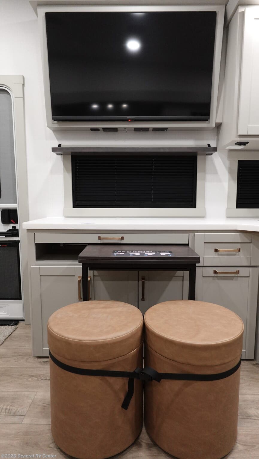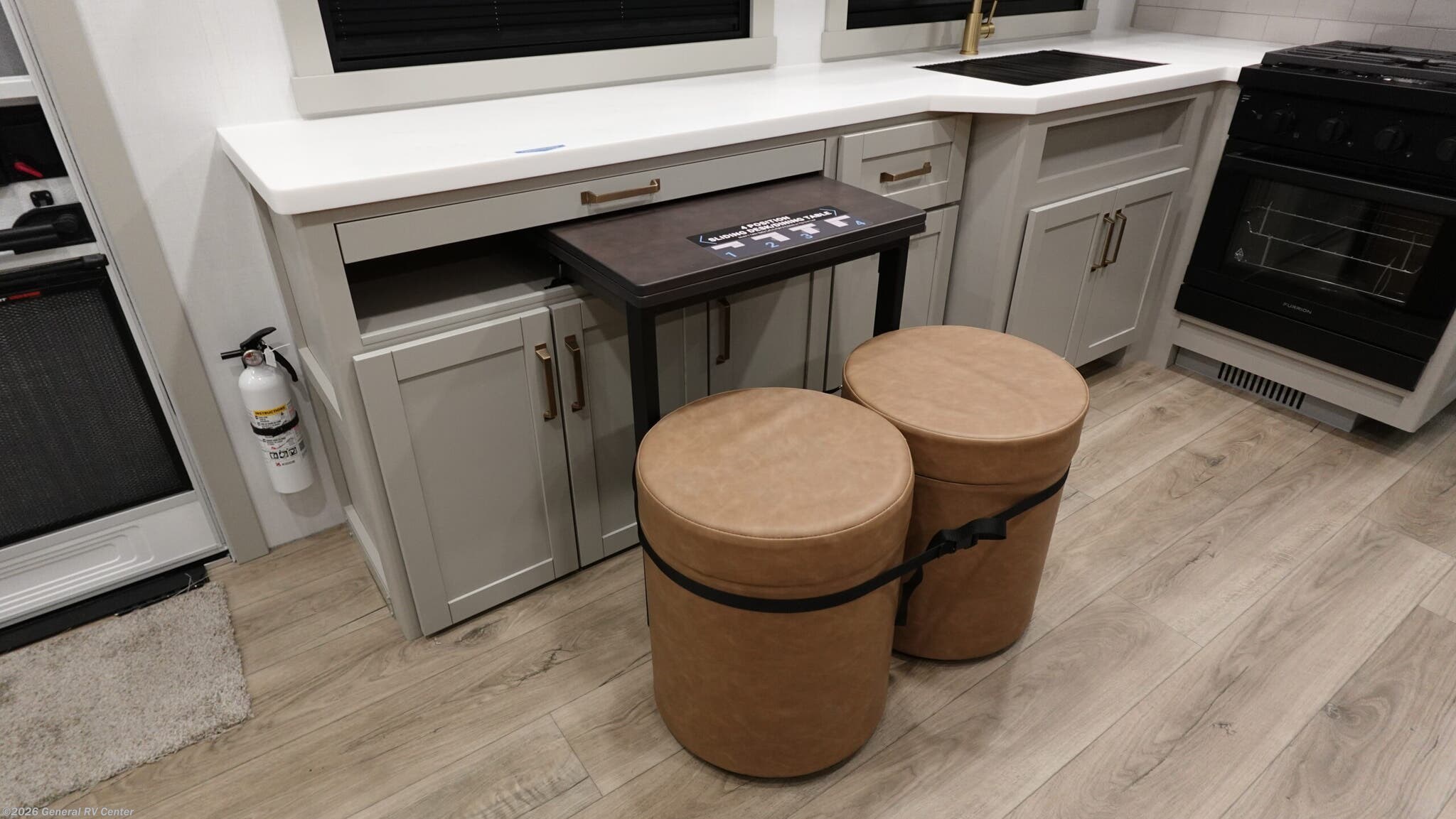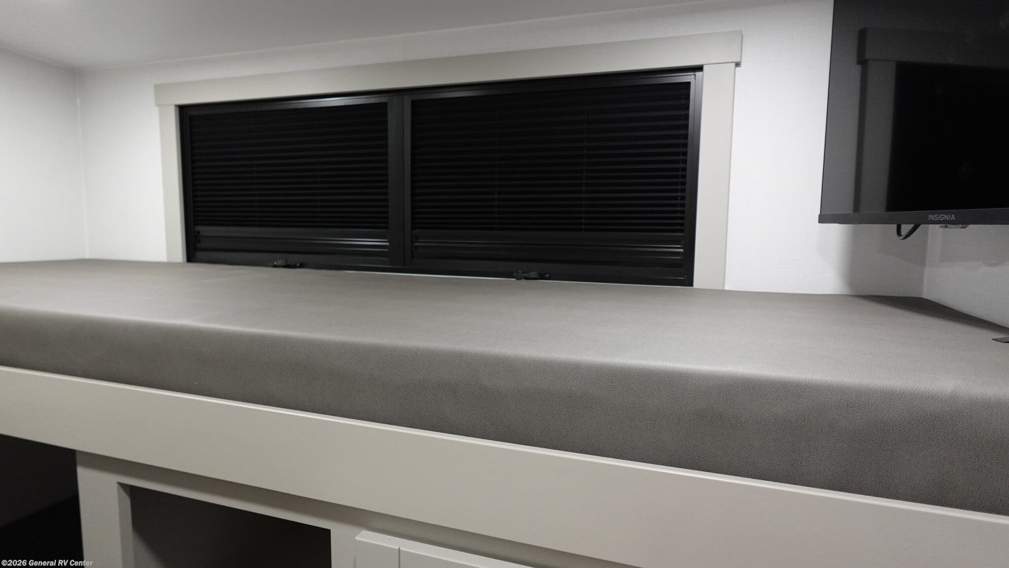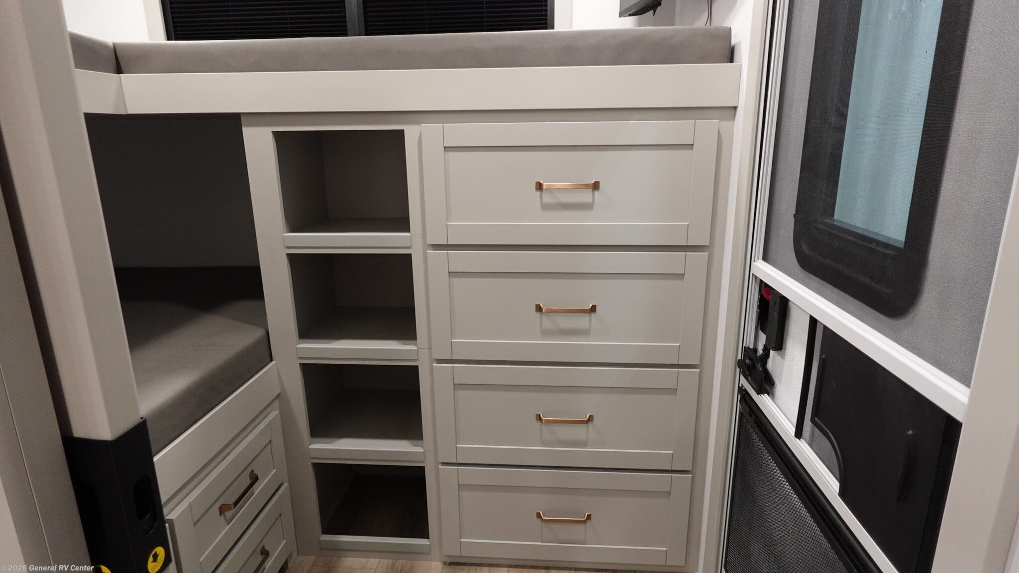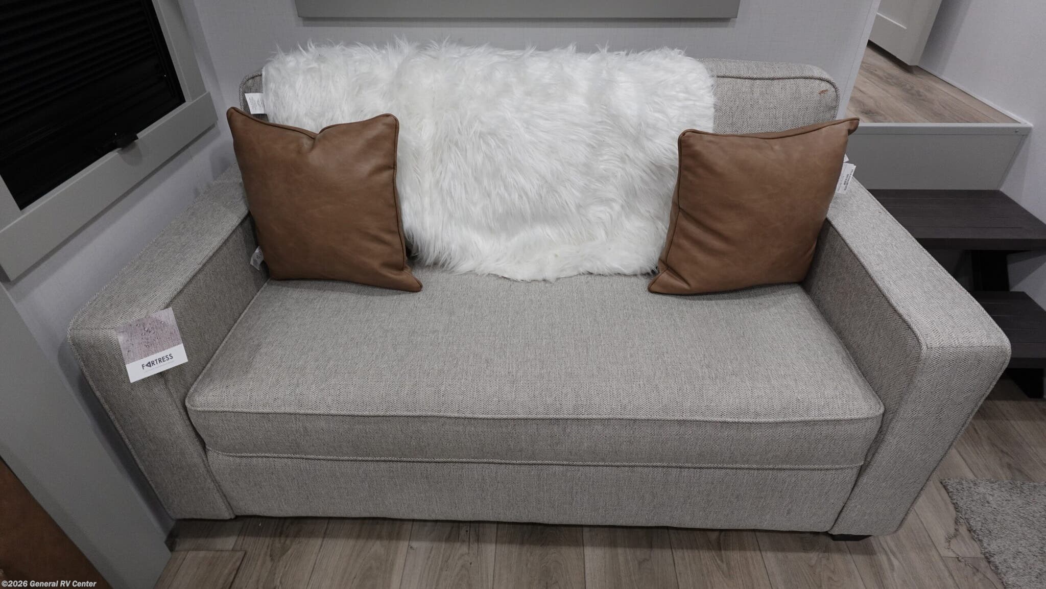 The 2026 Brinkley Model Z 2810 is a 34'9" luxury fifth wheel designed for families seeking comfort and functionality. It features a private bunkroom with a large bottom bunk, an extra-large L-shaped top bunk, and storage drawers, accommodating up to seven people. The living area includes a 64" tri-fold sofa, a sliding desk/dining table with a storage drawer, and a 50” articulating TV with Rockford stereo system prep. The kitchen boasts solid surface countertops, dishwasher prep, and premium residential cabinets with dovetail joints. Built on tandem 7,000 lb axles with 17.5” H-rated tires, it offers a GVWR of 14,995 lbs and a dry weight of 11,834 lbs. Additional features include two entry/exit doors, a 30" x 42" shower, and ample storage throughout, making it ideal for both weekend getaways and full-time living