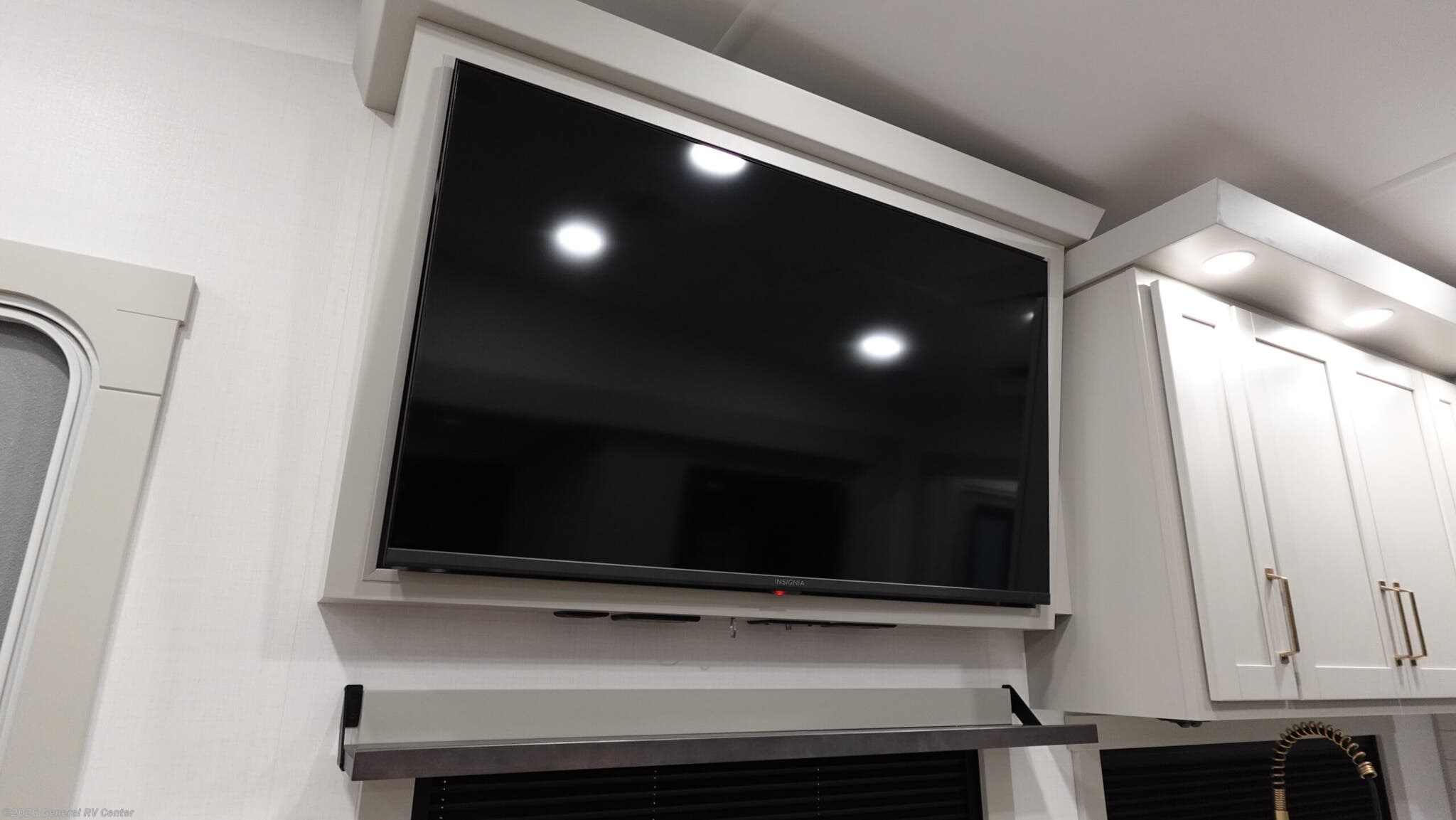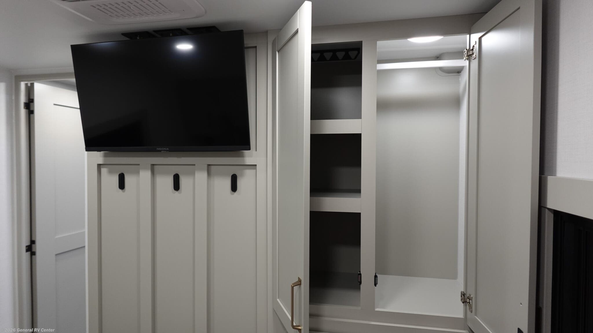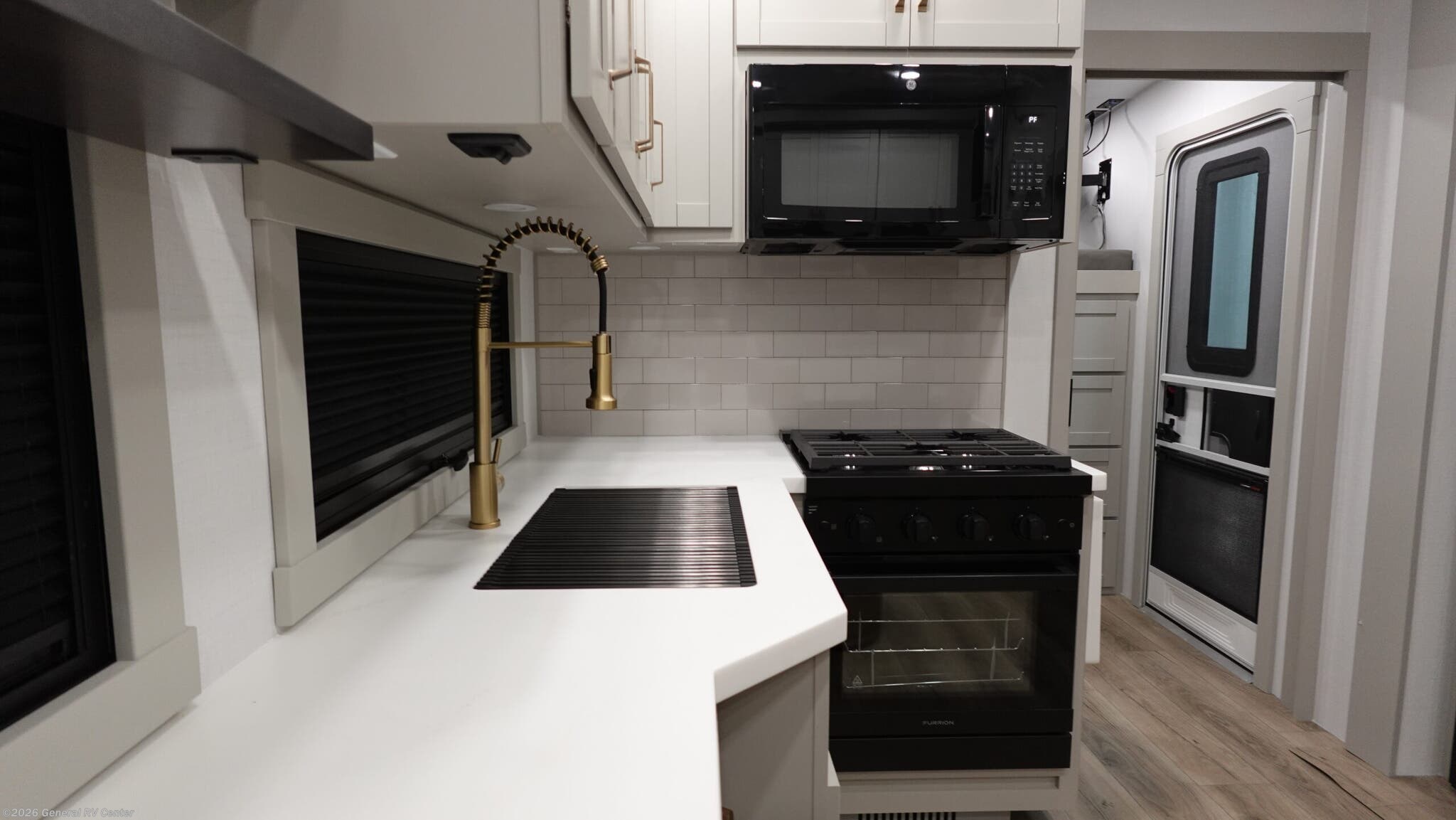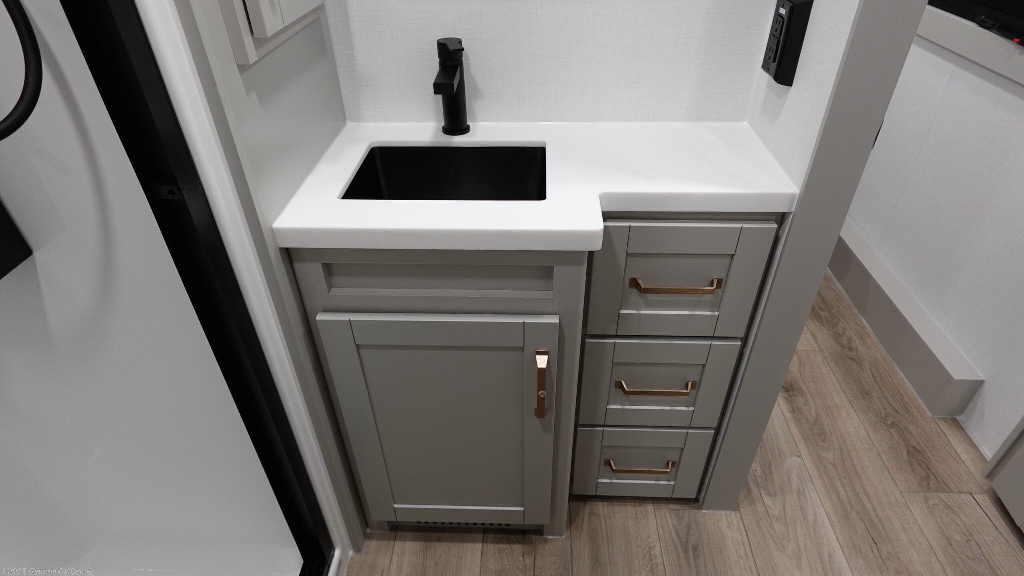 The 2026 Brinkley Model Z 2810 is a 34'9" luxury fifth wheel designed for families seeking comfort and functionality. It features a private bunkroom with a large bottom bunk, an extra-large L-shaped top bunk, and storage drawers, accommodating up to seven people. The living area includes a 64" tri-fold sofa, a sliding desk/dining table with a storage drawer, and a 50” articulating TV with Rockford stereo system prep. The kitchen boasts solid surface countertops, dishwasher prep, and premium residential cabinets with dovetail joints. Built on tandem 7,000 lb axles with 17.5” H-rated tires, it offers a GVWR of 14,995 lbs and a dry weight of 11,834 lbs. Additional features include two entry/exit doors, a 30" x 42" shower, and ample storage throughout, making it ideal for both weekend getaways and full-time living