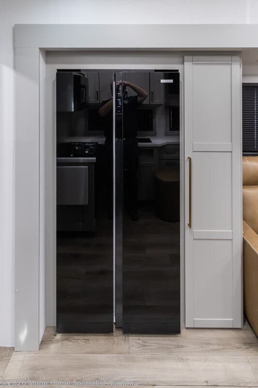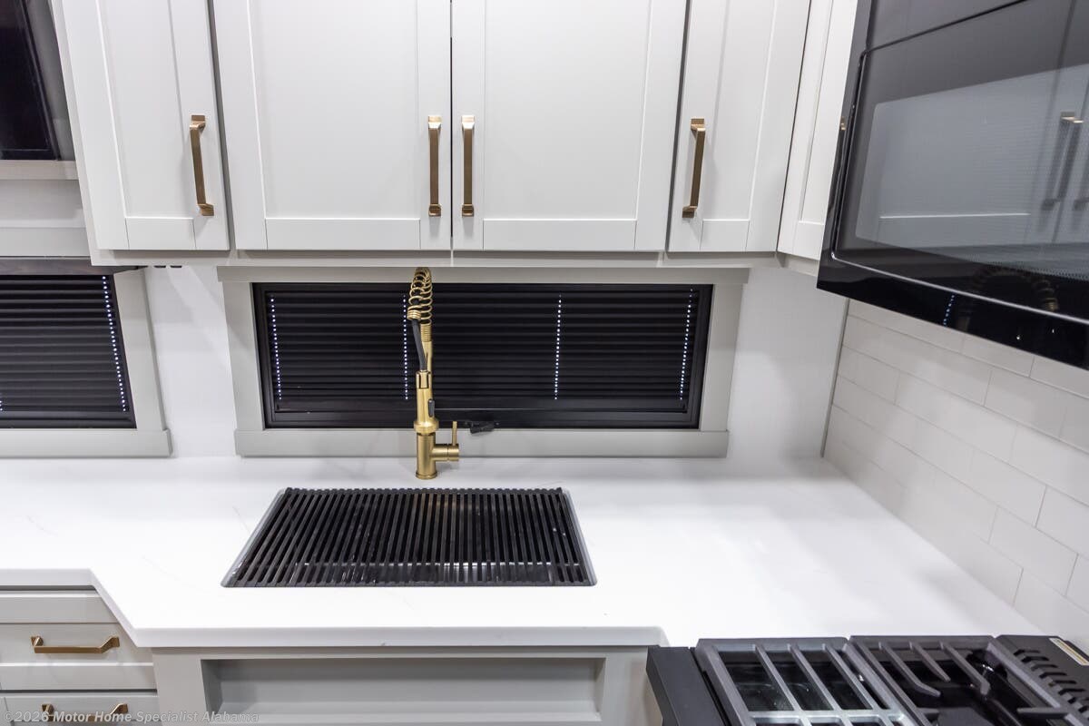 More About This RV This RV features Lippert hydraulic leveling, aluminum wheels, 3 A/C's, keyless entry, patio awning, pass through storage, LED running lights, black tank flush, exterior freezer, exterior shower, ladder, solar, 7 foot ceiling, hardwood cabinets, residential refrigerator with ice maker, 3 burner gas range with oven, bunk beds, theater seats, private entry into bunk suite room from outside and exterior kitchen area and much more.