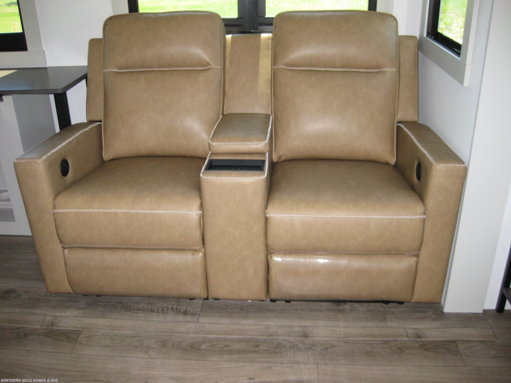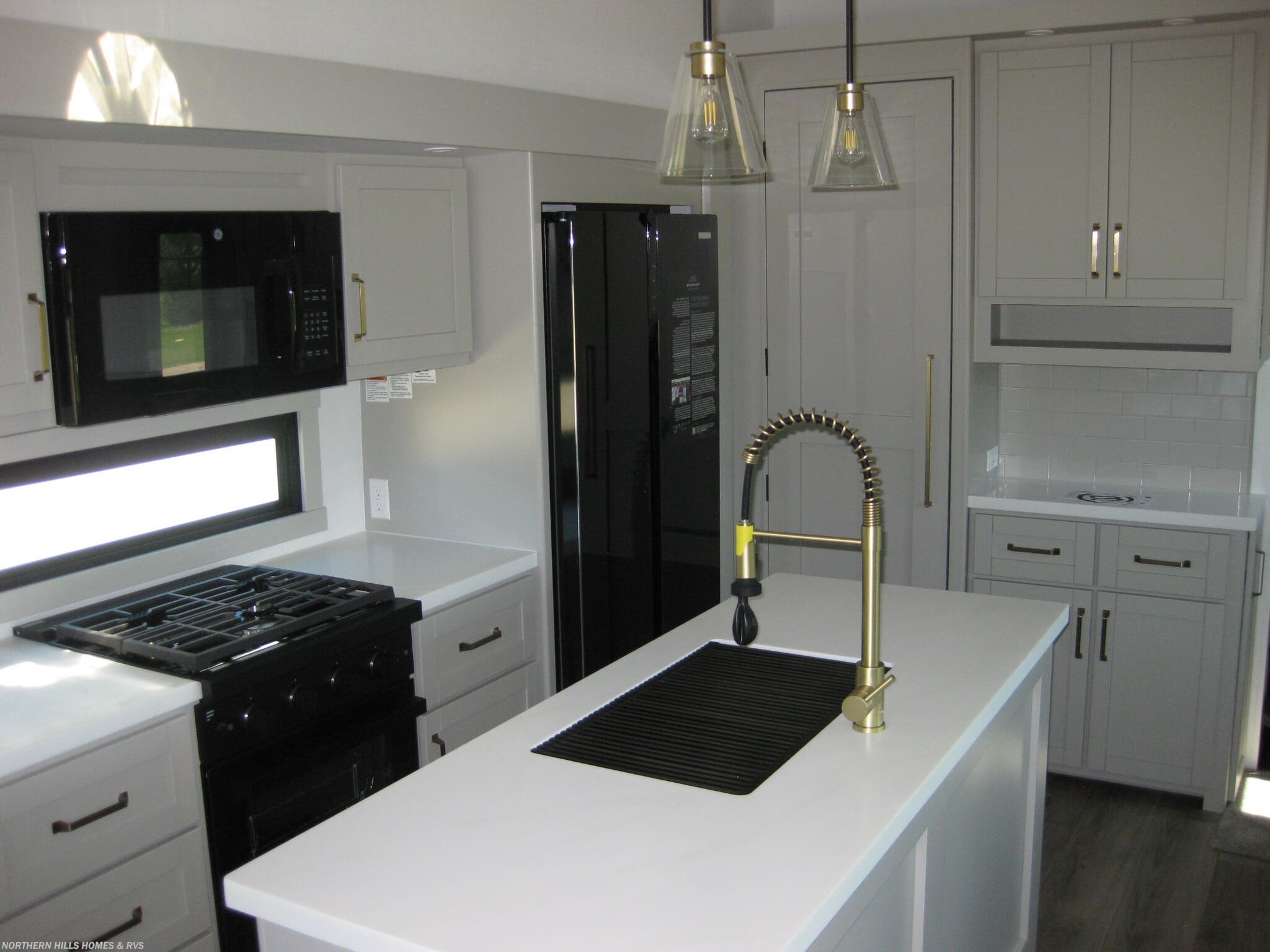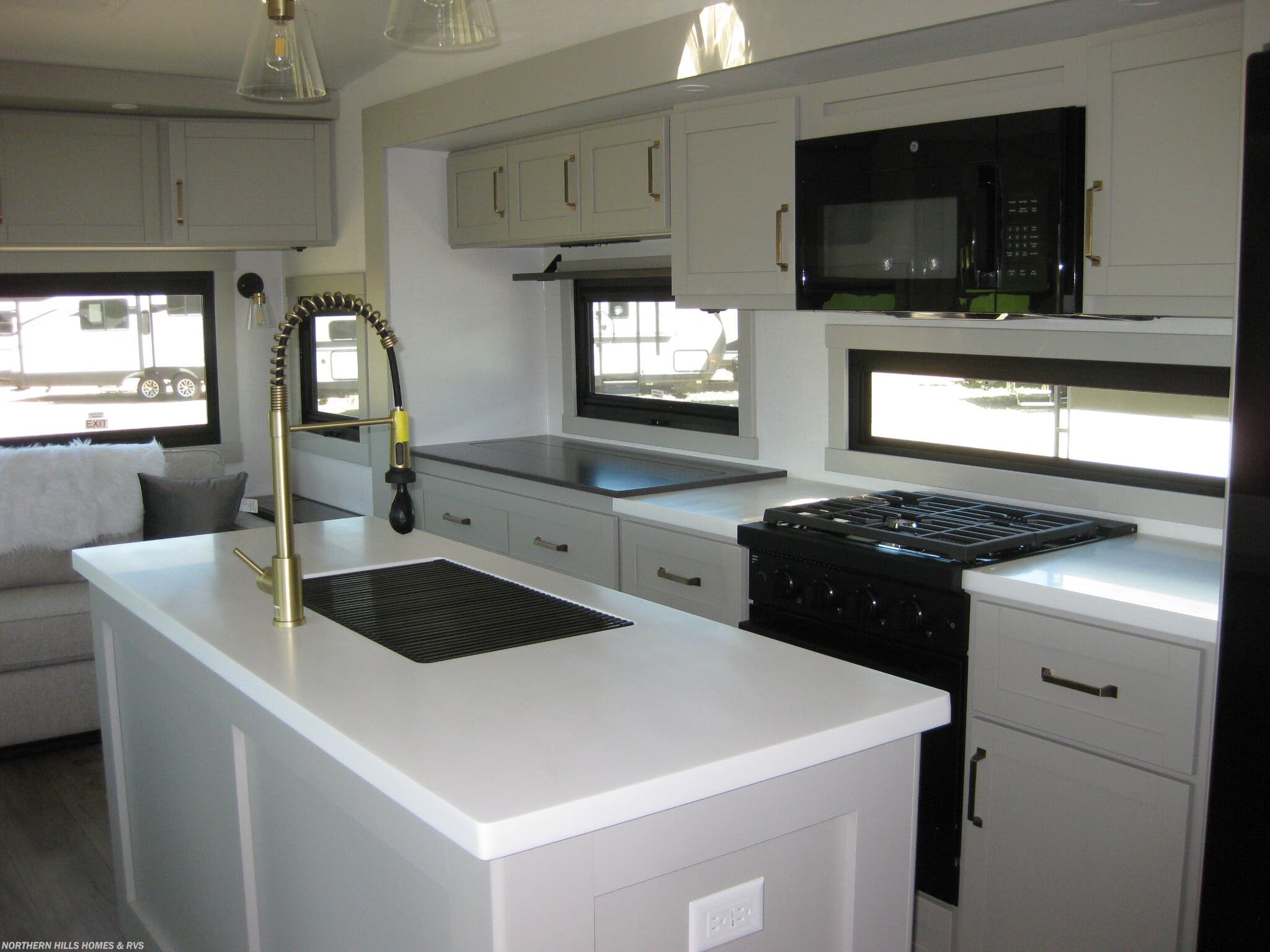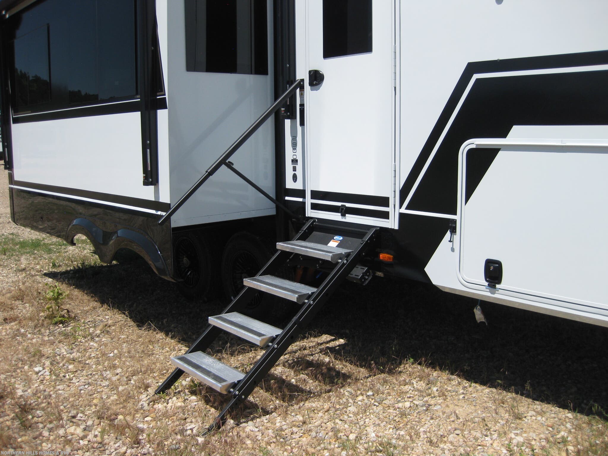 This fifth wheel RV is loaded with premium appliances and utilities, including a microwave, oven, refrigerator, and a stove top burner, ensuring you can prepare meals with ease. The interior climate is maintained by two powerful 31,500 BTU air conditioners and roof vents that promote optimal airflow. For added convenience, it includes a medicine cabinet, queen-sized bed, and full bathroom with a shower and toilet. The exterior boasts features like an awning, exterior speakers, external shower, and power roof vent, providing outdoor entertainment and relaxation options.