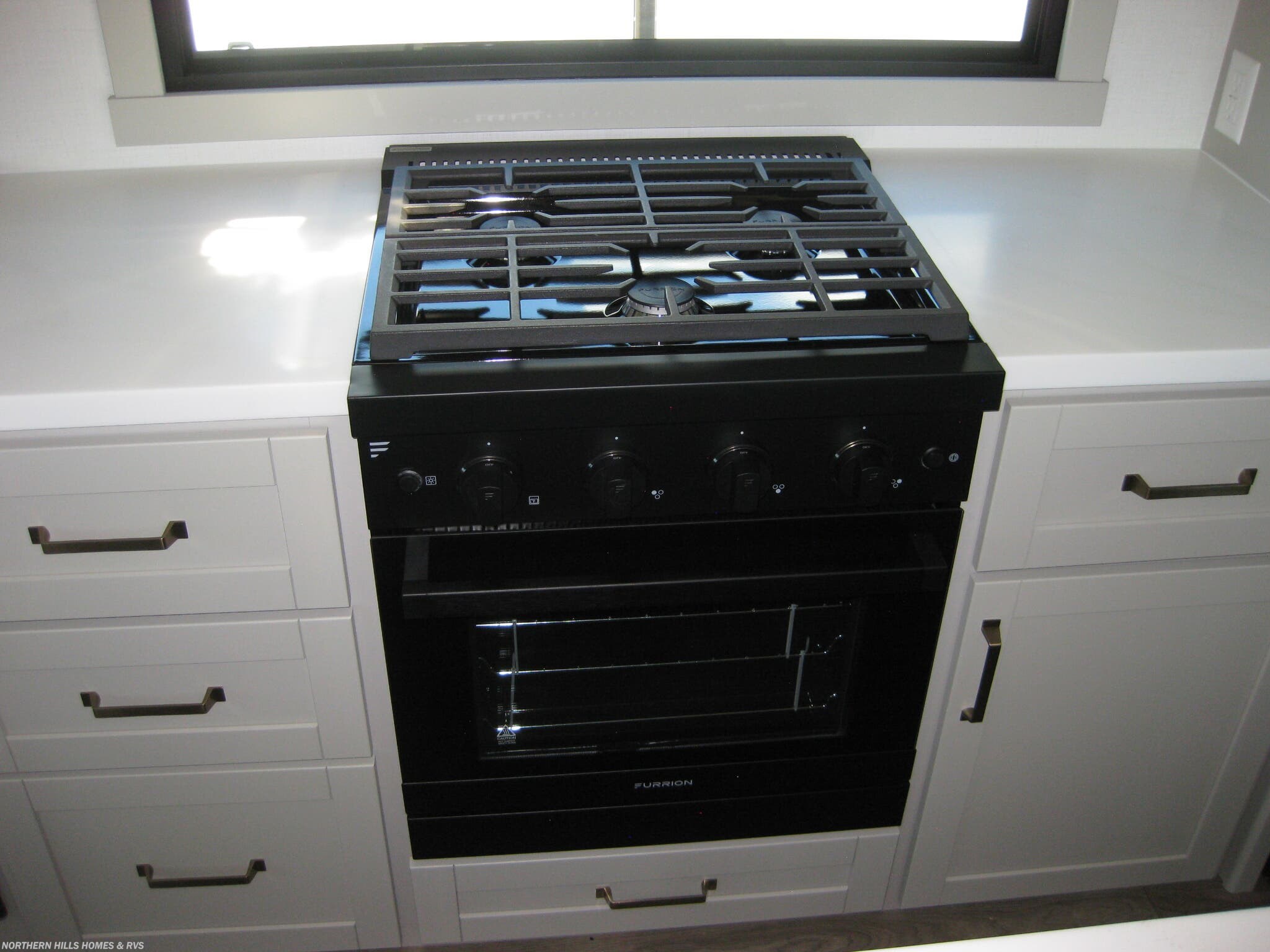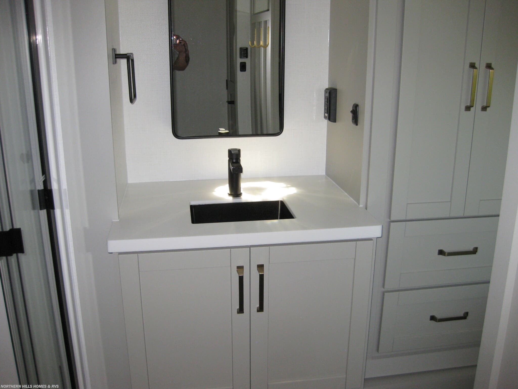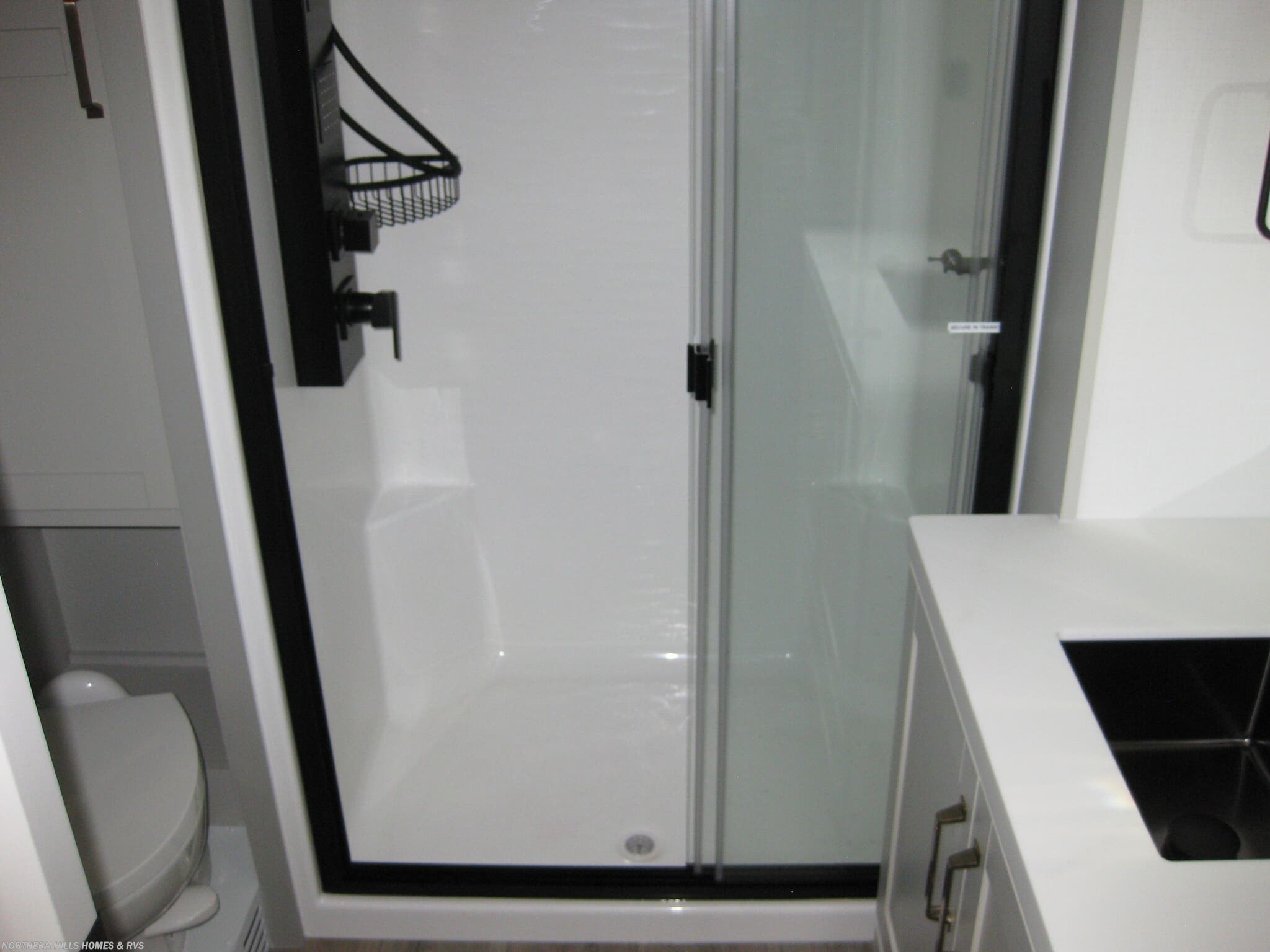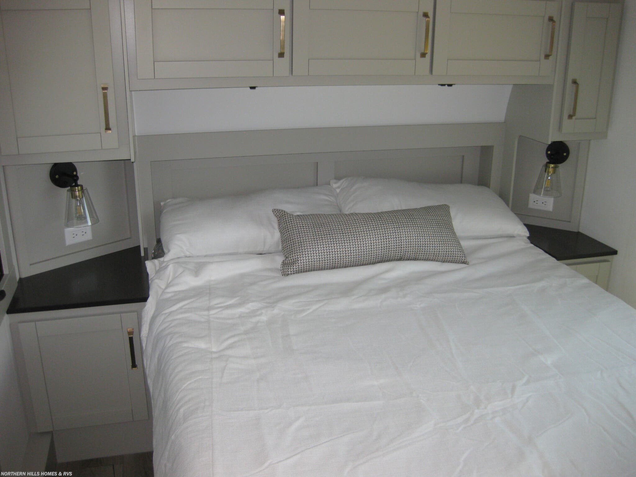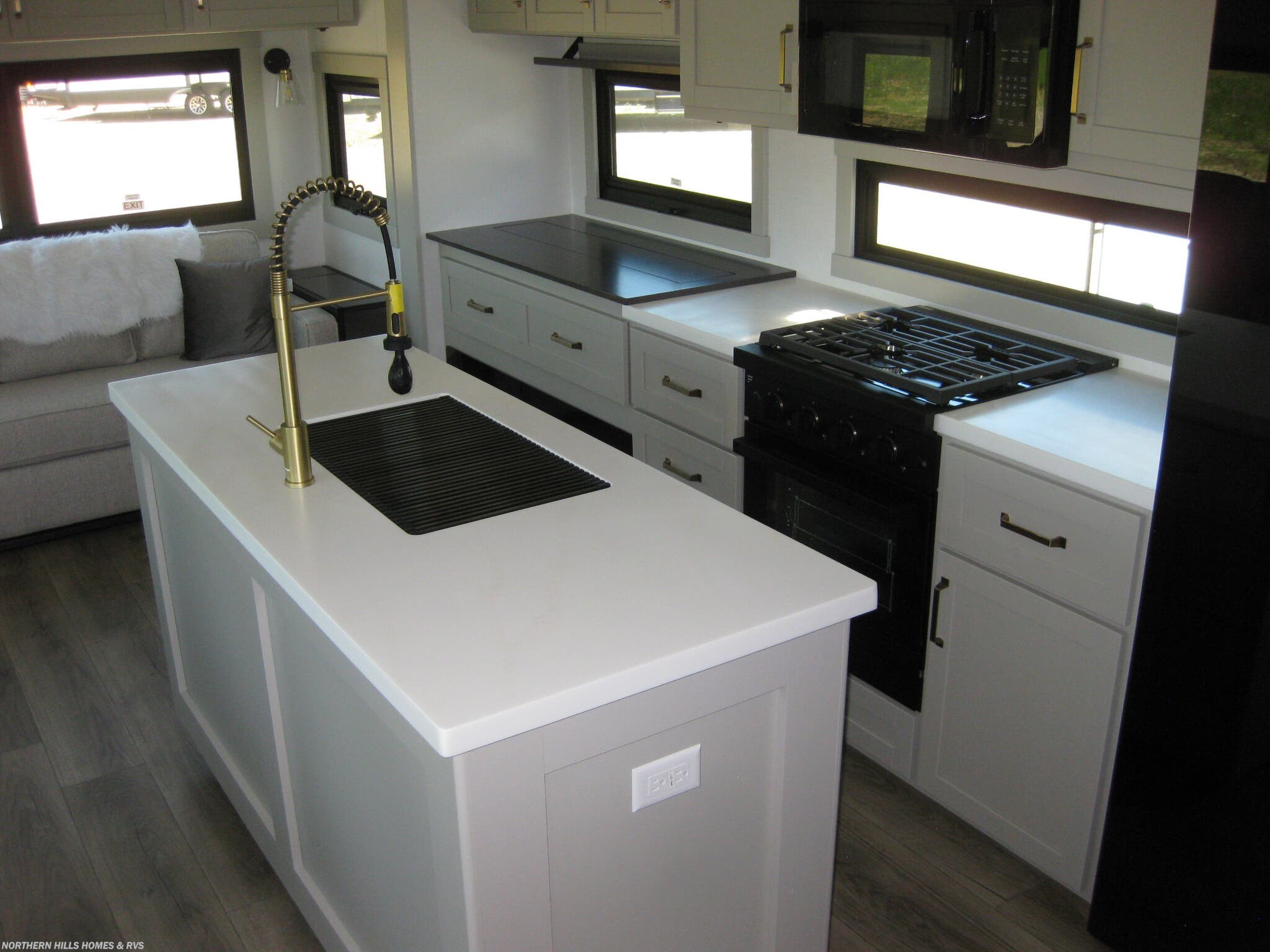This fifth wheel RV is loaded with premium appliances and utilities, including a microwave, oven, refrigerator, and a stove top burner, ensuring you can prepare meals with ease. The interior climate is maintained by two powerful 31,500 BTU air conditioners and roof vents that promote optimal airflow. For added convenience, it includes a medicine cabinet, queen-sized bed, and full bathroom with a shower and toilet. The exterior boasts features like an awning, exterior speakers, external shower, and power roof vent, providing outdoor entertainment and relaxation options.