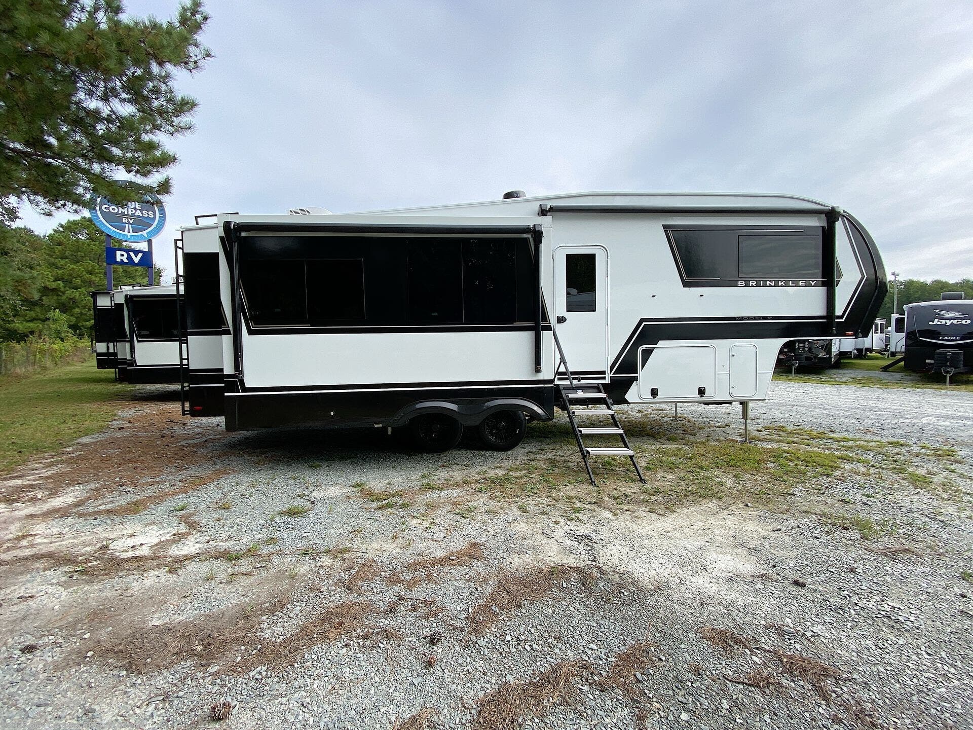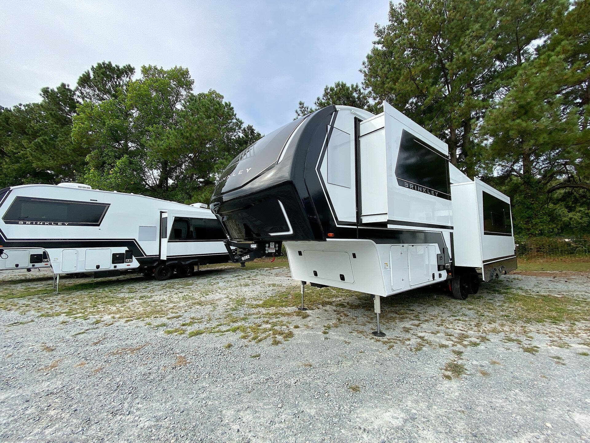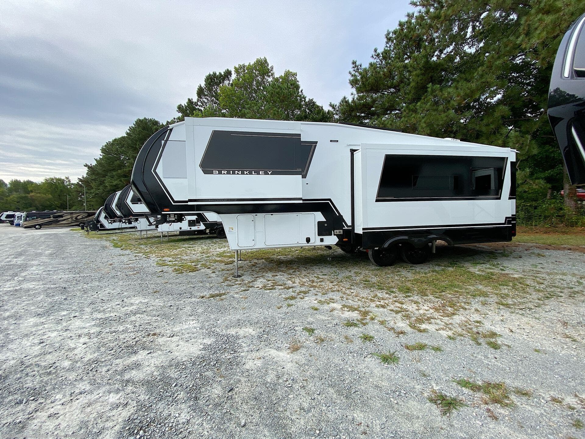 The Brinkley mid-profile Model Z fifth wheels bring you clean lines and an upscale look with plenty of style and exciting new features like the industry first brass plumbing connections. These units also feature an automotive grade front cap, plenty of exterior storage, dual exterior hot and cold showers, and wide stance leveling jacks for easy set up. Residential frameless windows provide a clean look and beautiful views, and ample electrical outlets and USB/USB-C outlets allow all of your electronics and appliances to easily be used and charged.