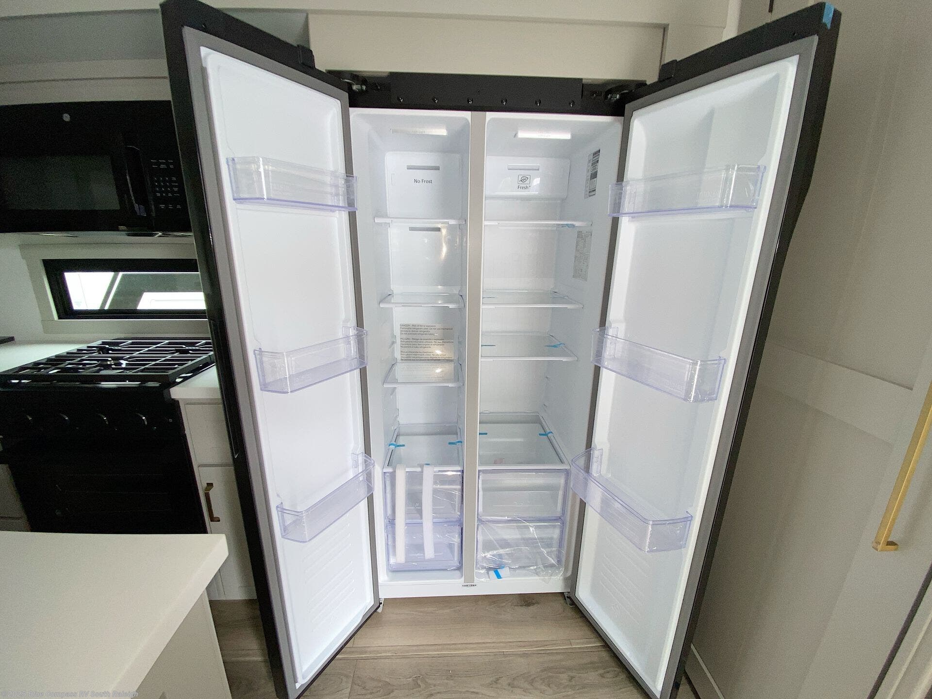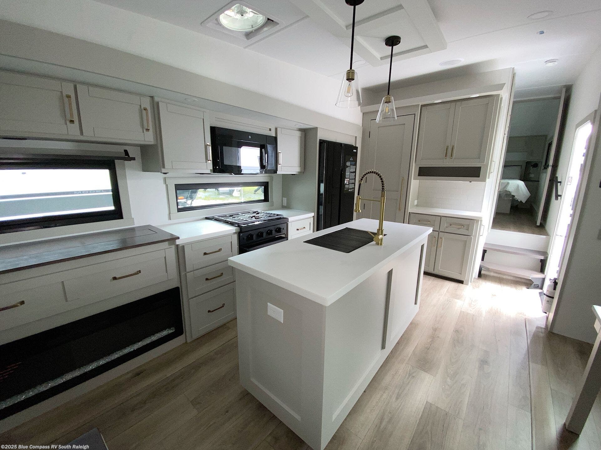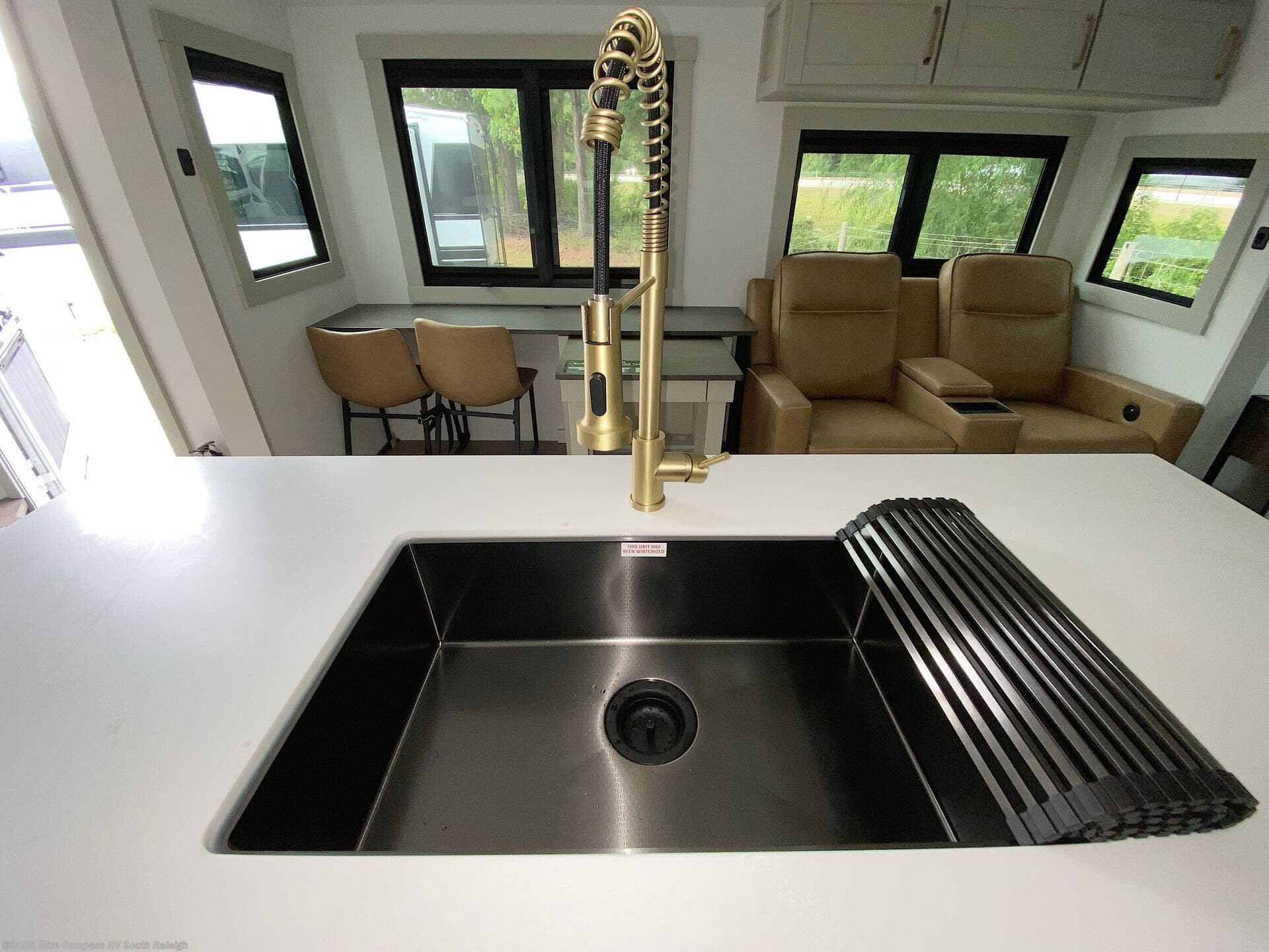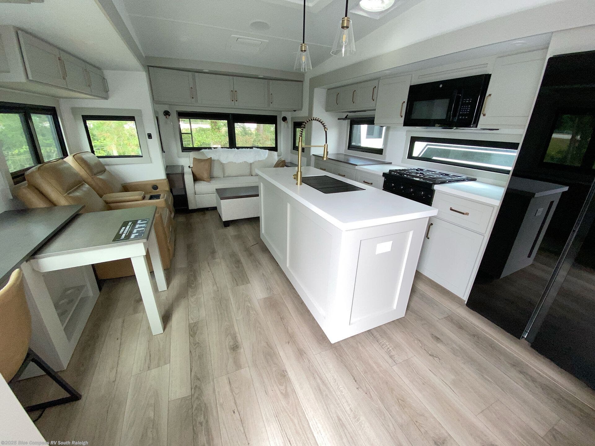 You're going to love every minute spent in this spacious fifth wheel that can sleep four. There is an inviting rear living area with a 72" tri-fold sofa and theater seating across from the televator and fireplace. The chef of your group can whip up dinner on the three burner cooktop or in the 30" residential microwave, and there is a 16 cu. ft. refrigerator that even opens when with the slide out is in. You will also enjoy the kitchen island with a farmhouse sink and roller cover, dual trash bins with a Stow N' Go paper towel holder, plus convenient dog bowls for your furry friends. You can store all your paper goods and snacks in the 84" pantry with adjustable shelving, and there is a hutch for nice dishes plus shoe storage in this model as well. Head to the front master bedroom where you'll find a queen bed with a TV, a large slide out with a wardrobe with drawers, plus a spacious bath.
