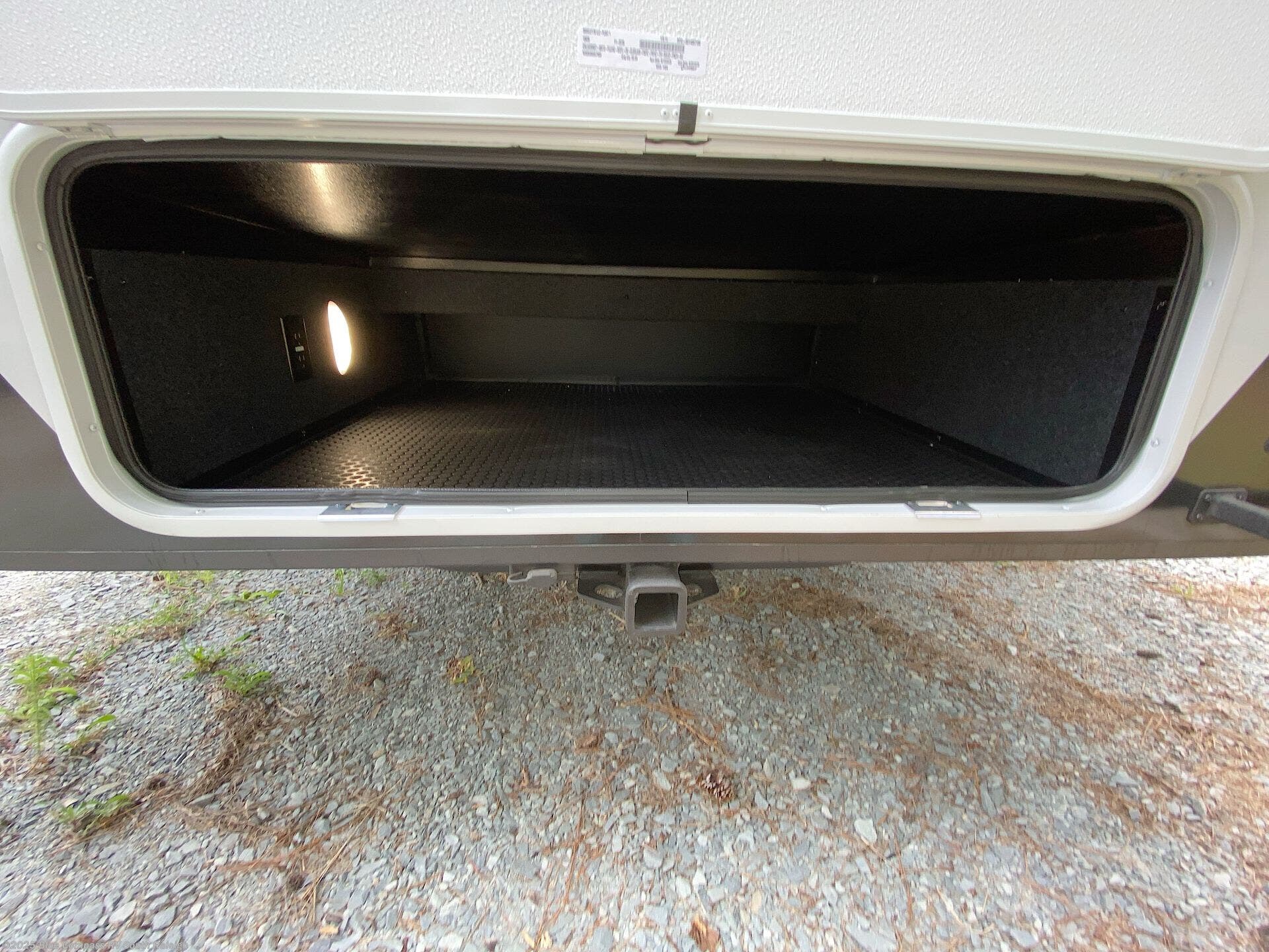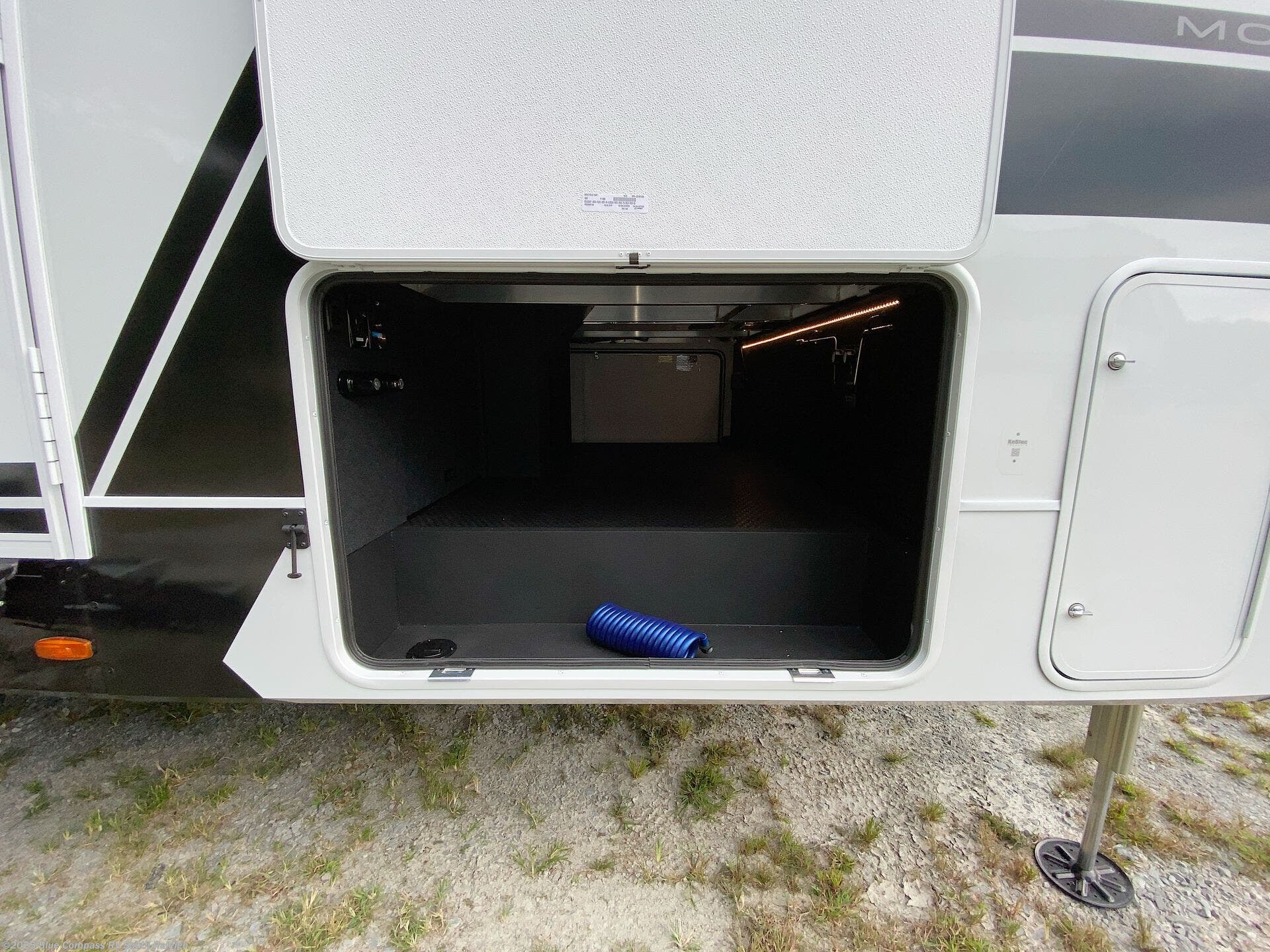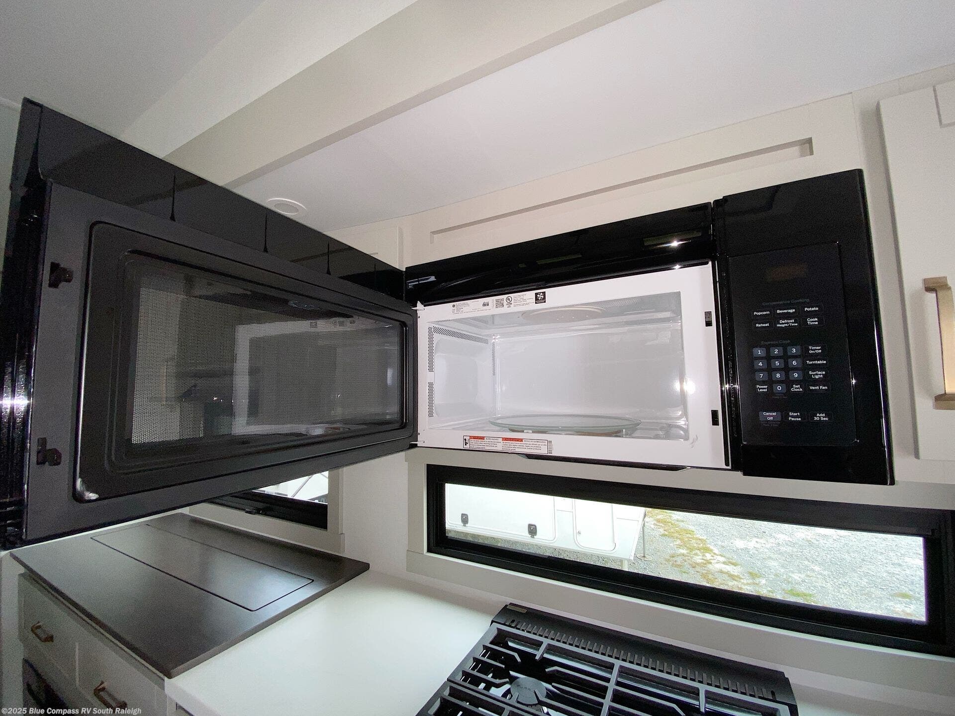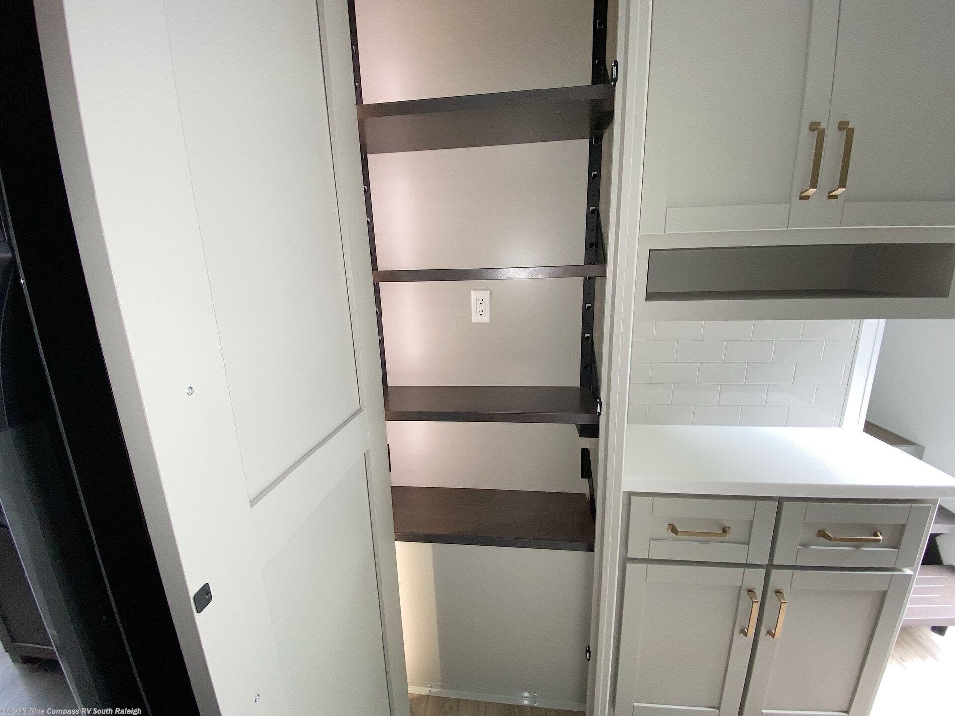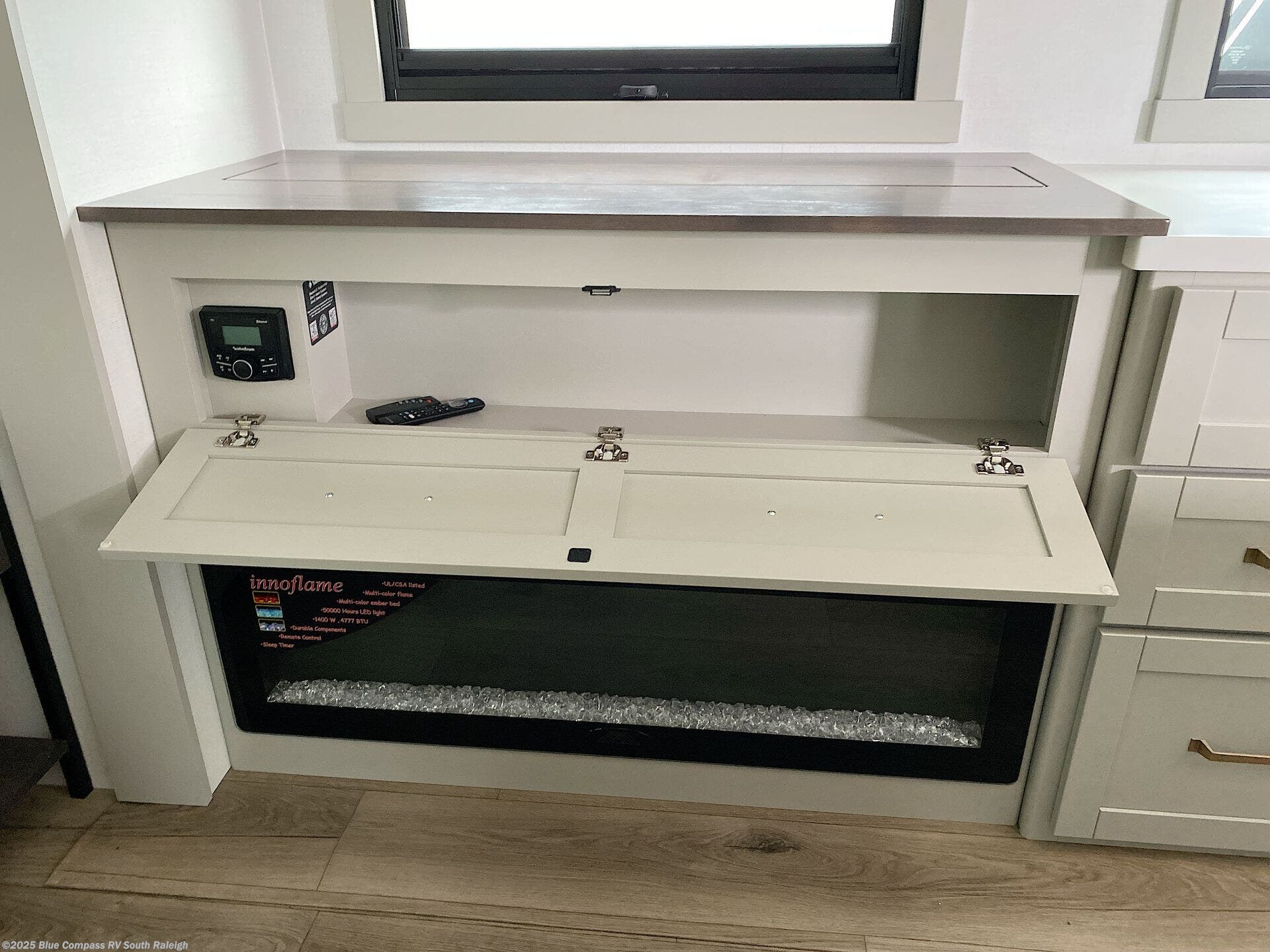 You're going to love every minute spent in this spacious fifth wheel that can sleep four. There is an inviting rear living area with a 72" tri-fold sofa and theater seating across from the televator and fireplace. The chef of your group can whip up dinner on the three burner cooktop or in the 30" residential microwave, and there is a 16 cu. ft. refrigerator that even opens when with the slide out is in. You will also enjoy the kitchen island with a farmhouse sink and roller cover, dual trash bins with a Stow N' Go paper towel holder, plus convenient dog bowls for your furry friends. You can store all your paper goods and snacks in the 84" pantry with adjustable shelving, and there is a hutch for nice dishes plus shoe storage in this model as well. Head to the front master bedroom where you'll find a queen bed with a TV, a large slide out with a wardrobe with drawers, plus a spacious bath.