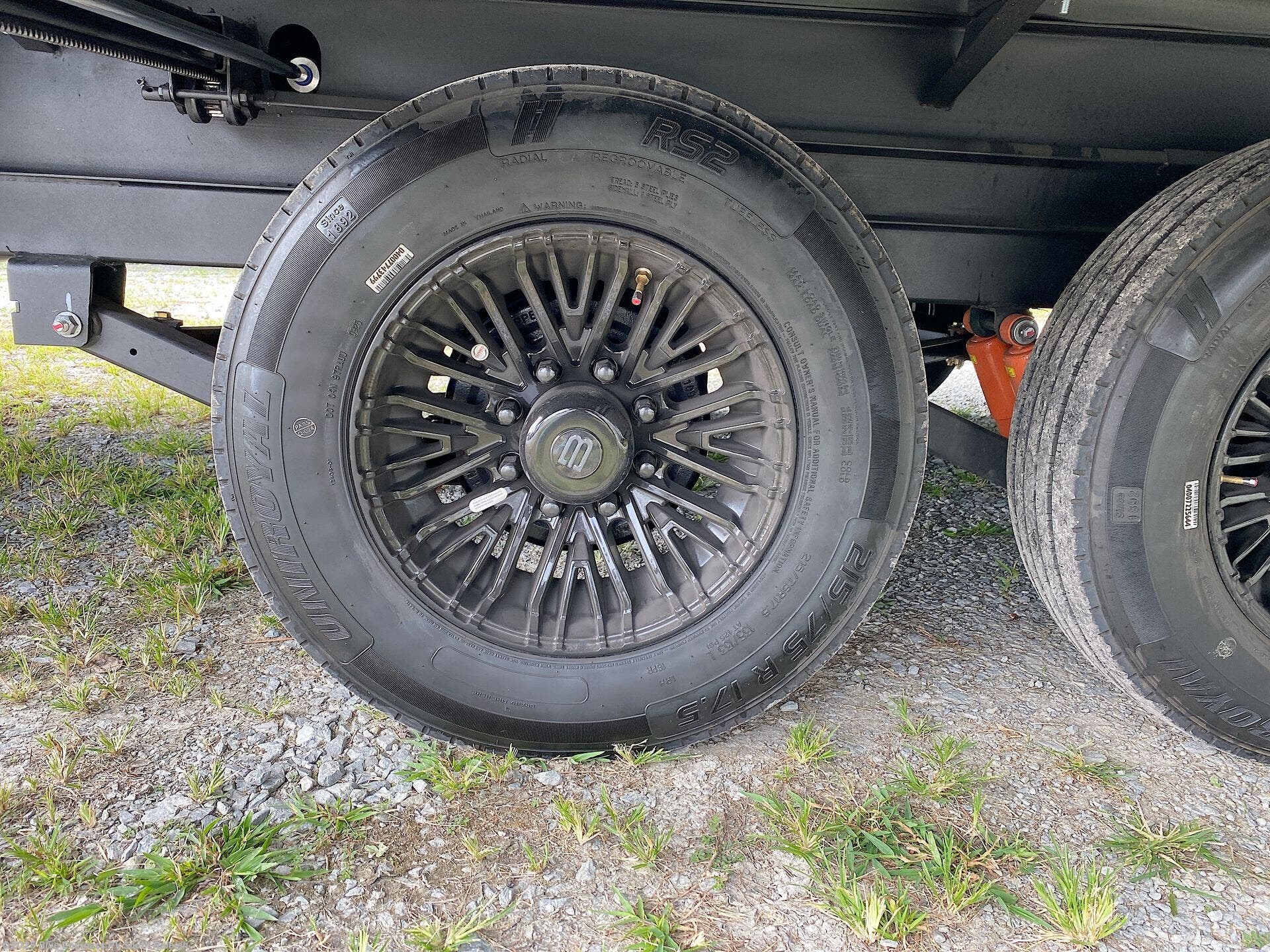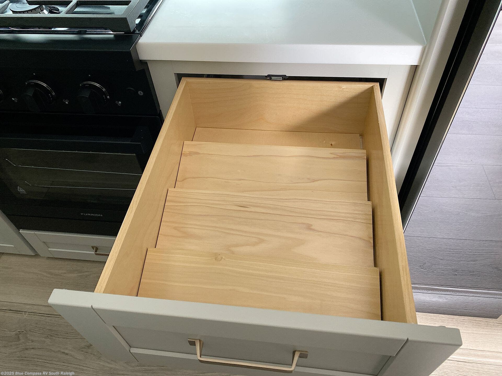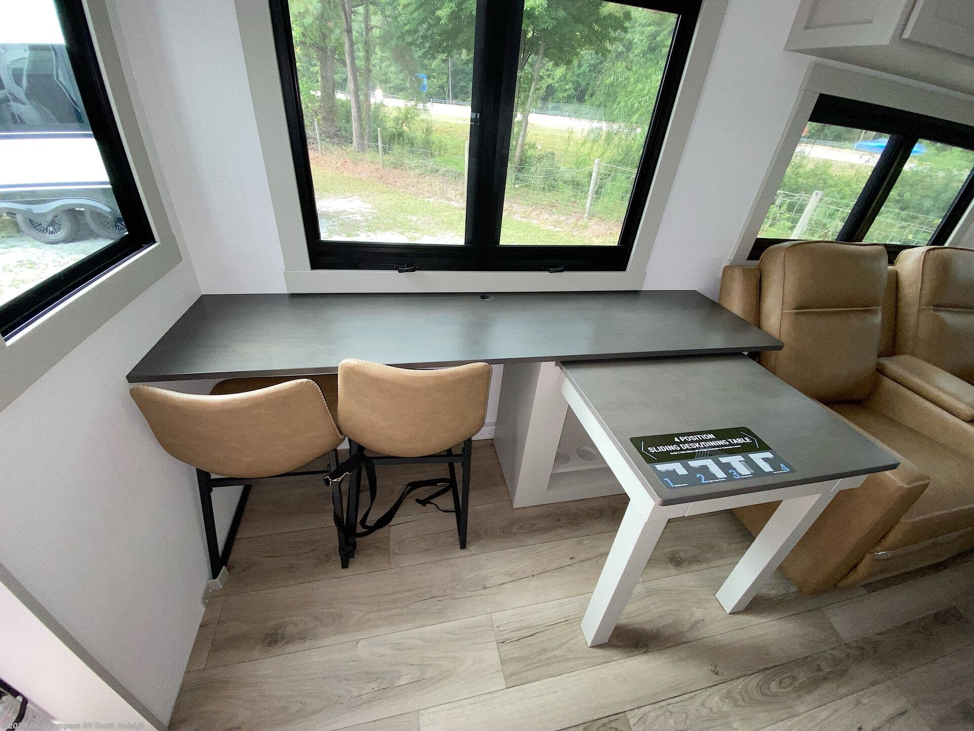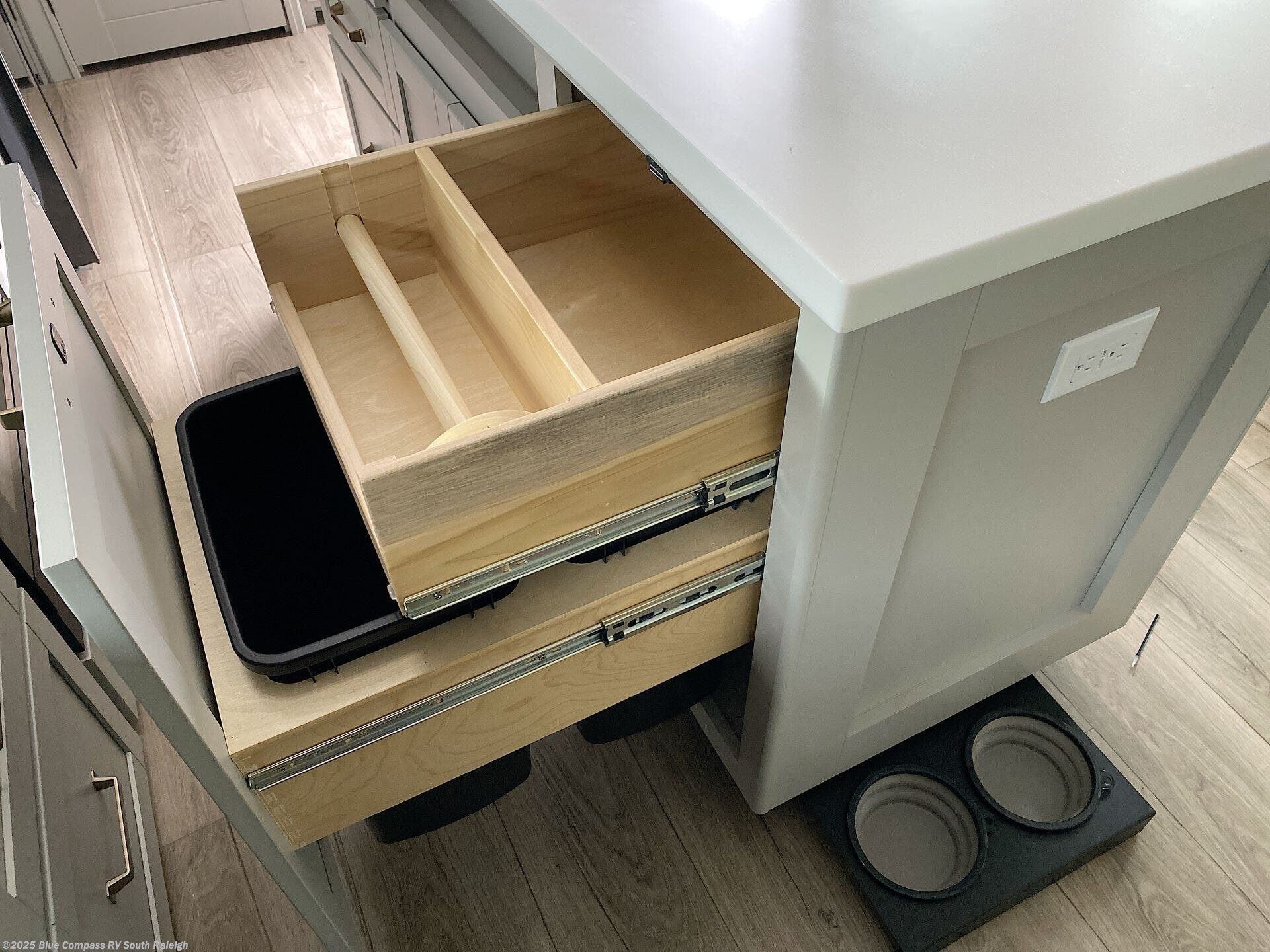 You're going to love every minute spent in this spacious fifth wheel that can sleep four. There is an inviting rear living area with a 72" tri-fold sofa and theater seating across from the televator and fireplace. The chef of your group can whip up dinner on the three burner cooktop or in the 30" residential microwave, and there is a 16 cu. ft. refrigerator that even opens when with the slide out is in. You will also enjoy the kitchen island with a farmhouse sink and roller cover, dual trash bins with a Stow N' Go paper towel holder, plus convenient dog bowls for your furry friends. You can store all your paper goods and snacks in the 84" pantry with adjustable shelving, and there is a hutch for nice dishes plus shoe storage in this model as well. Head to the front master bedroom where you'll find a queen bed with a TV, a large slide out with a wardrobe with drawers, plus a spacious bath.