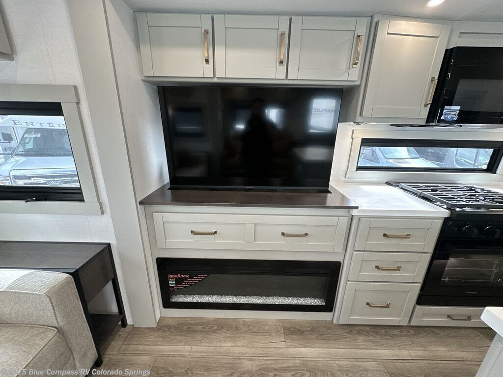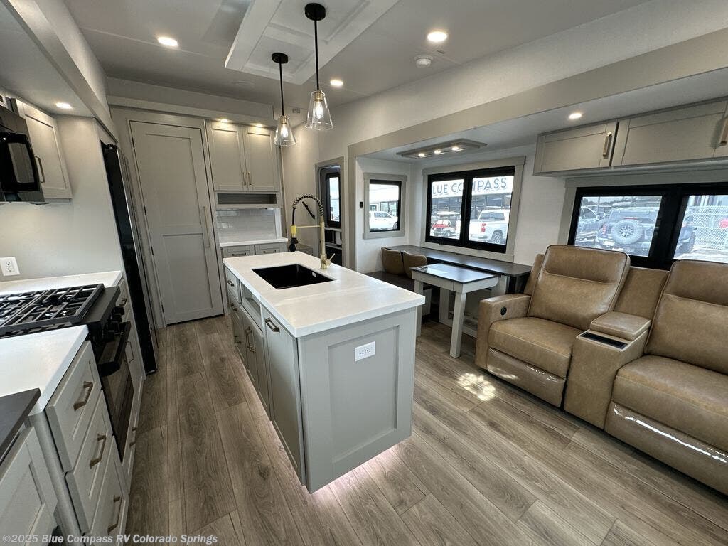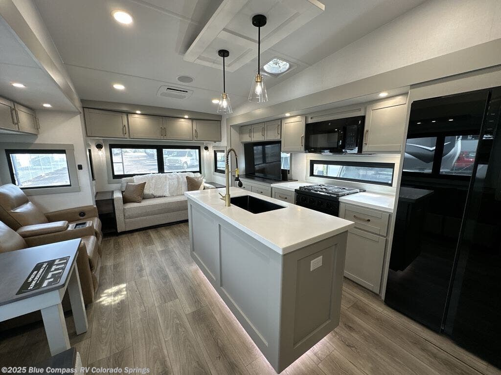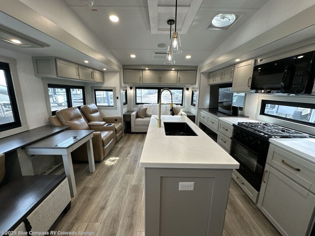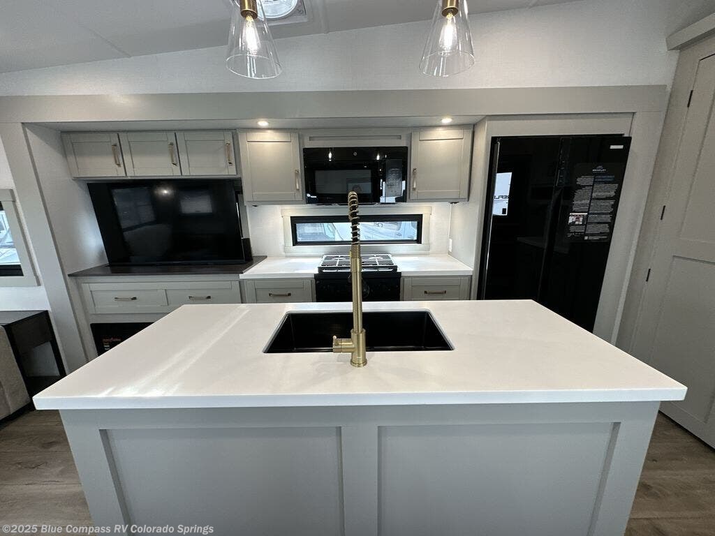 You're going to love every minute spent in this spacious fifth wheel that can sleep four. There is an inviting rear living area with a 72" tri-fold sofa and theater seating across from the televator and fireplace. The chef of your group can whip up dinner on the three burner cooktop or in the 30" residential microwave, and there is a 16 cu. ft. refrigerator that even opens when with the slide out is in. You will also enjoy the kitchen island with a farmhouse sink and roller cover, dual trash bins with a Stow N' Go paper towel holder, plus convenient dog bowls for your furry friends. You can store all your paper goods and snacks in the 84" pantry with adjustable shelving, and there is a hutch for nice dishes plus shoe storage in this model as well. Head to the front master bedroom where you'll find a queen bed with a TV, a large slide out with a wardrobe with drawers, plus a spacious bath.